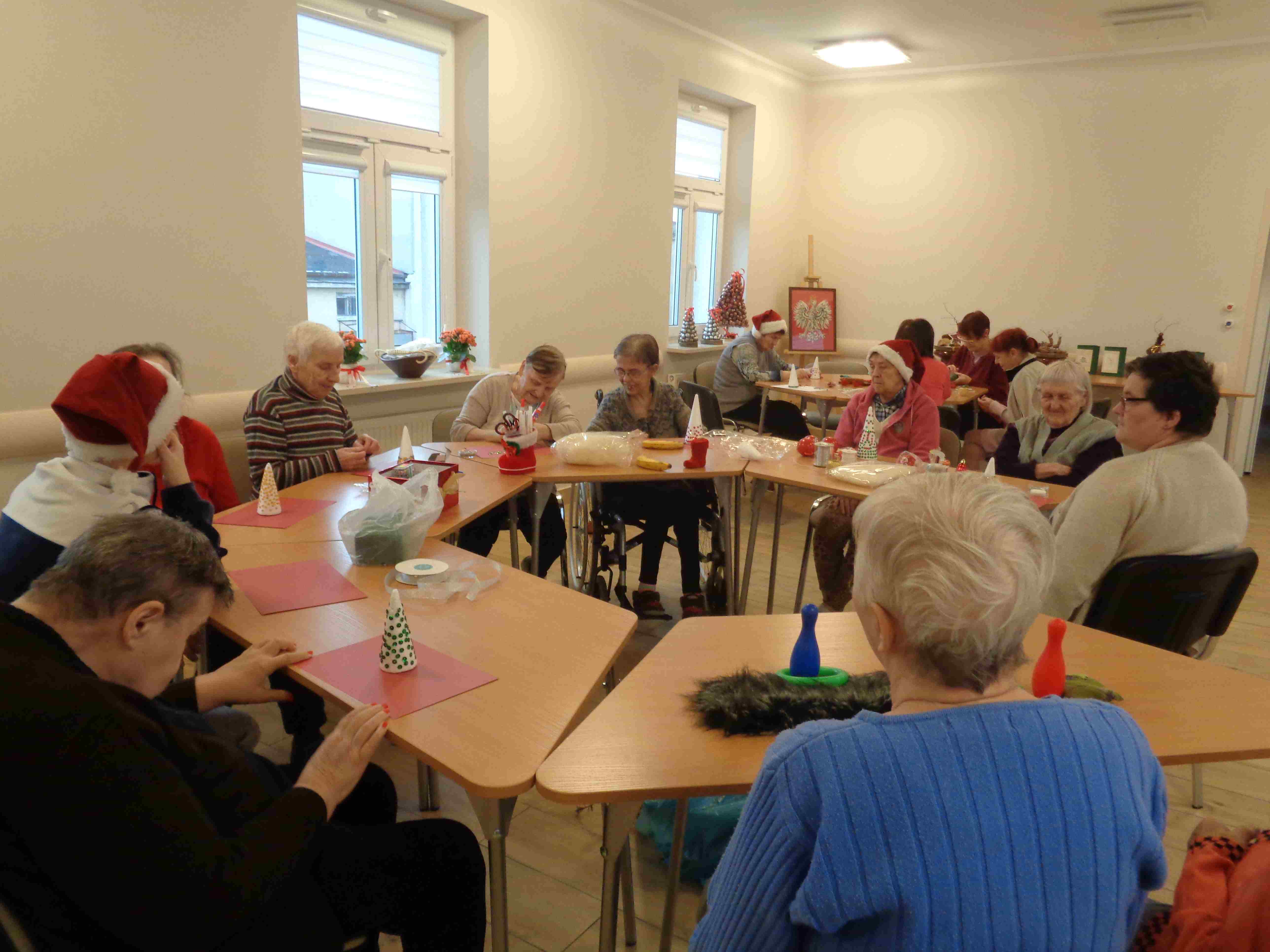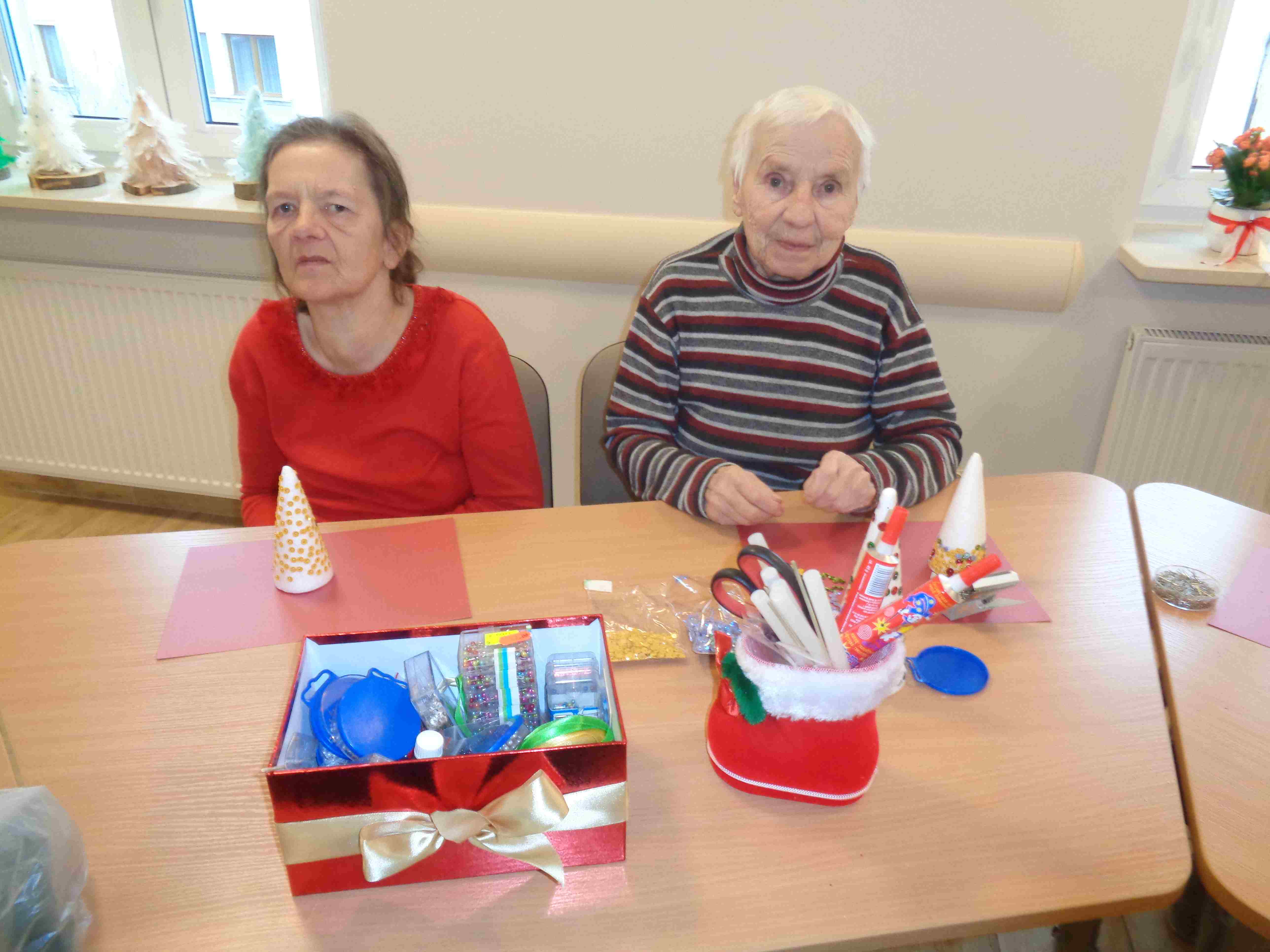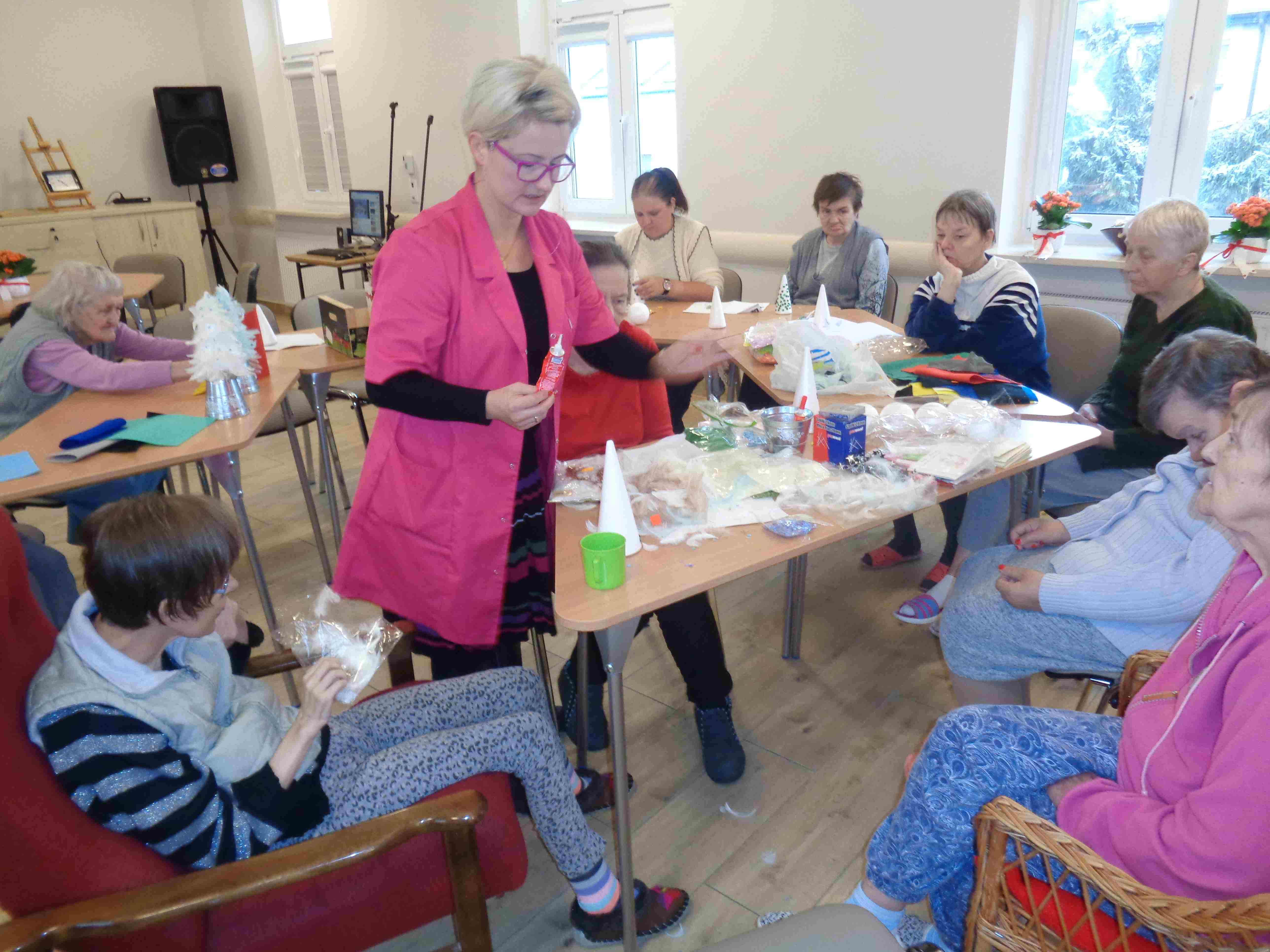 Mieszkanki w ramach terapii zajęciowej przygotowują różne świąteczne ozdoby i dekoracje, m.in. renifery z szyszek, choinki, np. z piór lub cekinów i bałwana z plastikowych kubków.