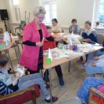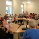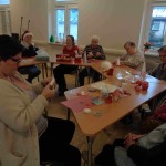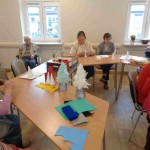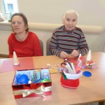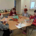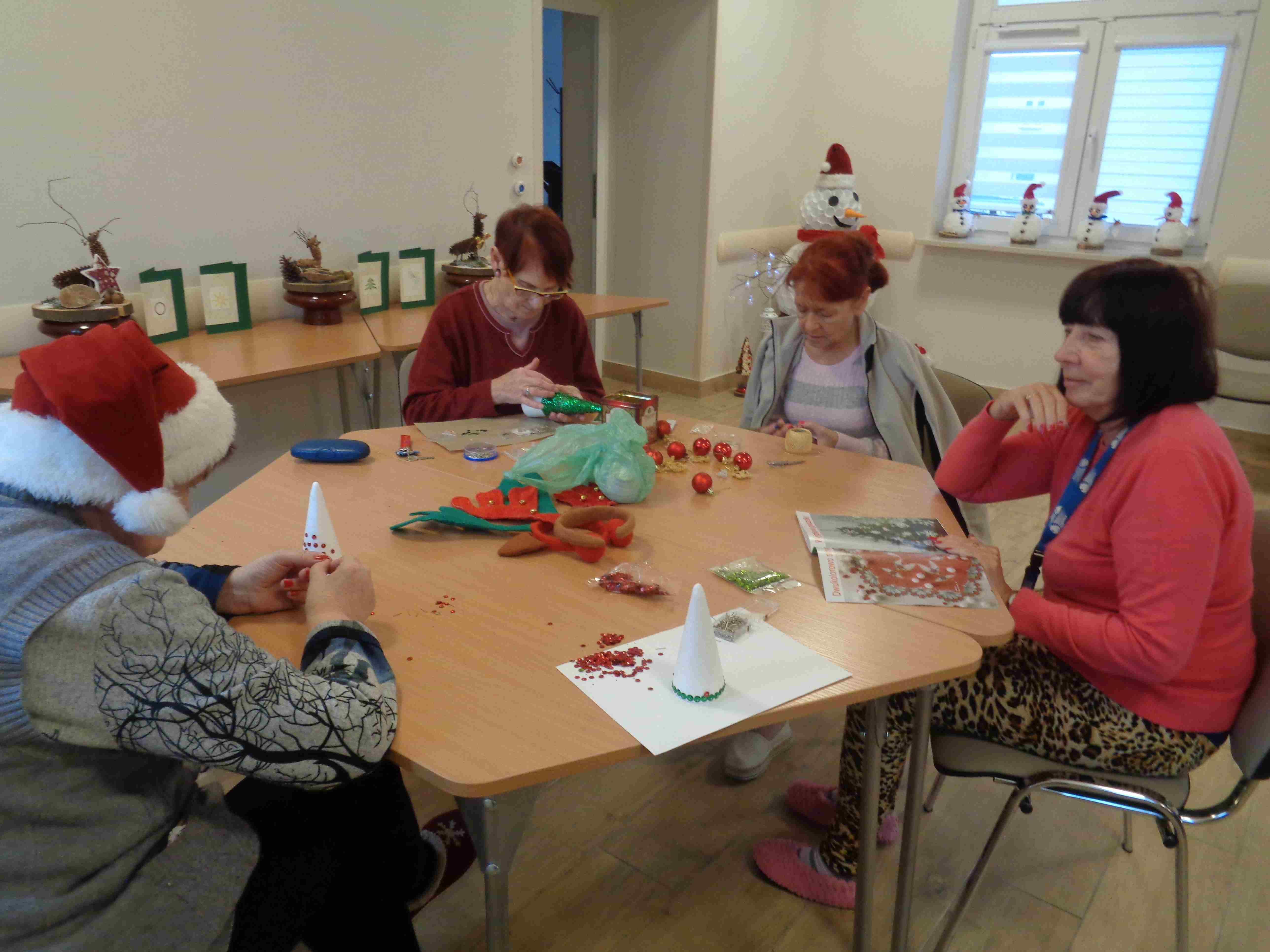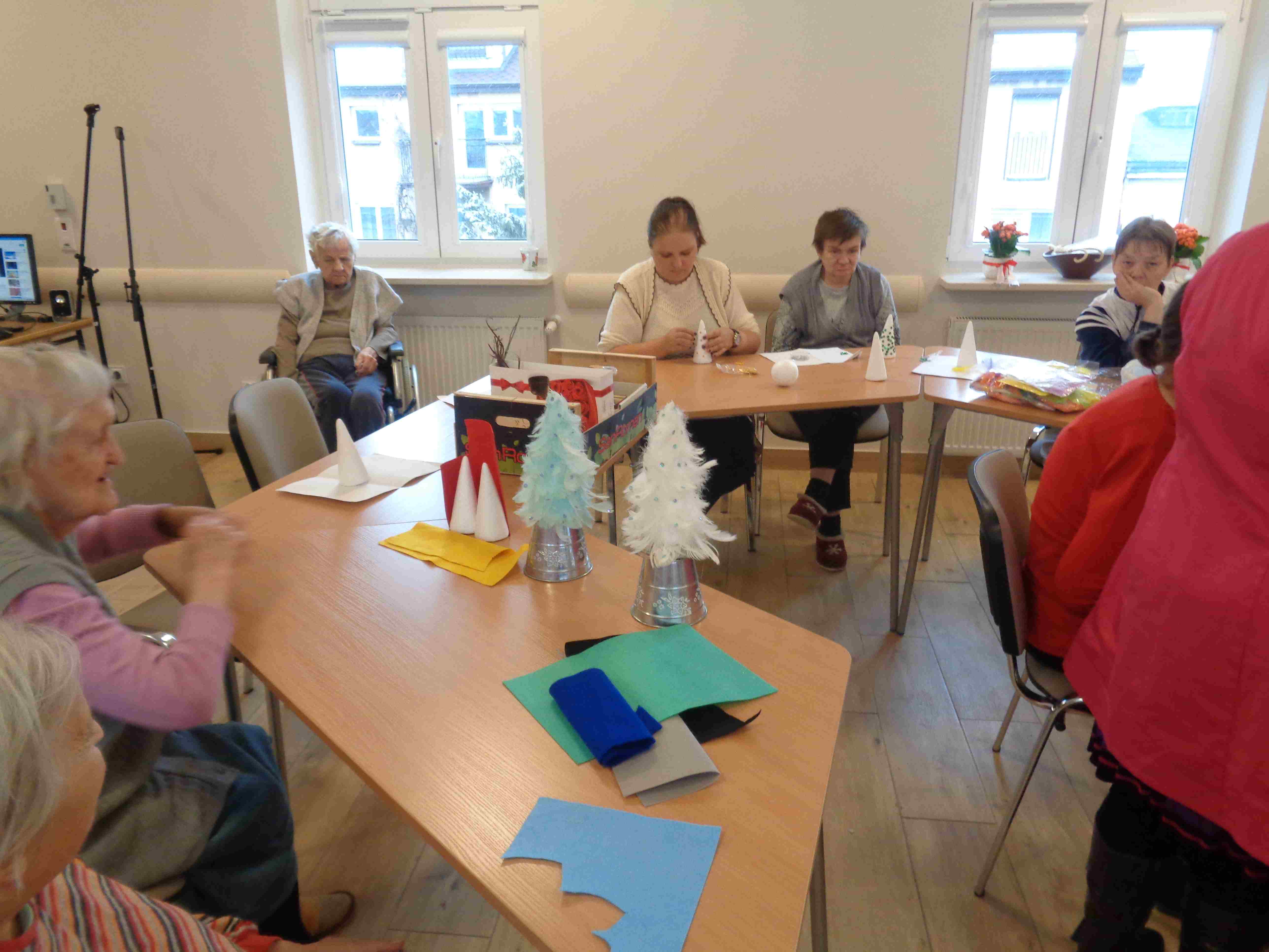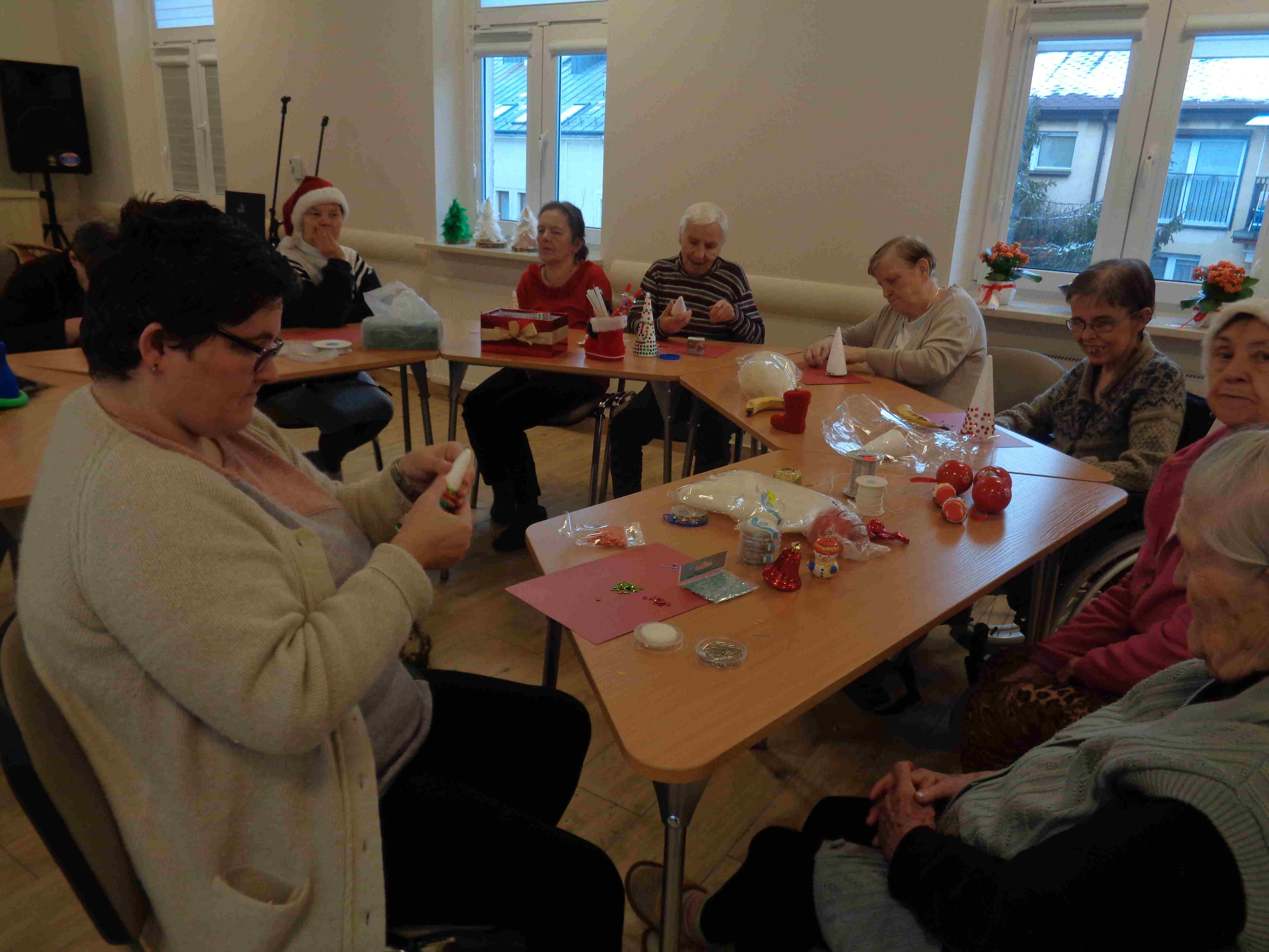 Mieszkanki w ramach terapii zajęciowej przygotowują różne świąteczne ozdoby i dekoracje, m.in. renifery z szyszek, choinki, np. z piór lub cekinów i bałwana z plastikowych kubków.