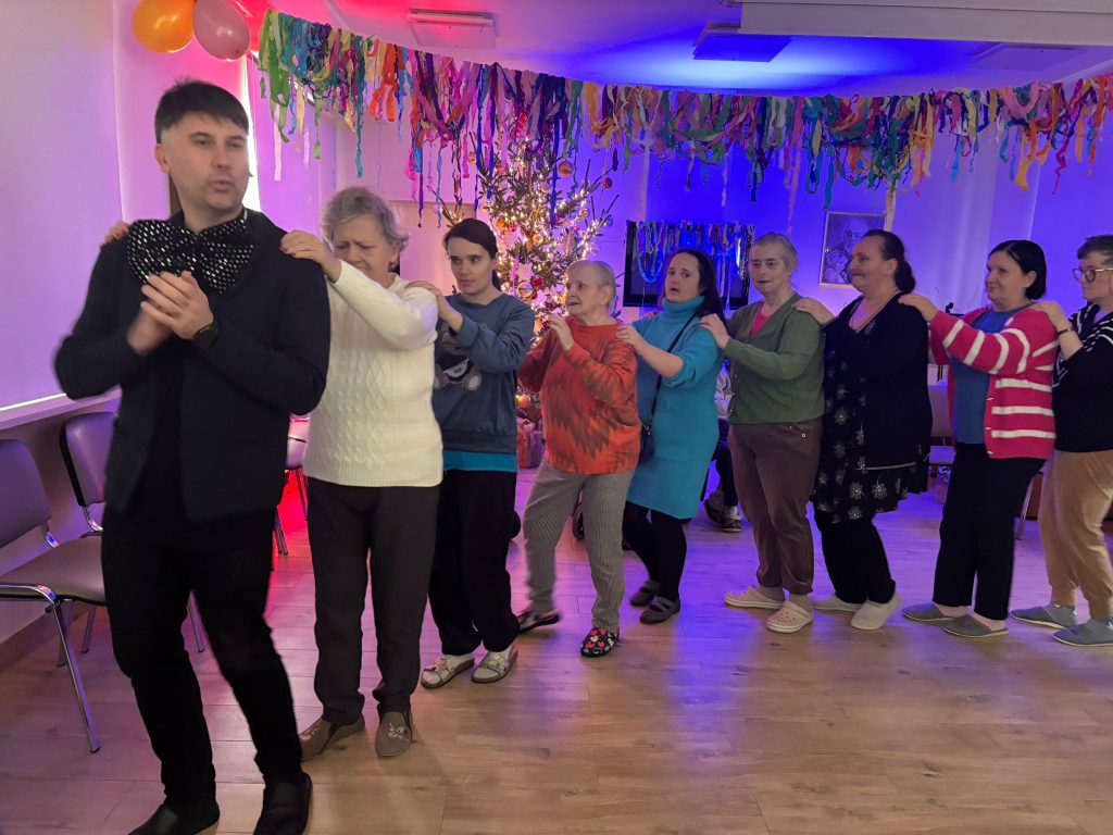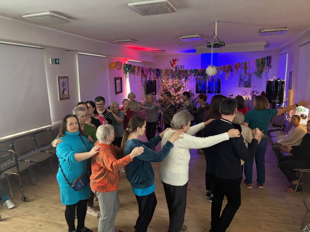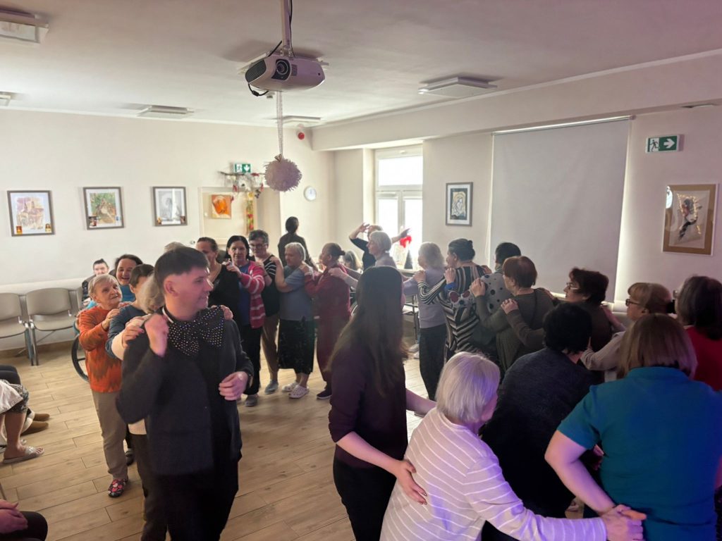W Domu Pomocy Społecznej odbyła się radosna zabawa taneczna, która dostarczyła mieszkankom wielu pozytywnych emocji i niezapomnianych chwil. Przy dźwiękach znanych i lubianych melodii panie chętnie wychodziły na parkiet, tańczyły, klaskały i wspólnie śpiewały. Spotkanie miało wyjątkowy charakter, ponieważ rolę wodzireja pełnił ksiądz Sebastian Lewczuk – kapelan Naszego Domu, który z dużym zaangażowaniem i poczuciem humoru prowadził całe wydarzenie.