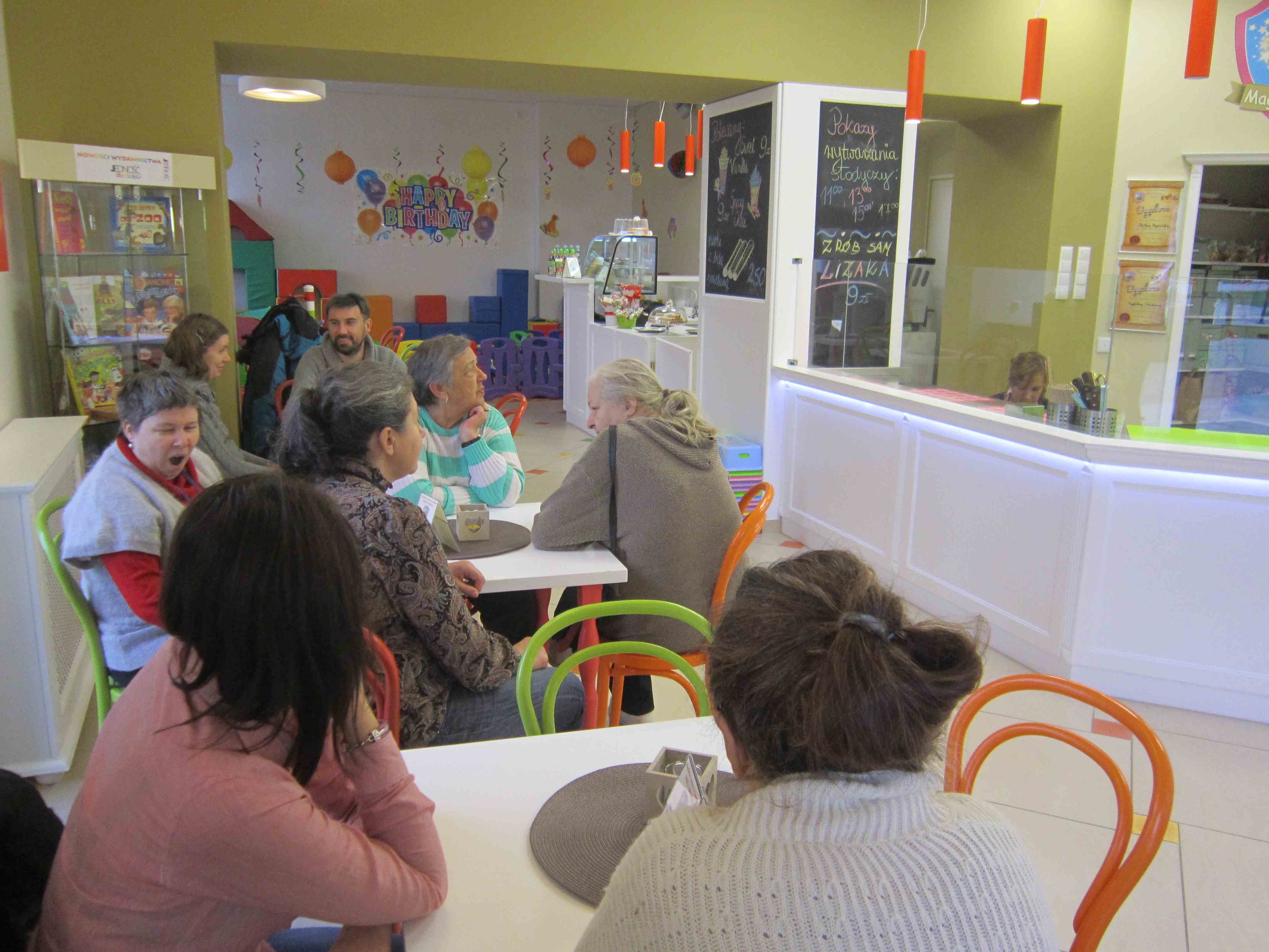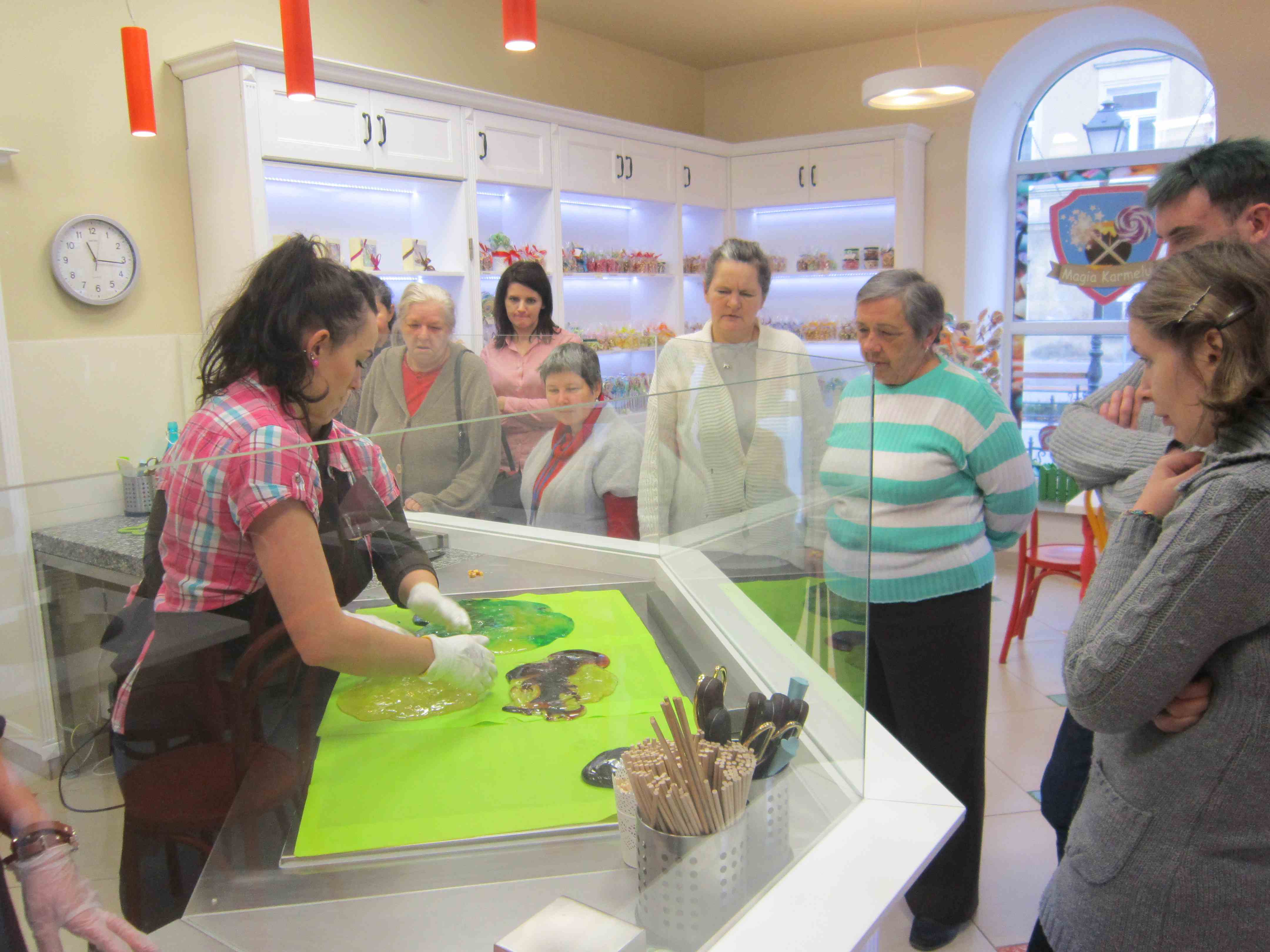 W dn. 21 listopada odwiedziliśmy pierwszą w Kielcach Manufakturę Słodyczy i kawiarnię „Magia Karmelu”. Mieszkanki uczestniczyły w pokazie ręcznie wytwarzanych karmelków, po którym próbowały gorących jeszcze słodyczy o smaku arbuzowym. Pracownice kawiarni opowiadały jak powstają karmelki i jaki jest ich skład – przy produkcji wykorzystywane są tylko naturalne barwniki i glukoza. Mieszkanki z zainteresowaniem słuchały, dopytywały o szczegóły i przyglądały się produkcji.