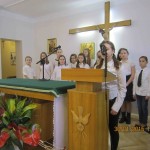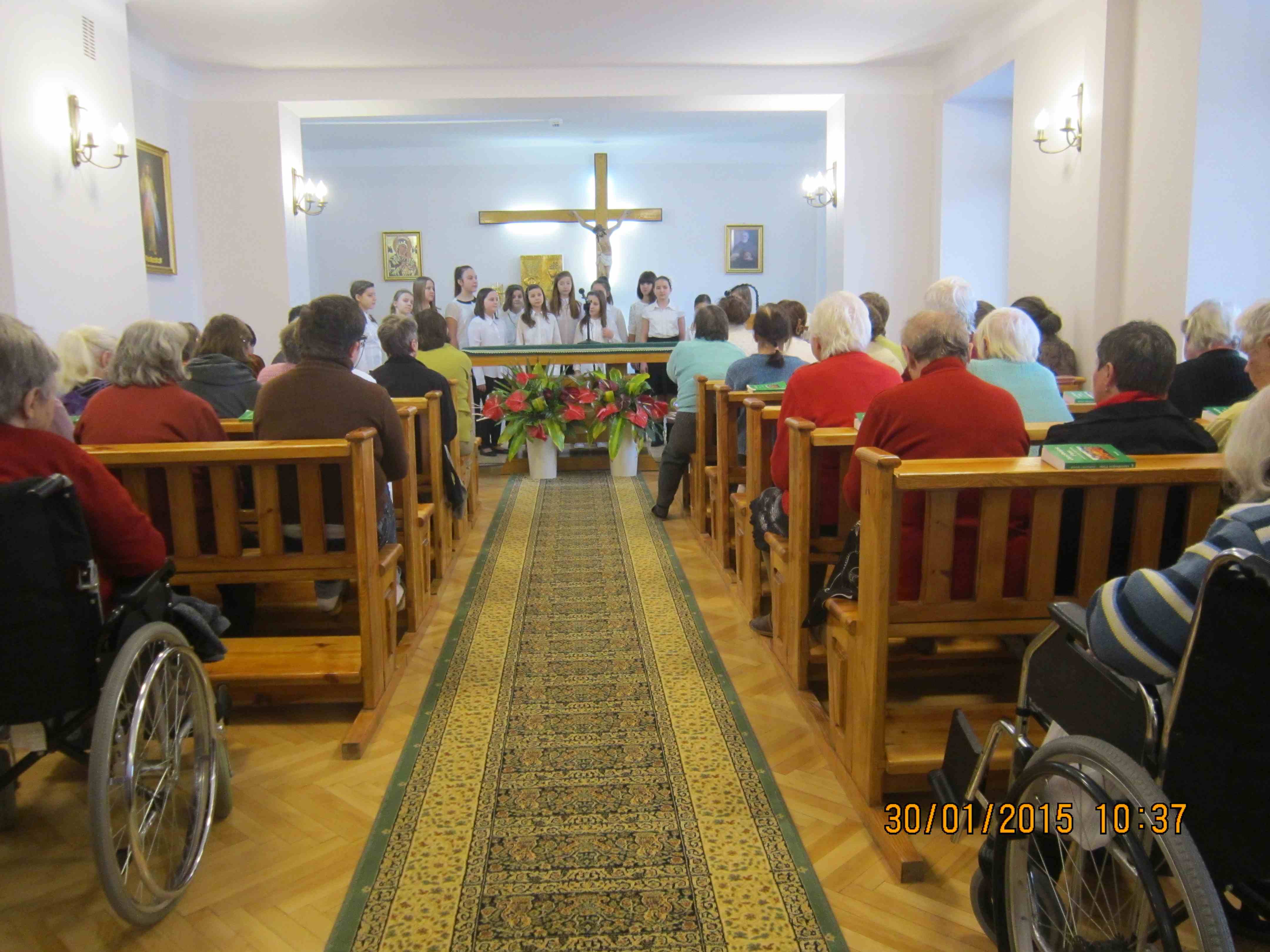 Zaprosiliśmy do naszego Domu młodzież z Zespołu Wokalnego „Dwudziestka Piątka”, przybyłą w licznej 15-osobowej grupie. Wokalistki, pod kierunkiem opiekuna grupy – Pani Katarzyny Kotarskiej – przygotowały piękny, świąteczny repertuar. Zespół zaprezentował się naszym mieszkankom w kaplicy, dzięki czemu mogliśmy wykorzystać radiowęzeł i „transmitować” koncert do wszystkich pokoi! Program artystyczny miał zatem wyjątkowo wielu odbiorców! Raz jeszcze dziękujemy zdolnej młodzieży i liczymy na kolejne występy!