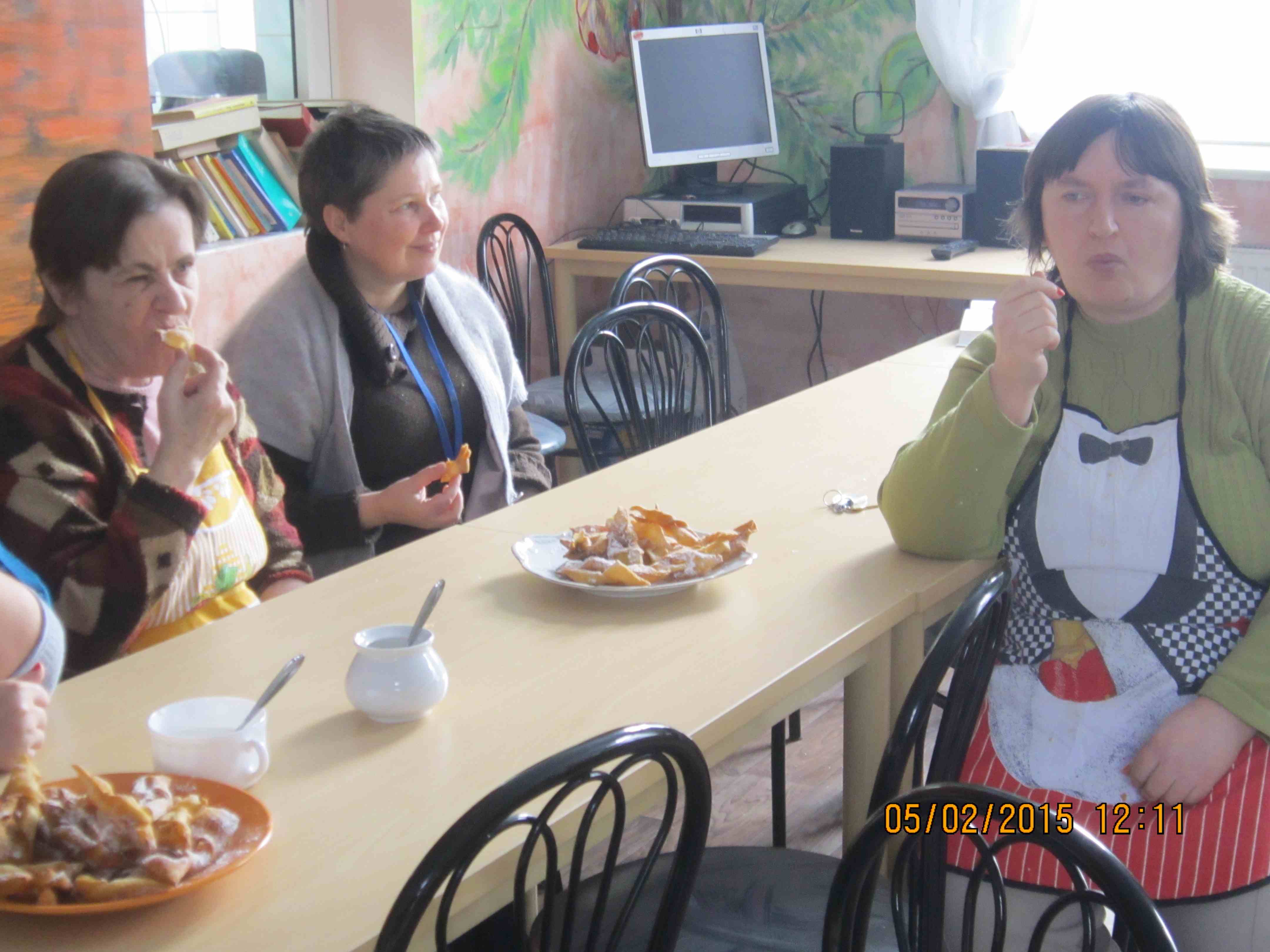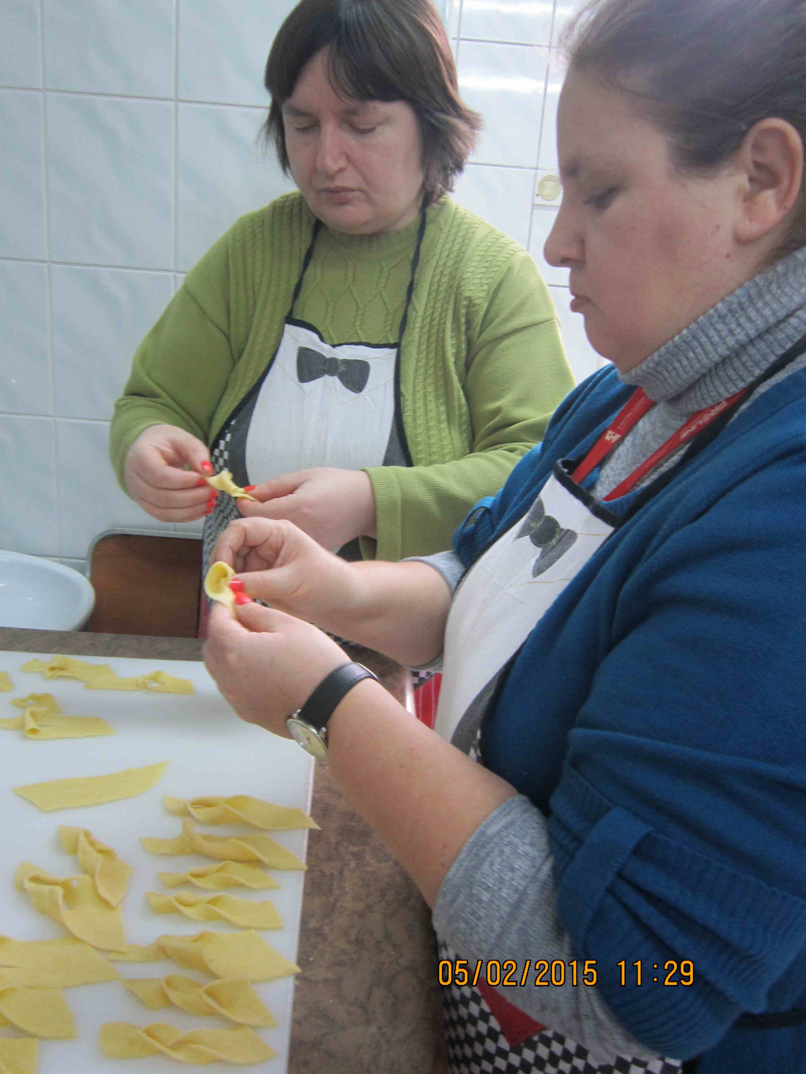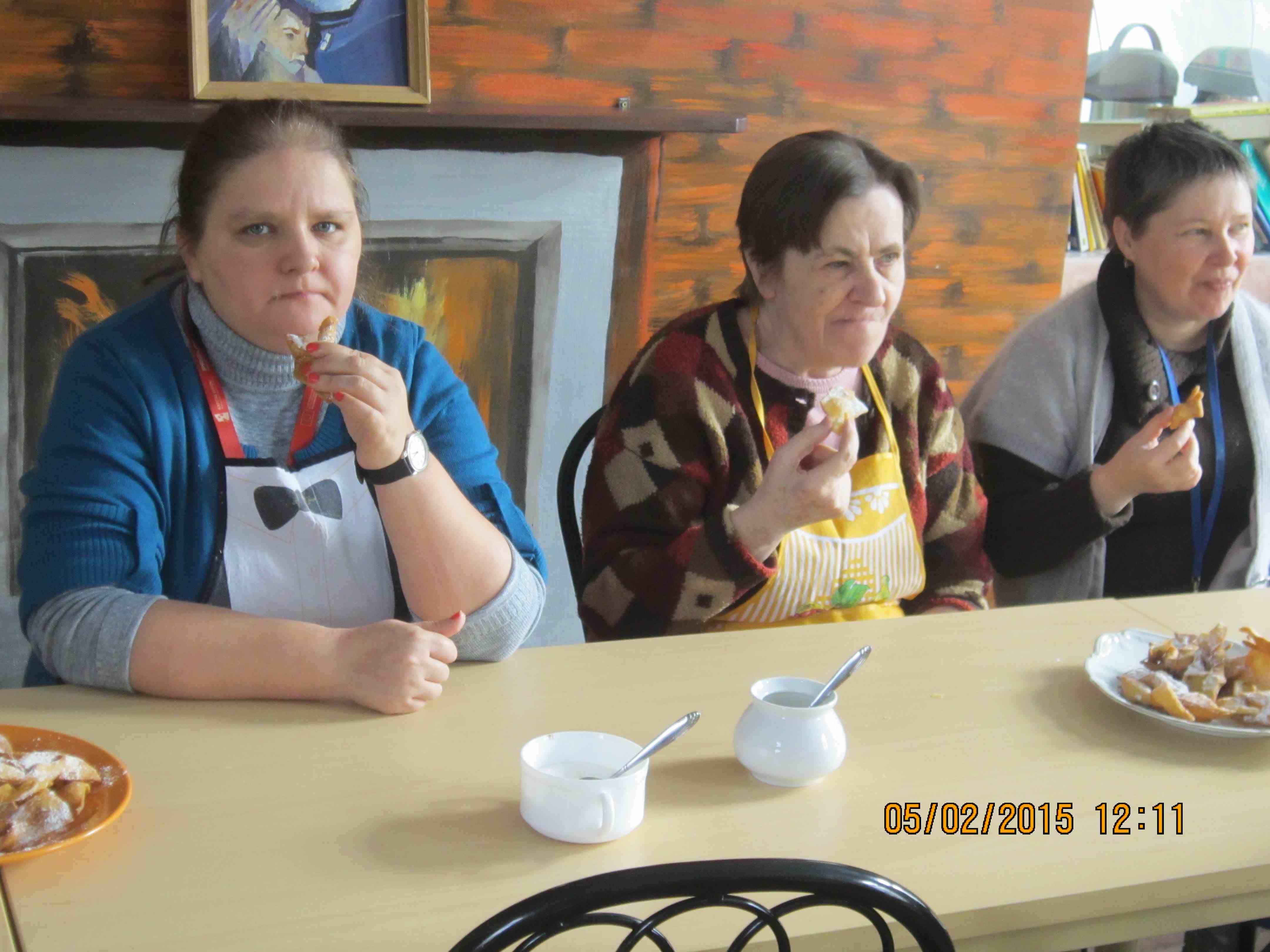 Na zajęciach kulinarnych rozpoczęliśmy przygotowania do Tłustego Czwartku – już tydzień wcześniej! Mieszkanki przygotowywały pyszne faworki. Wspólnie gotujemy lub pieczemy regularnie co dwa tygodnie.