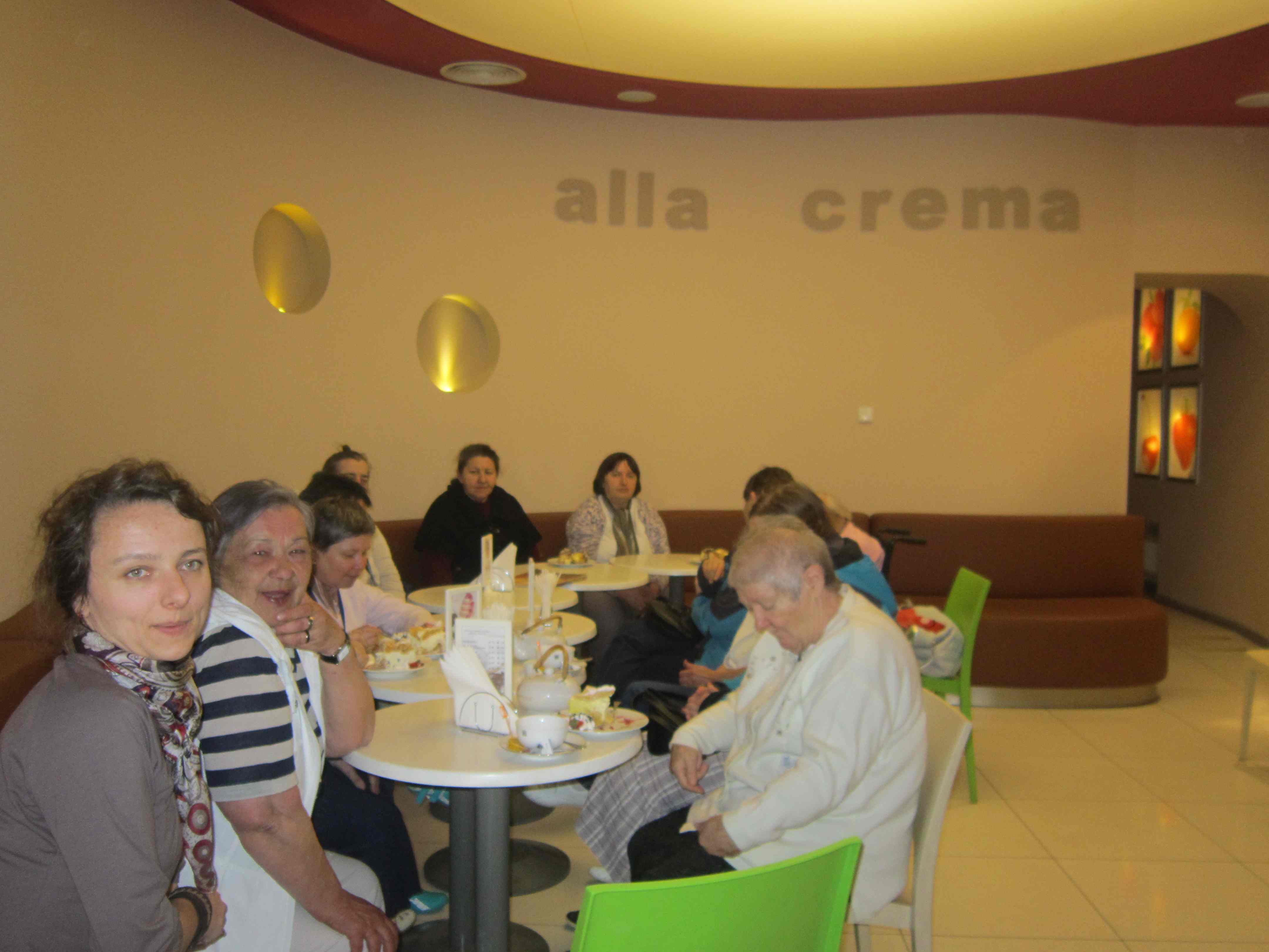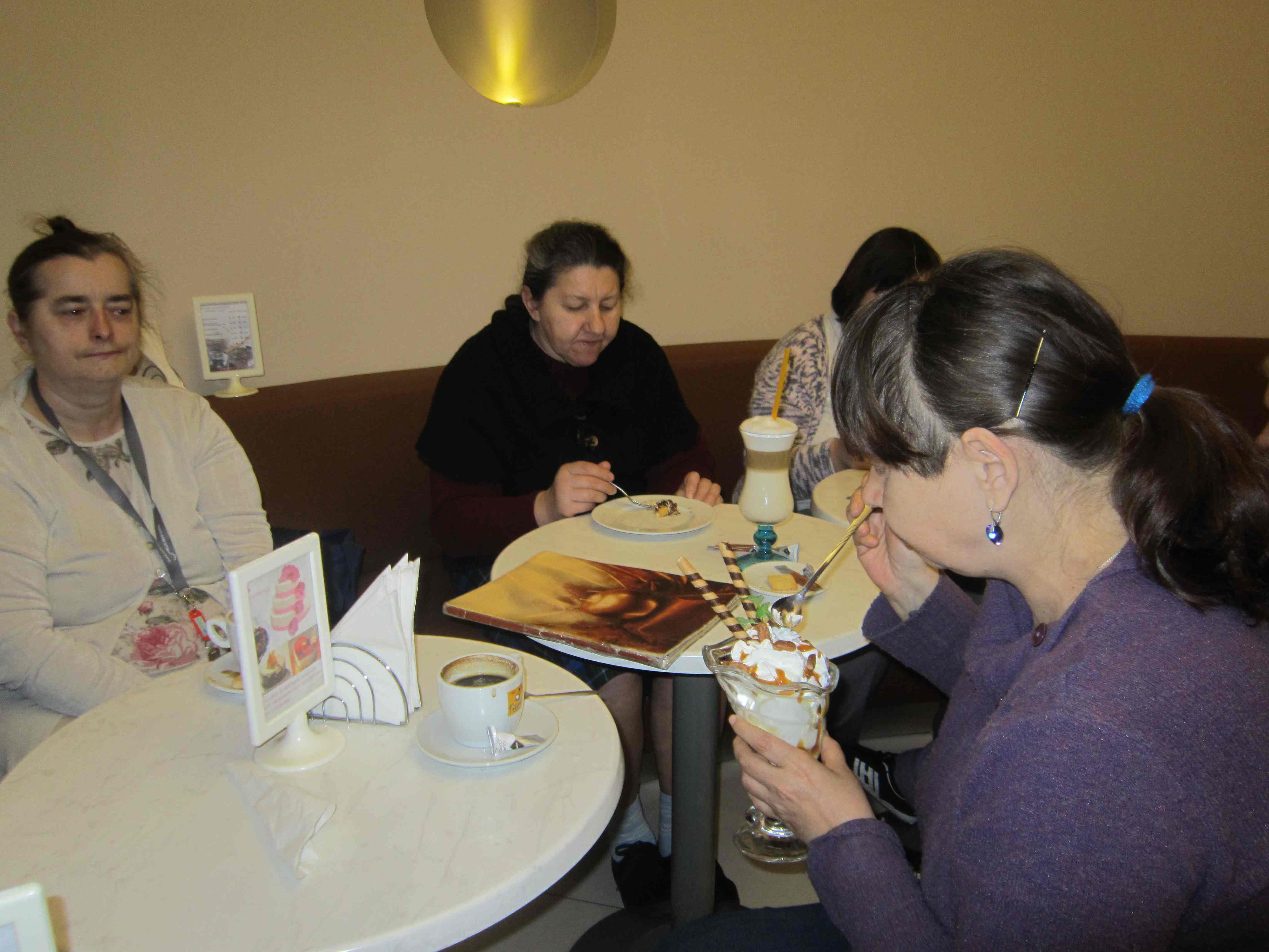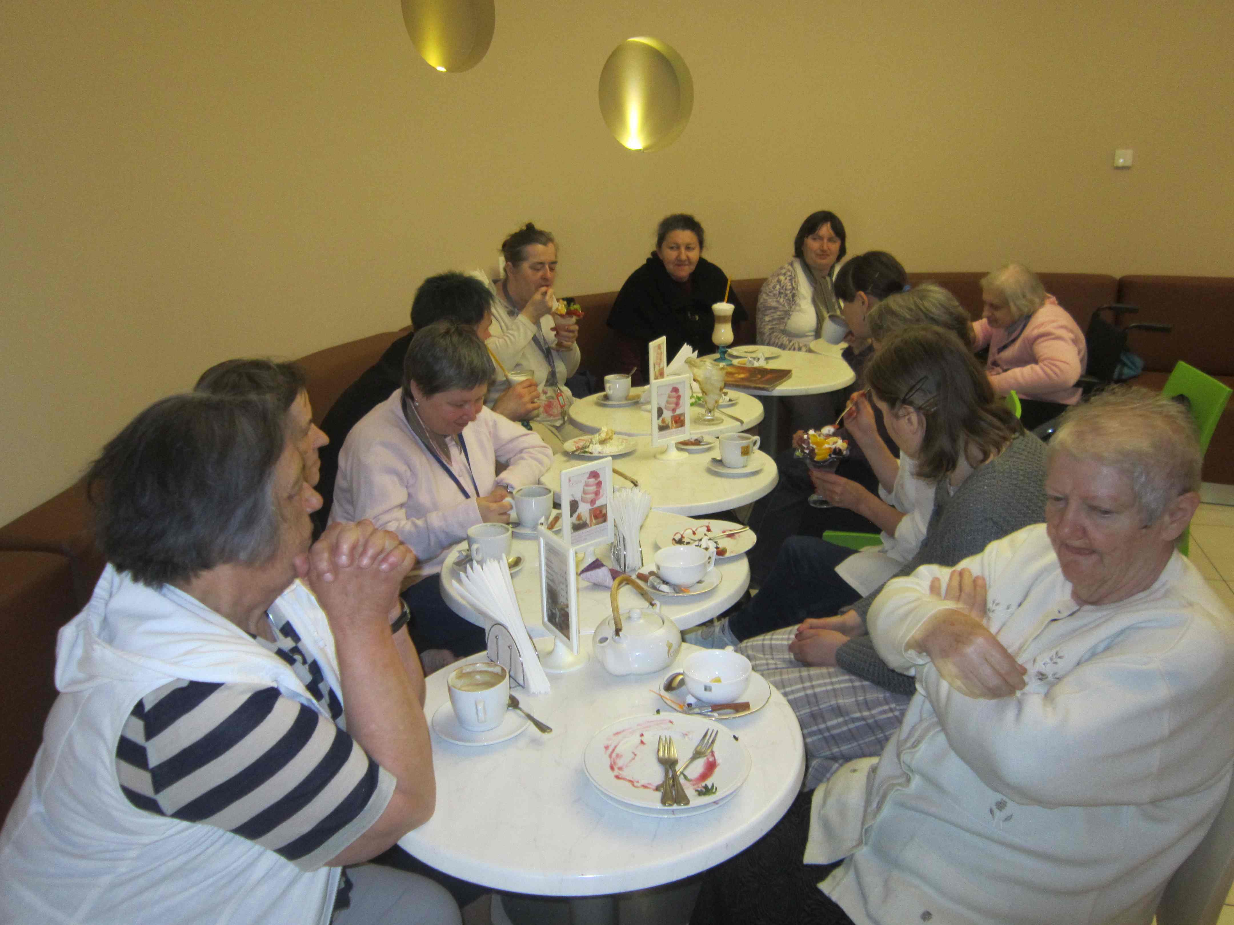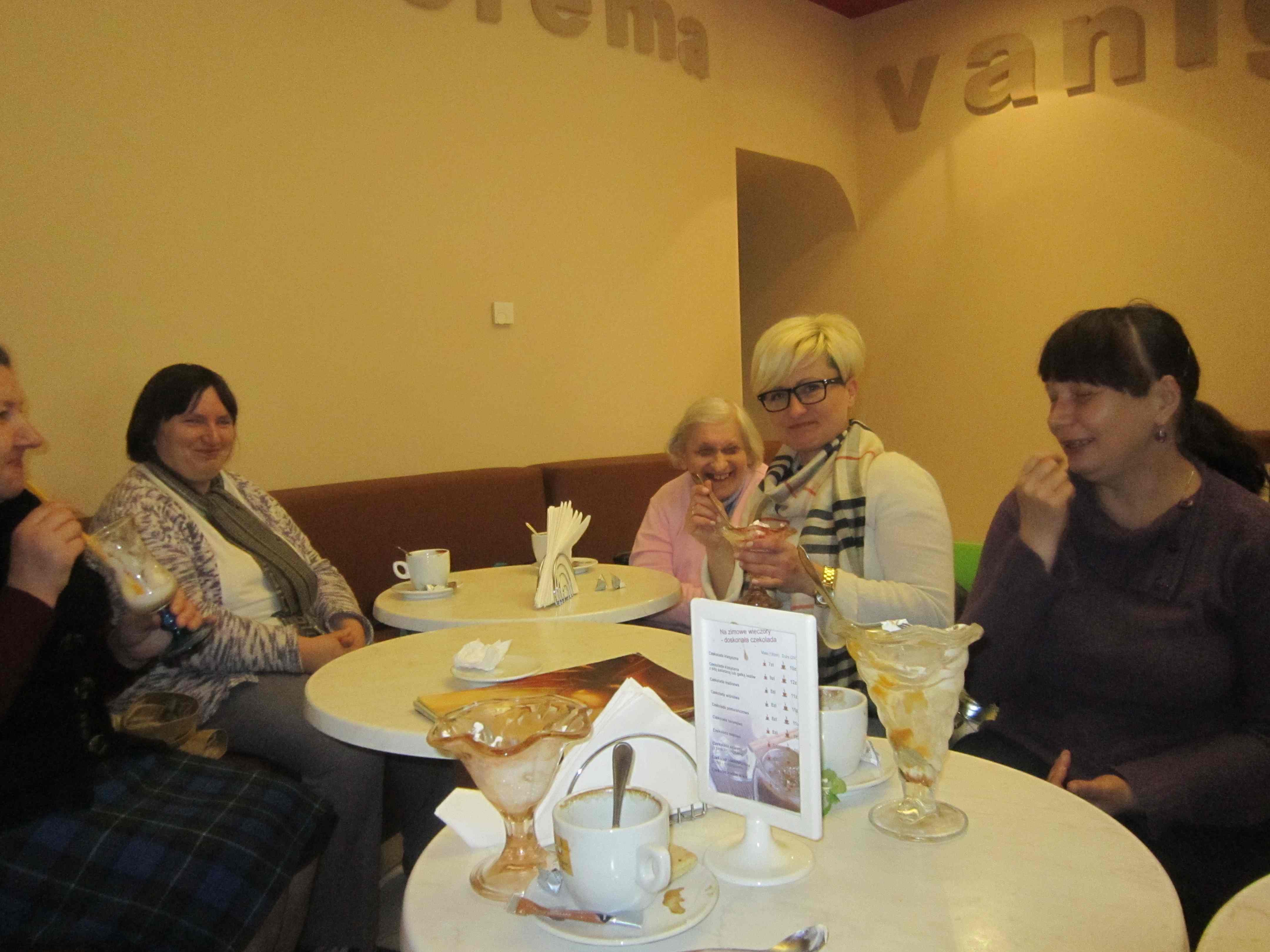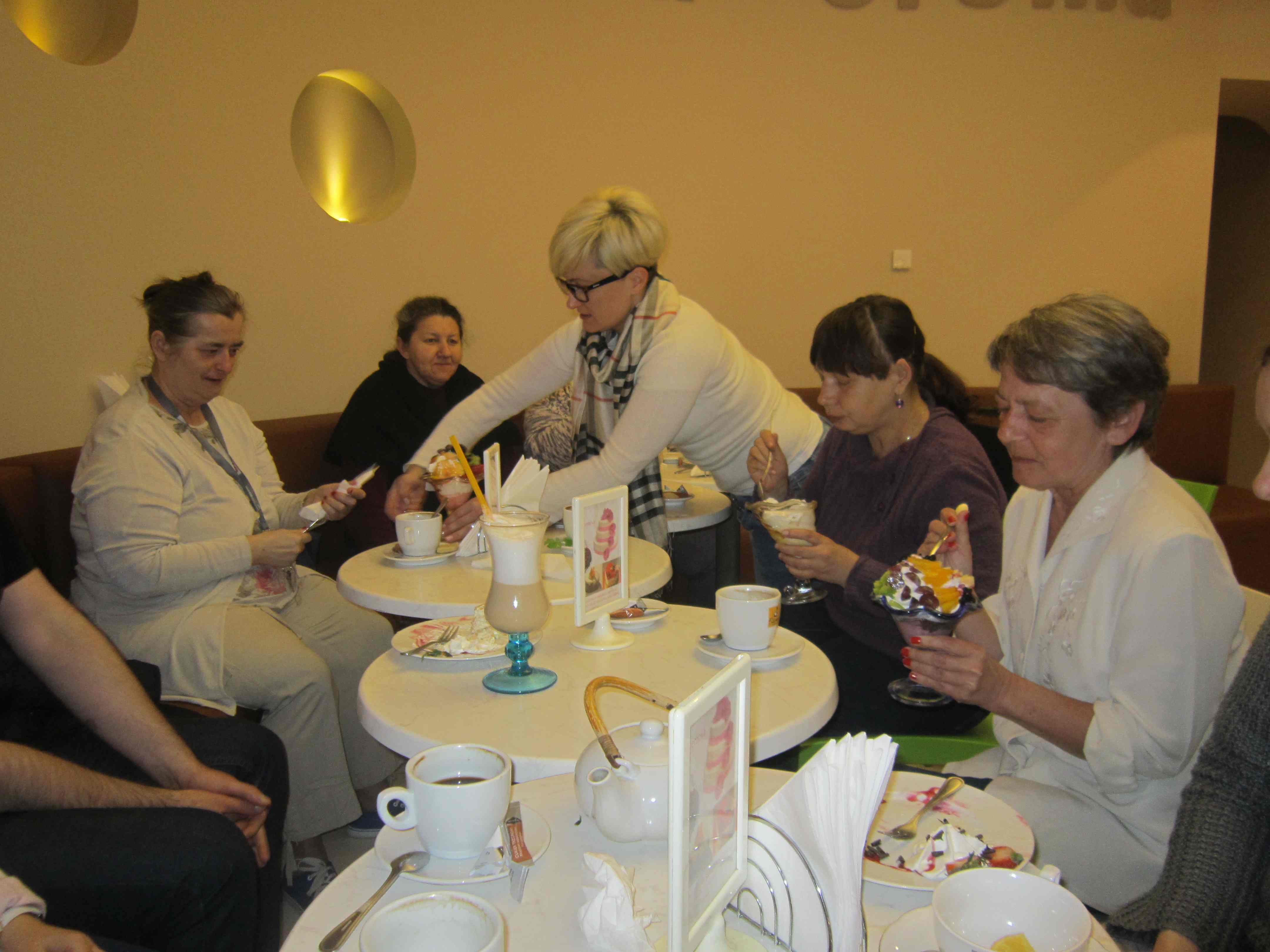 W dn. 04.05.2015 kilkunastoosobowa grupa mieszkanek wybrała się na lody i ciastka do kawiarni – w ten symboliczny sposób nagrodziliśmy aktywność naszych mieszkanek w zajęciach prowadzonych w ramach terapii zajęciowej – zwłaszcza plastycznych i teatralnych.