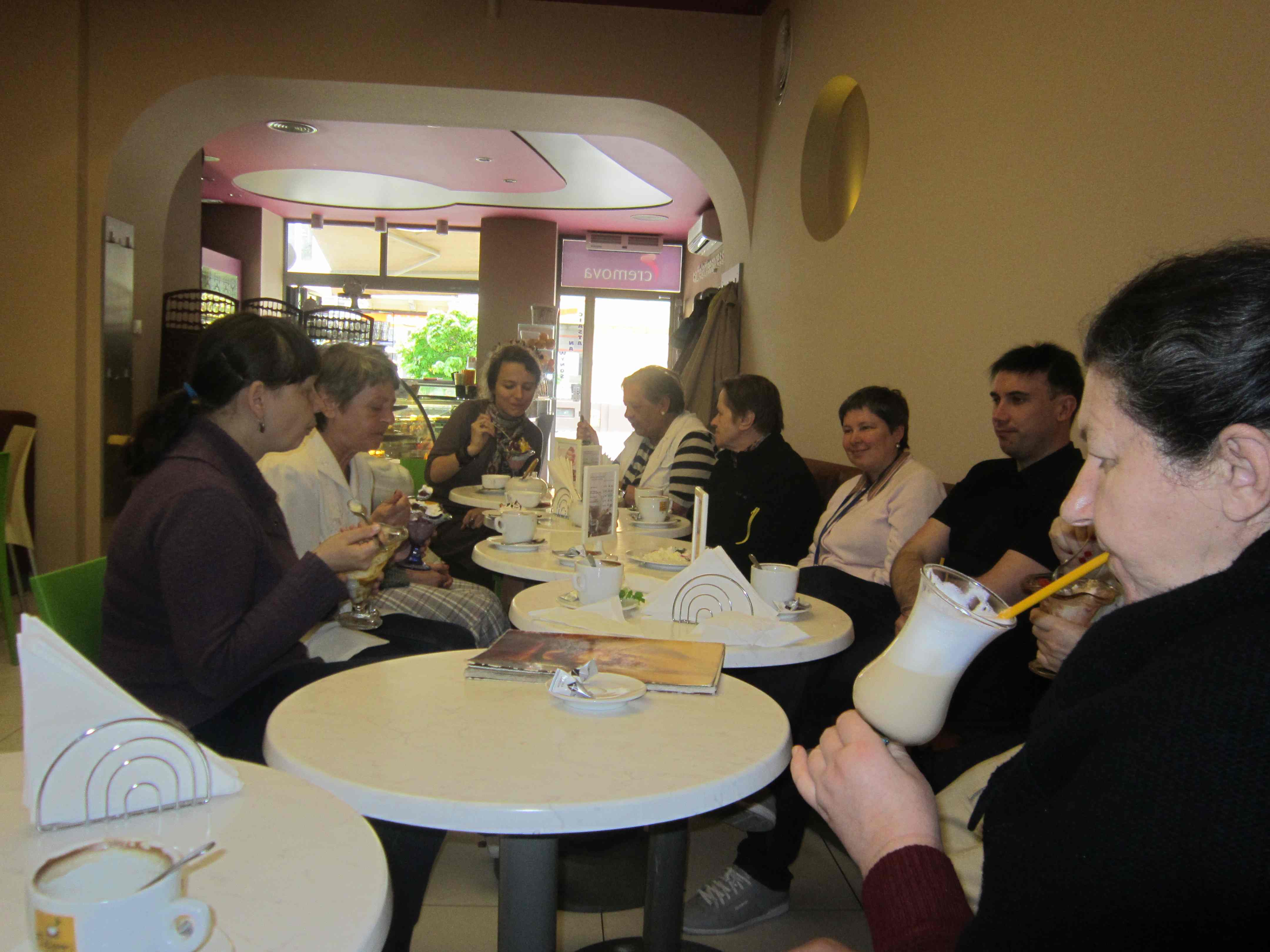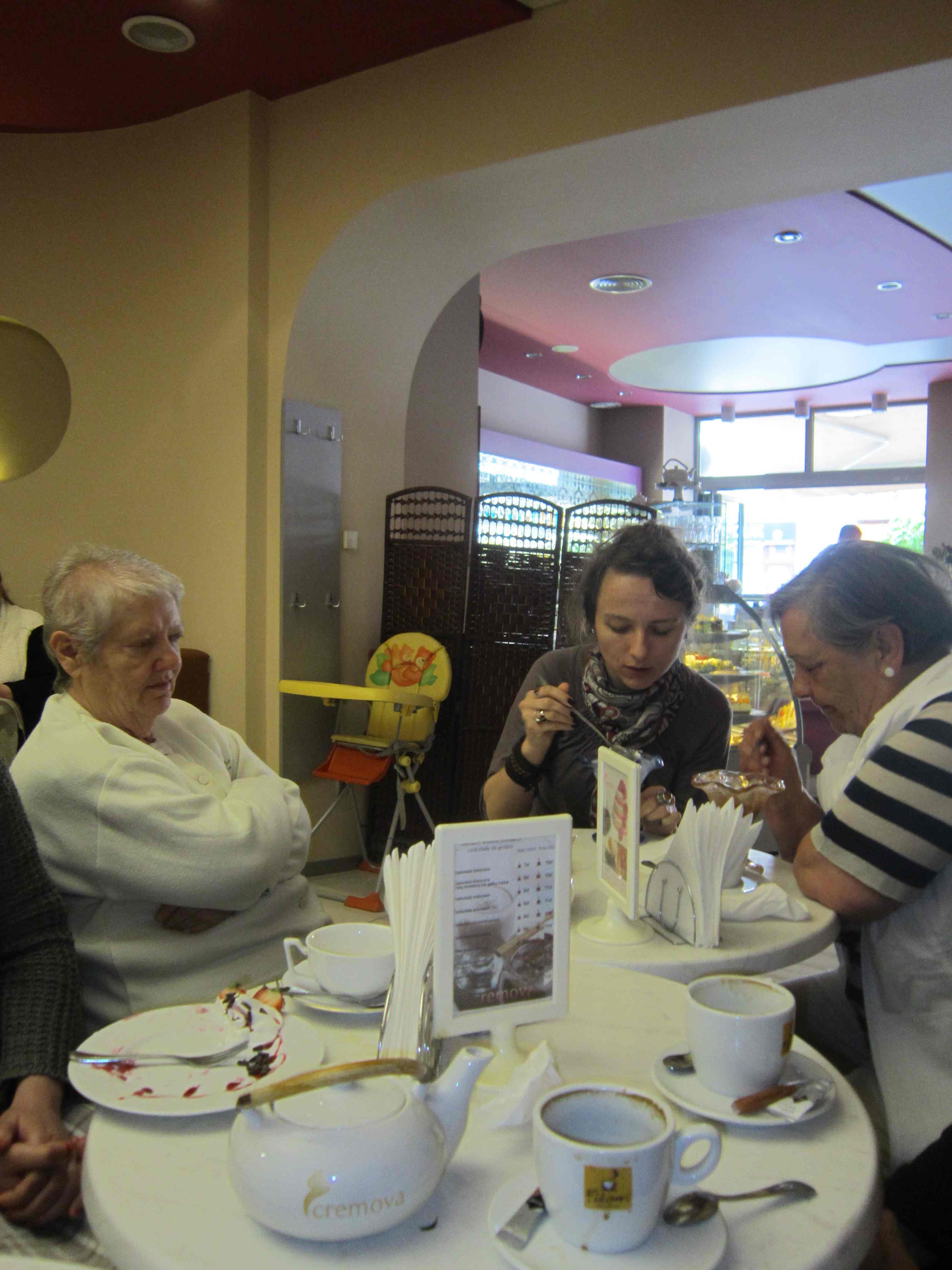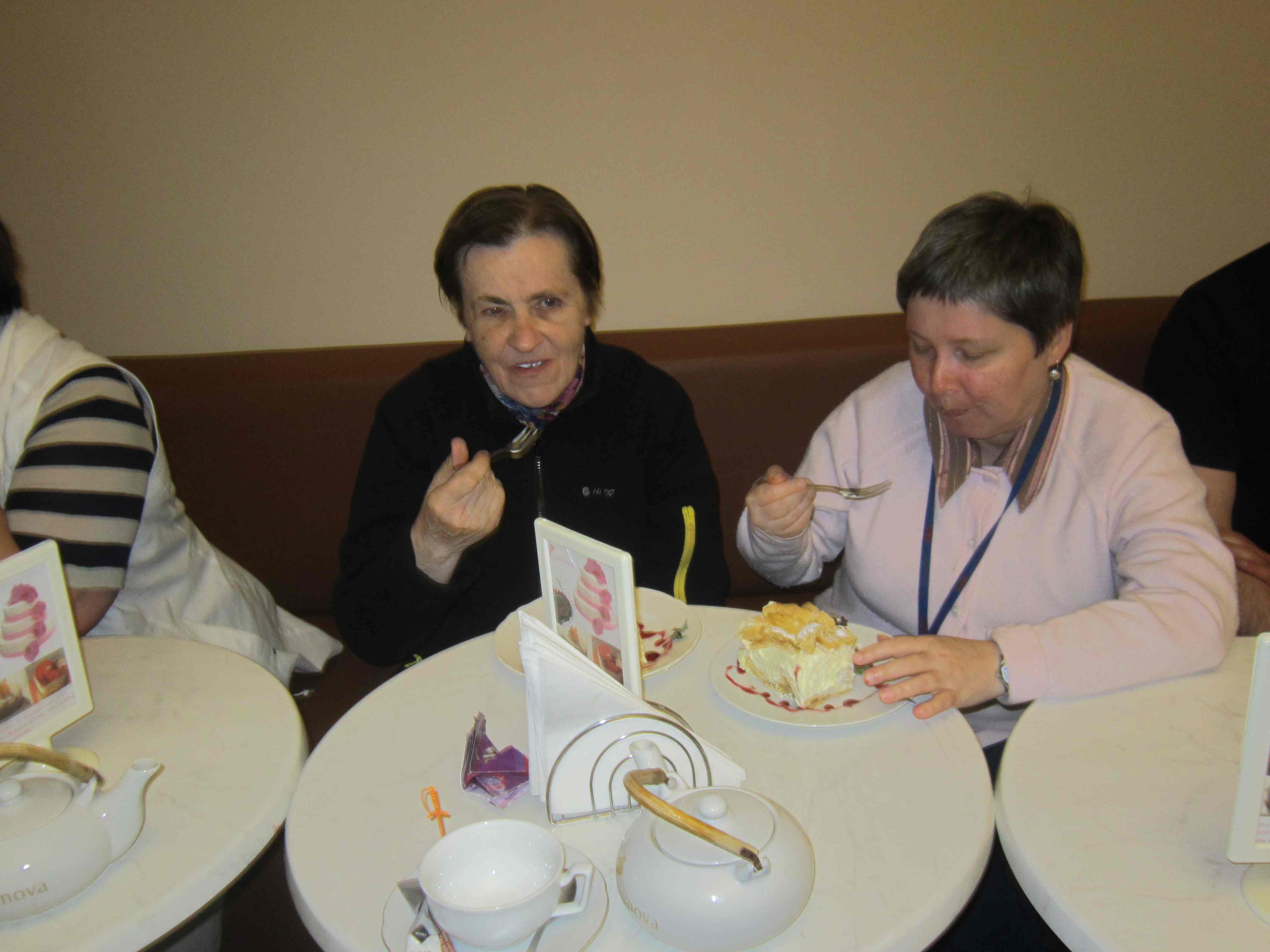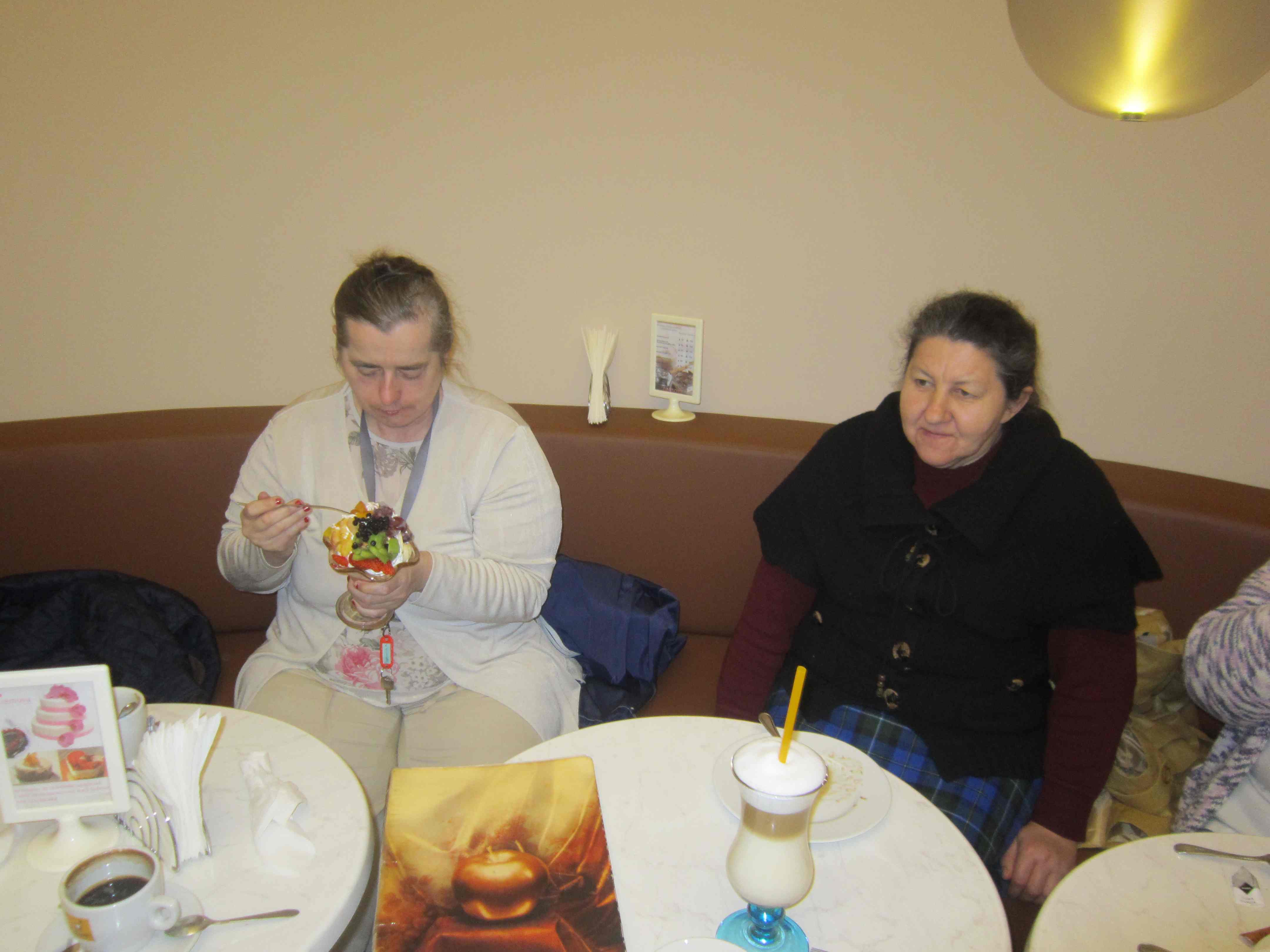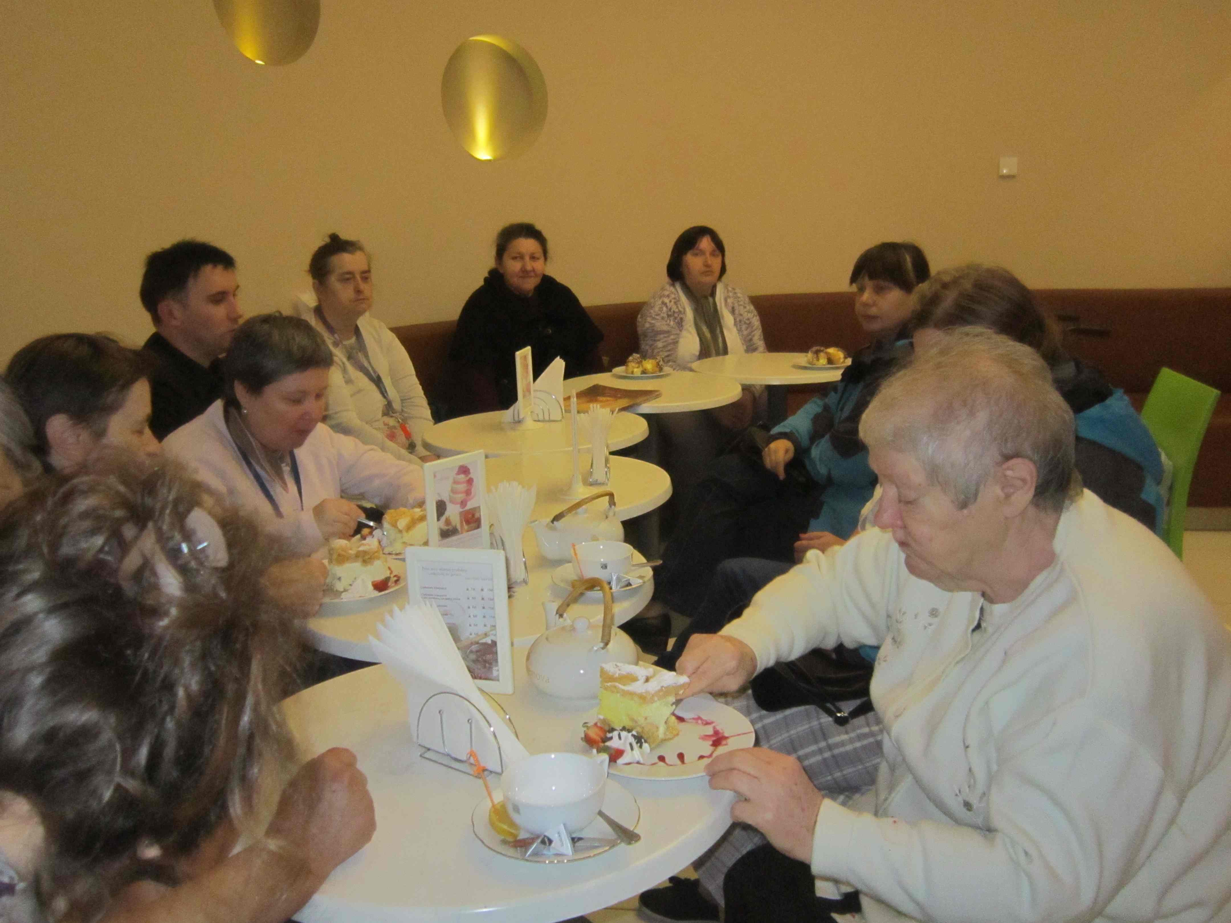 W dn. 04.05.2015 kilkunastoosobowa grupa mieszkanek wybrała się na lody i ciastka do kawiarni – w ten symboliczny sposób nagrodziliśmy aktywność naszych mieszkanek w zajęciach prowadzonych w ramach terapii zajęciowej – zwłaszcza plastycznych i teatralnych.