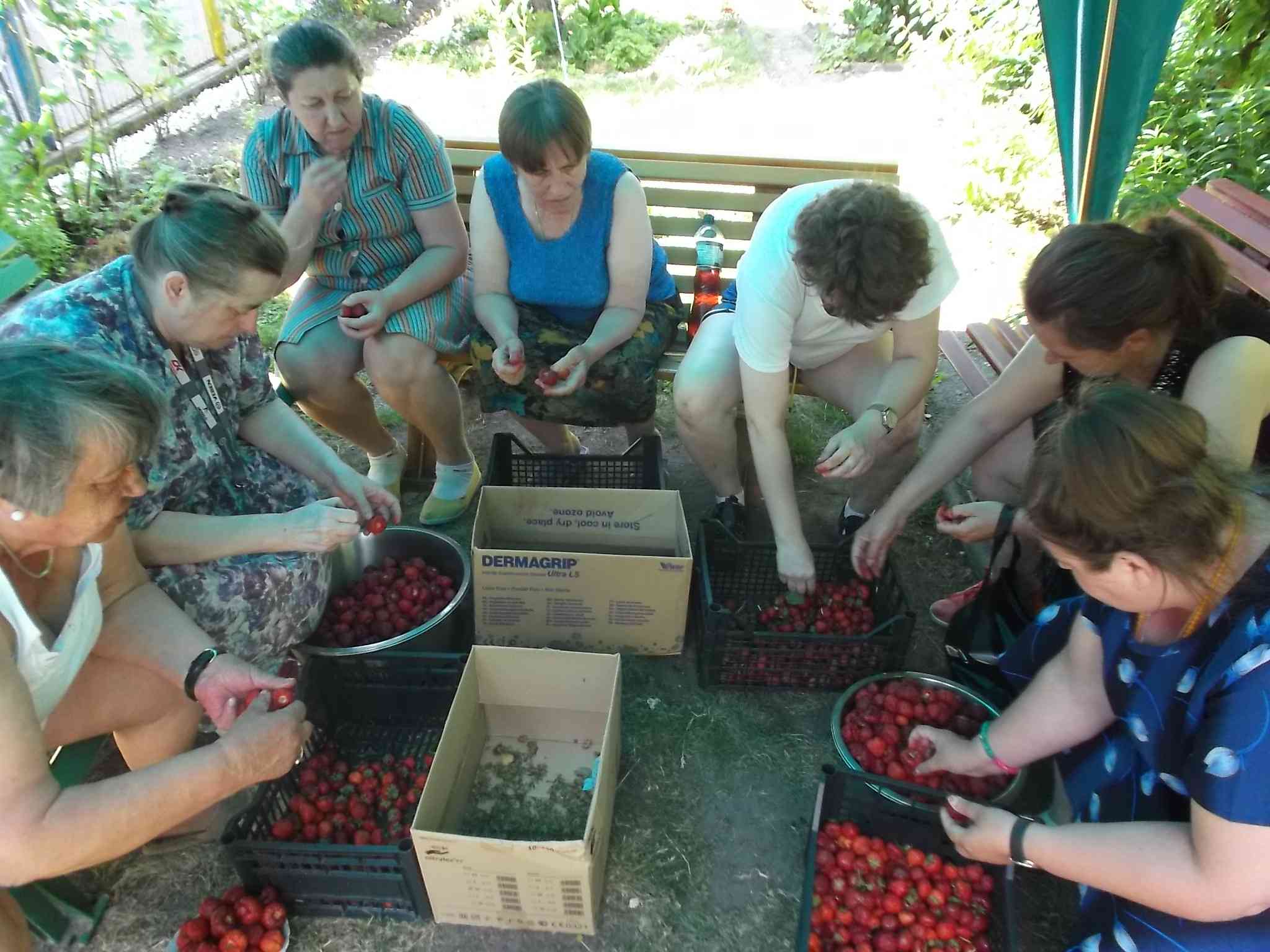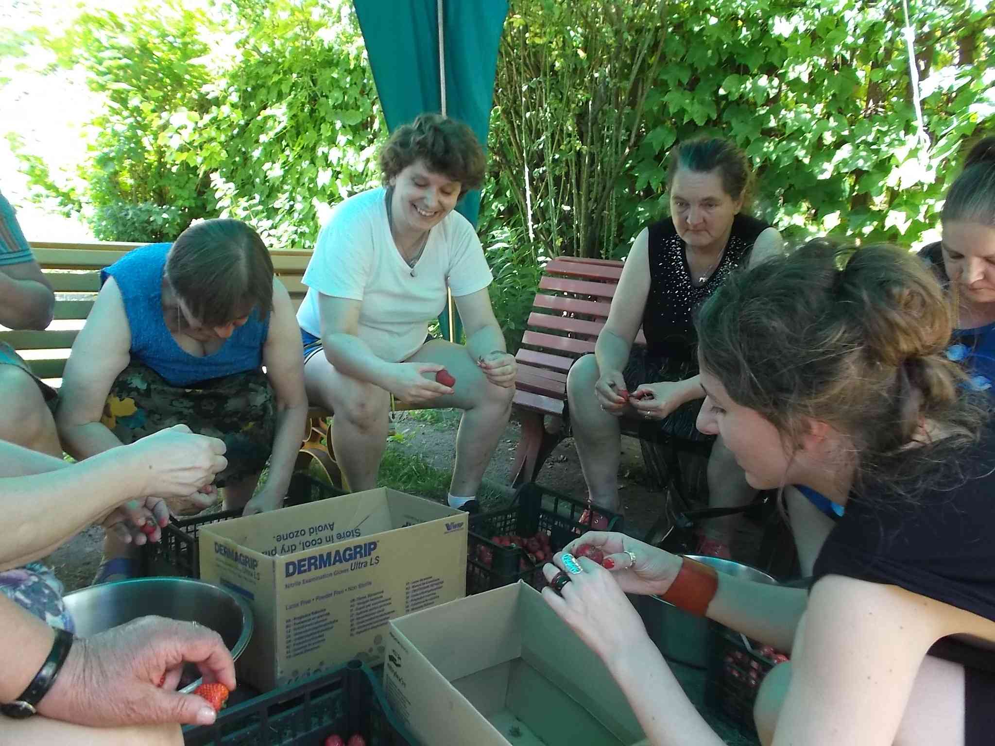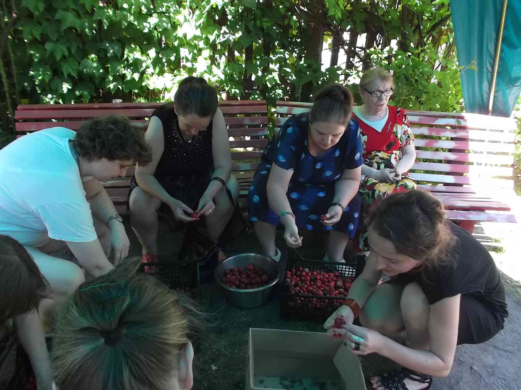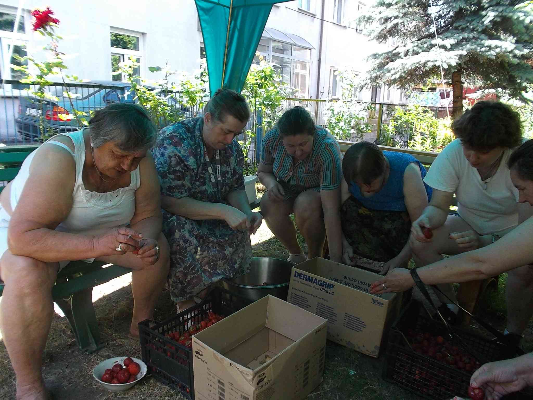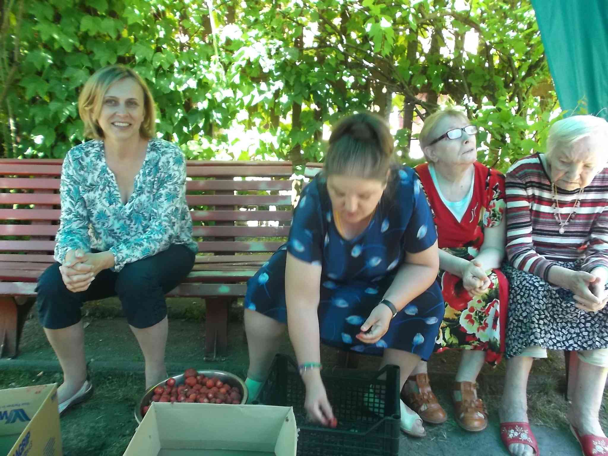Mieszkanki szypułkowały w lecie truskawki na kompoty i podwieczorki w DPS. Ta forma spędzania czasu na świeżym powietrzu łączyła przyjemne z pożytecznym – najlepsze owoce można było wybrać dla siebie :)