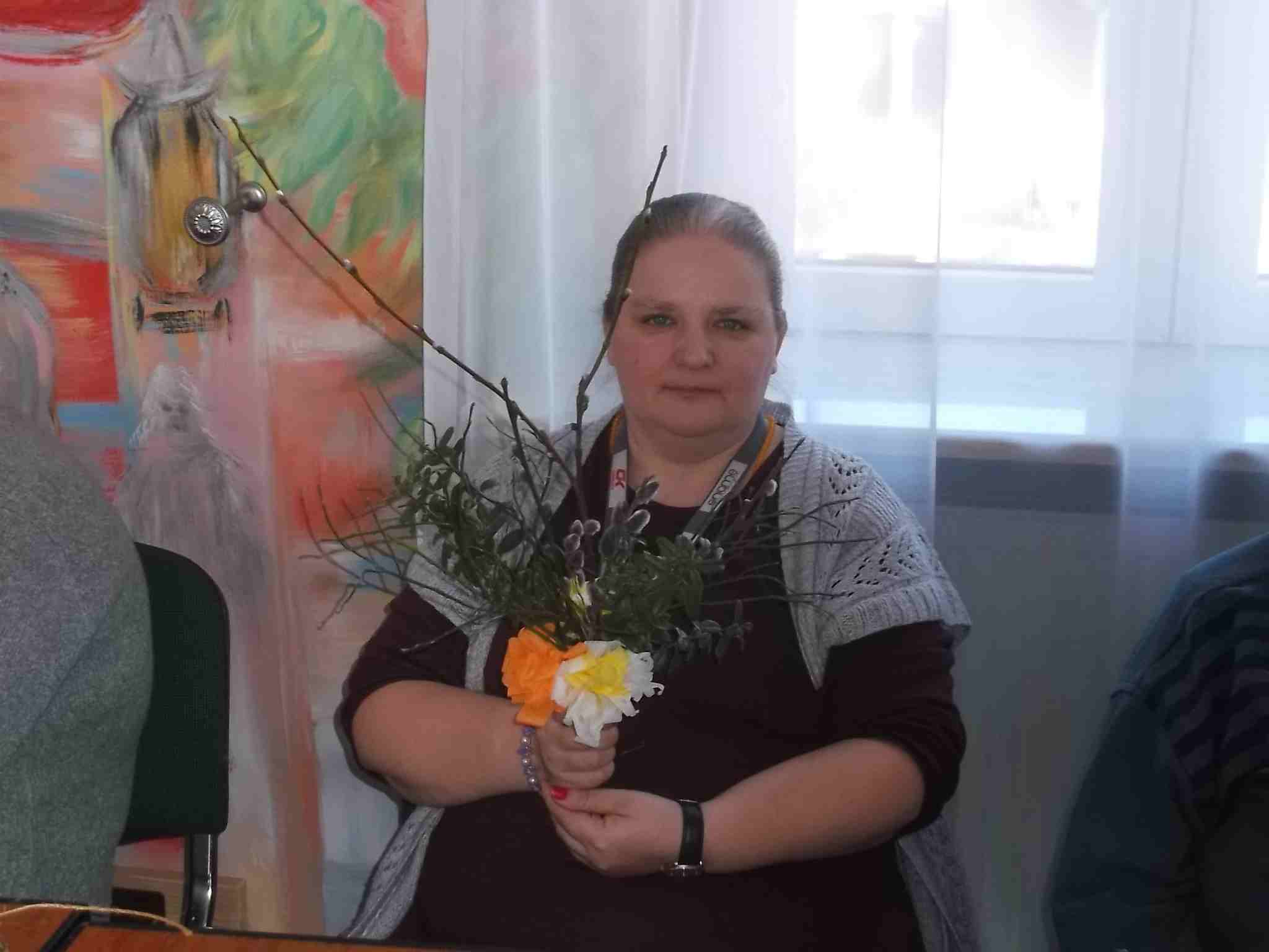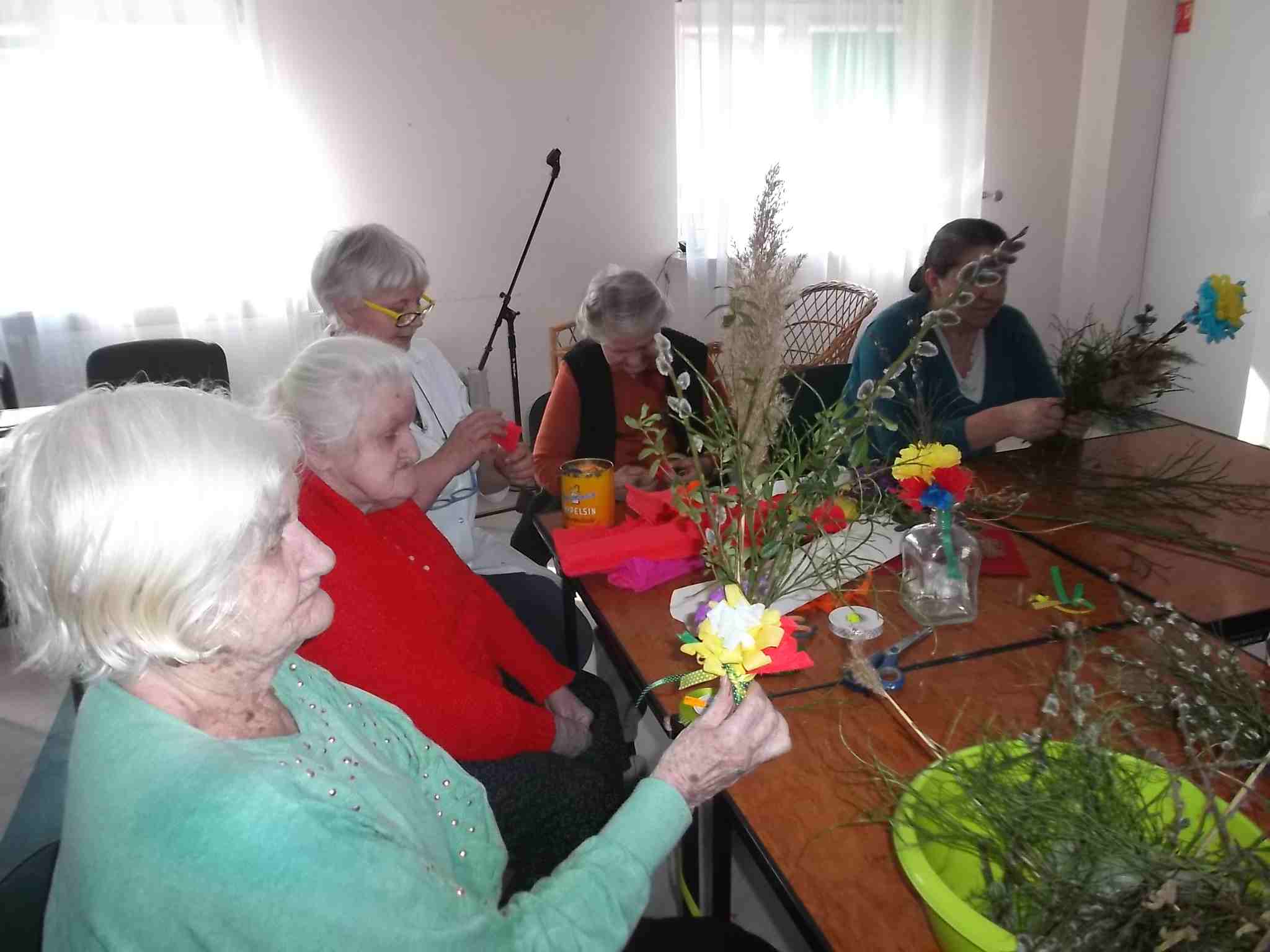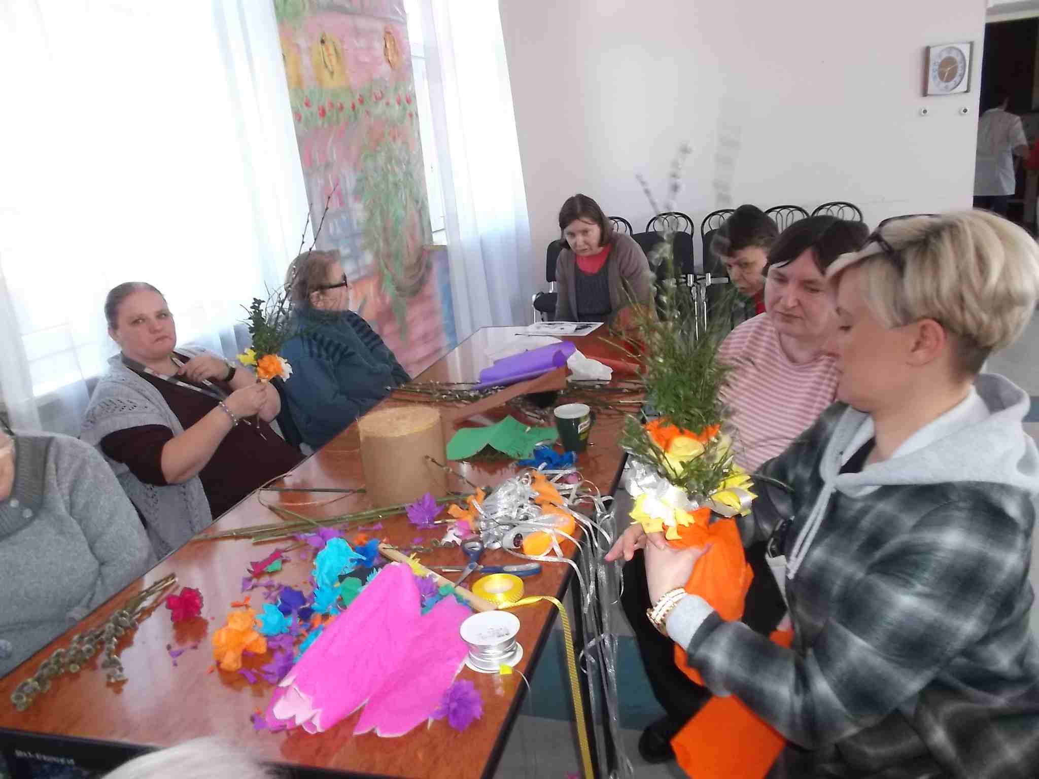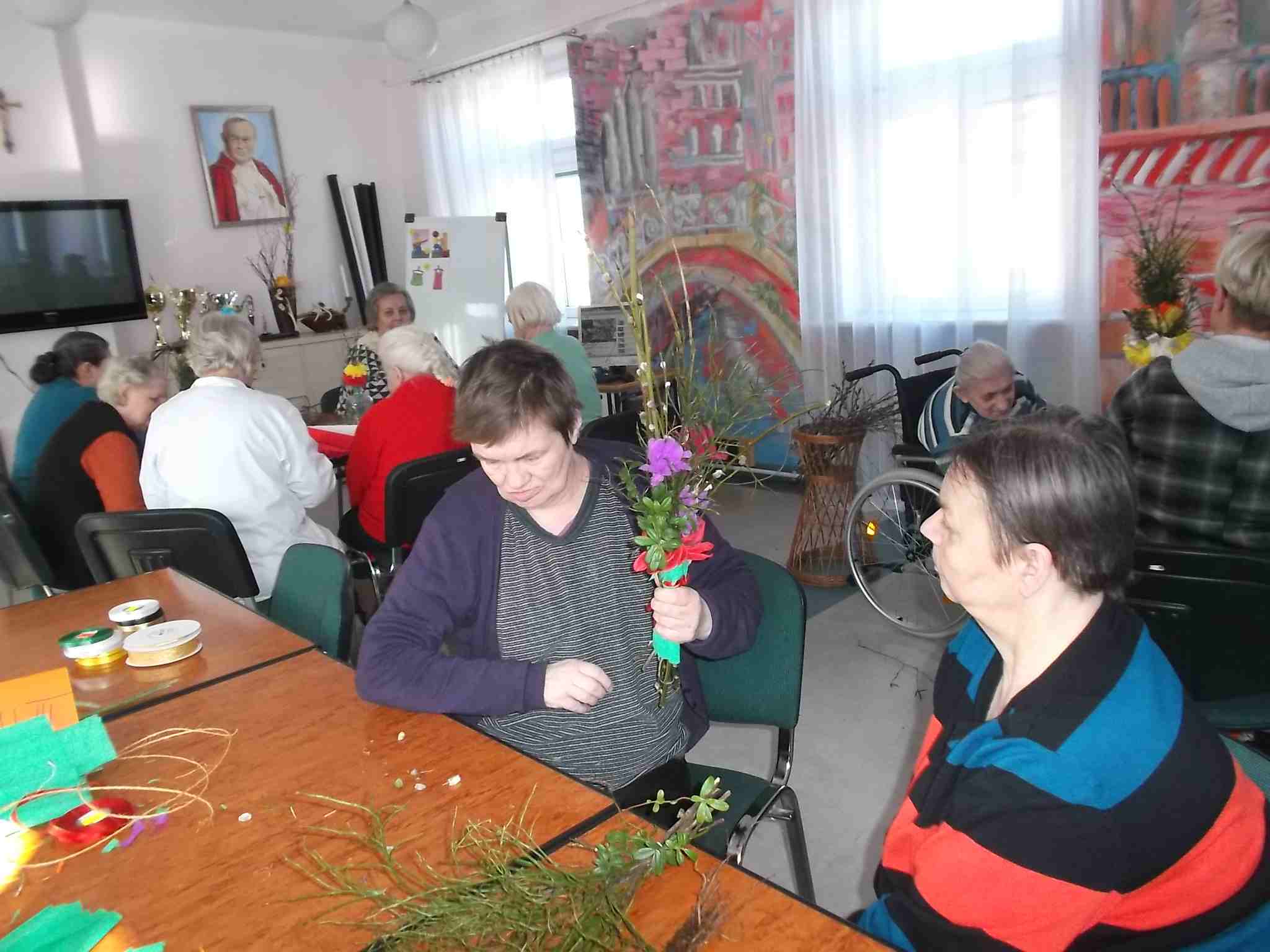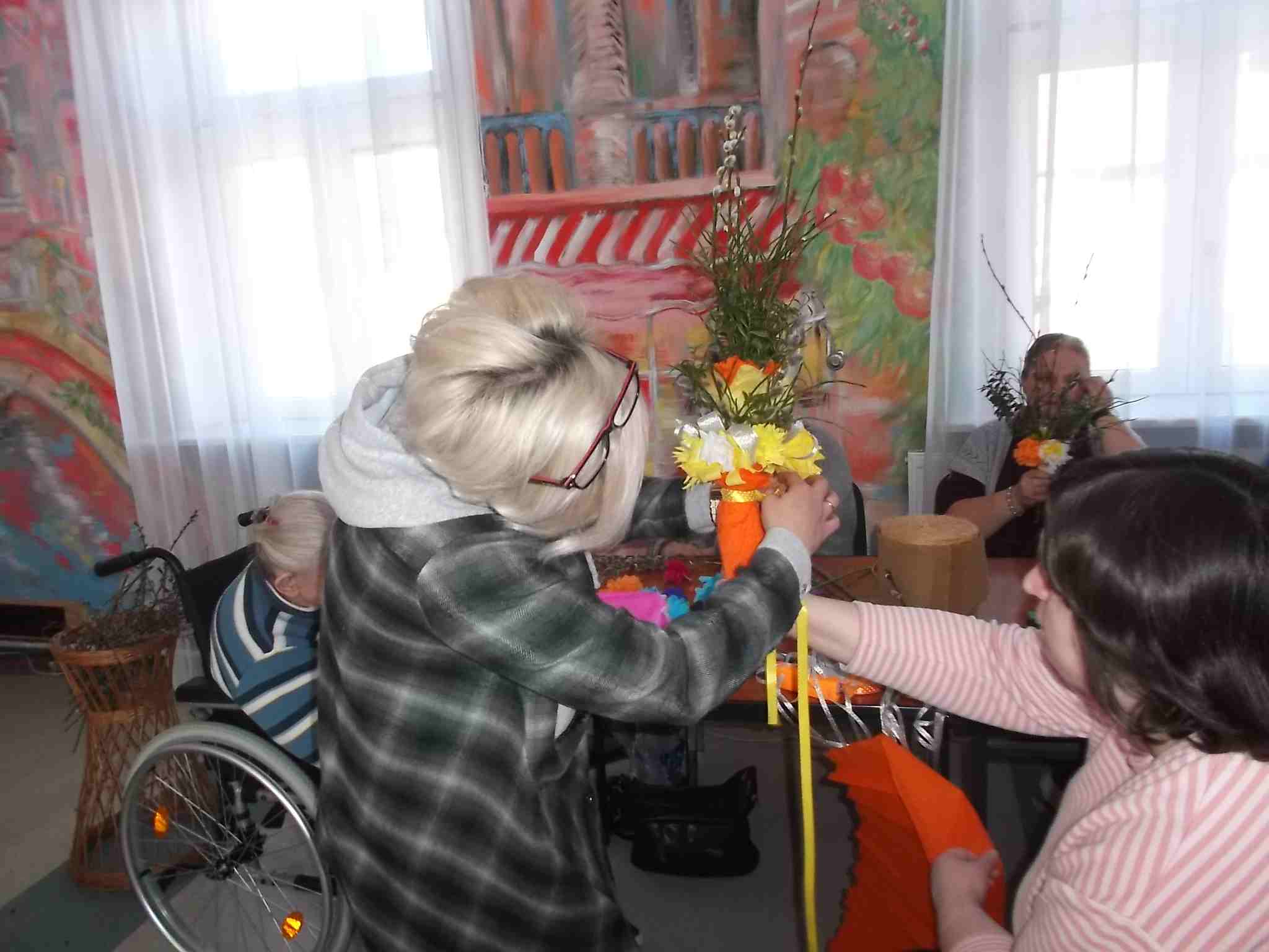 Przed niedzielą palmową mieszkanki same i przy pomocy terapeutów przygotowywały palmy wielkanocne wykorzystując m.in. bazie i kwiaty z bibuły zrobione wcześniej na zajęciach manualnych. W swoje palmy Panie włożyły mnóstwo pracy!