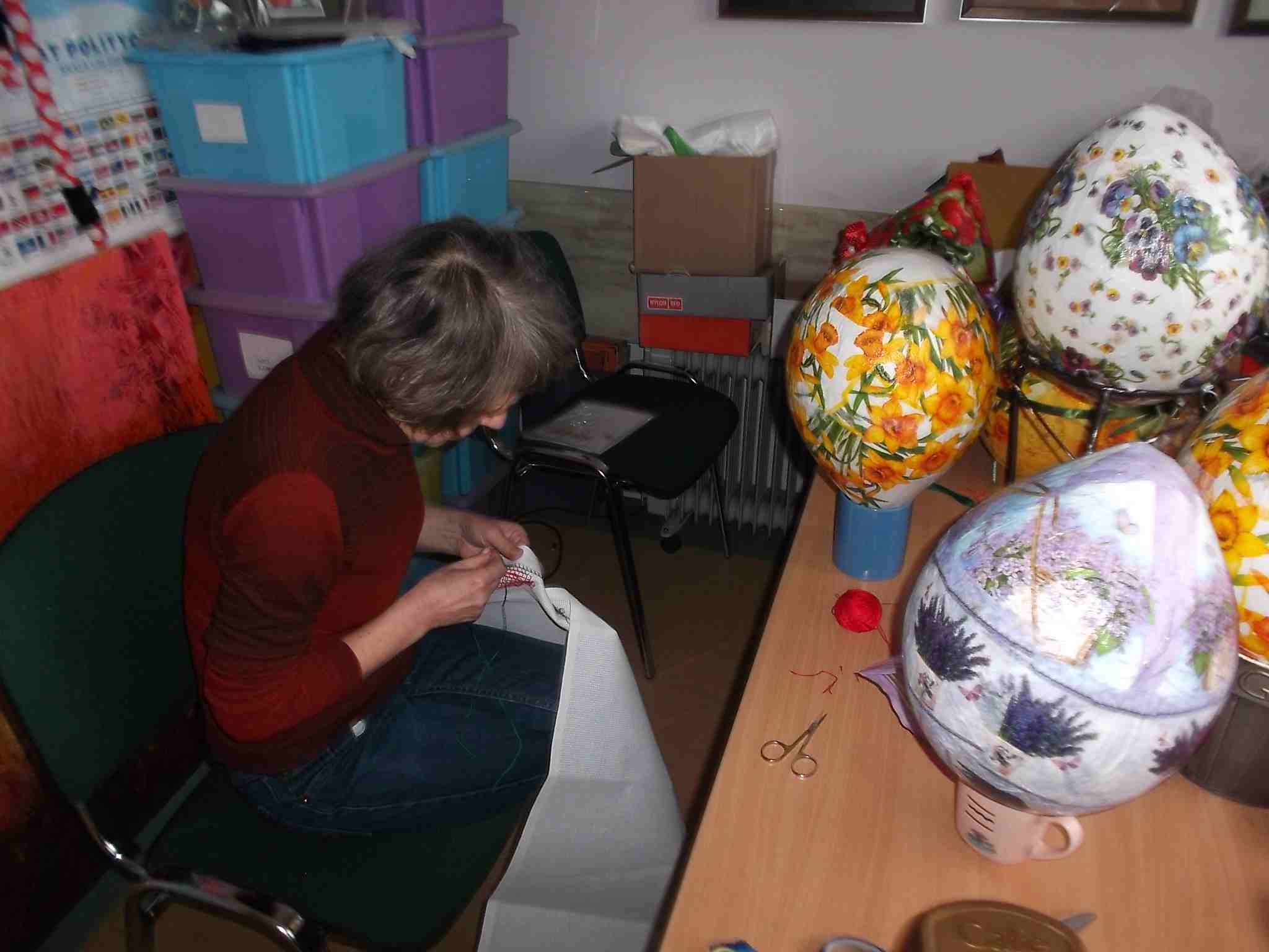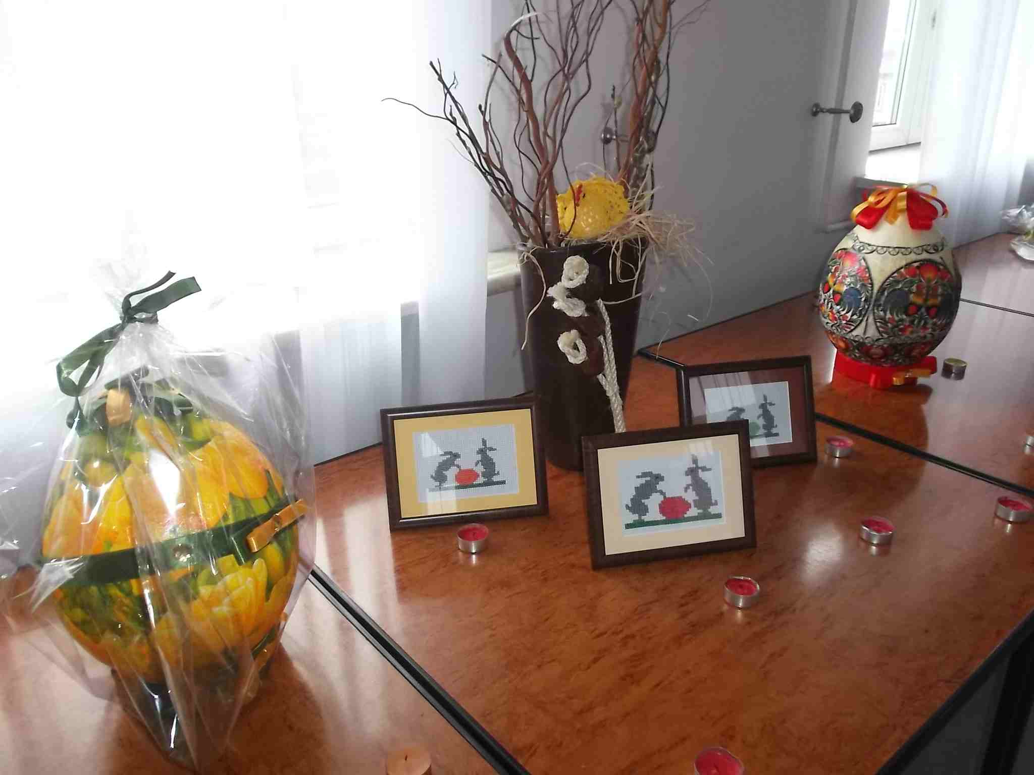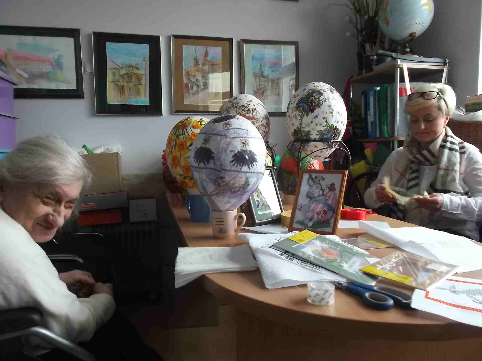 Mieszkanki w ramach terapii zajęciowej cały miesiąc pod kierunkiem terapeuty przygotowywały ozdoby wielkanocne – kartki świąteczne, zajączki i kurczaczki z wełny, haftowane obrazki, jajka ozdabiane techniką decoupage lub kanwą wyszywaną w kwiaty. Efekty na zdjęciach!