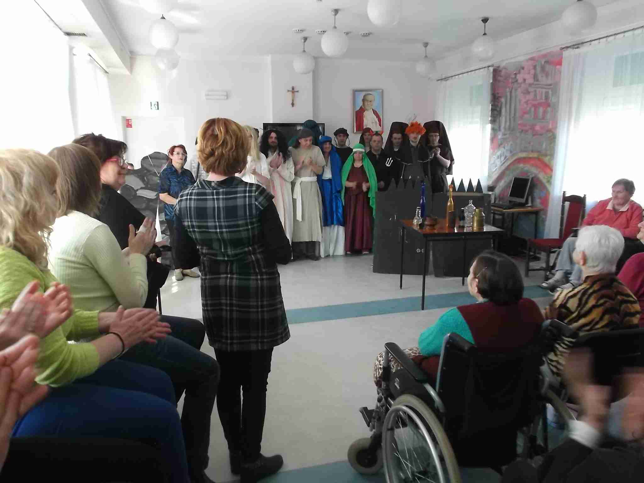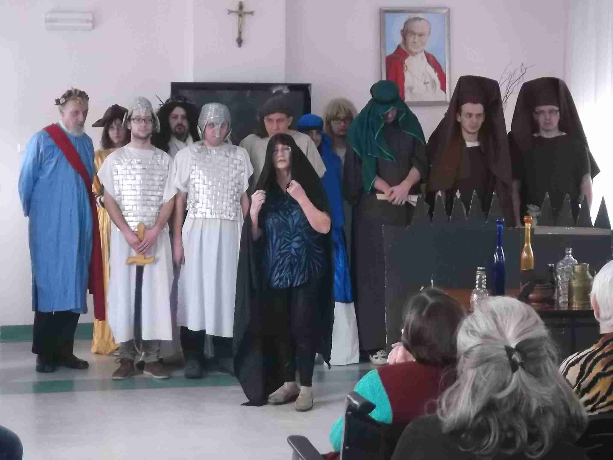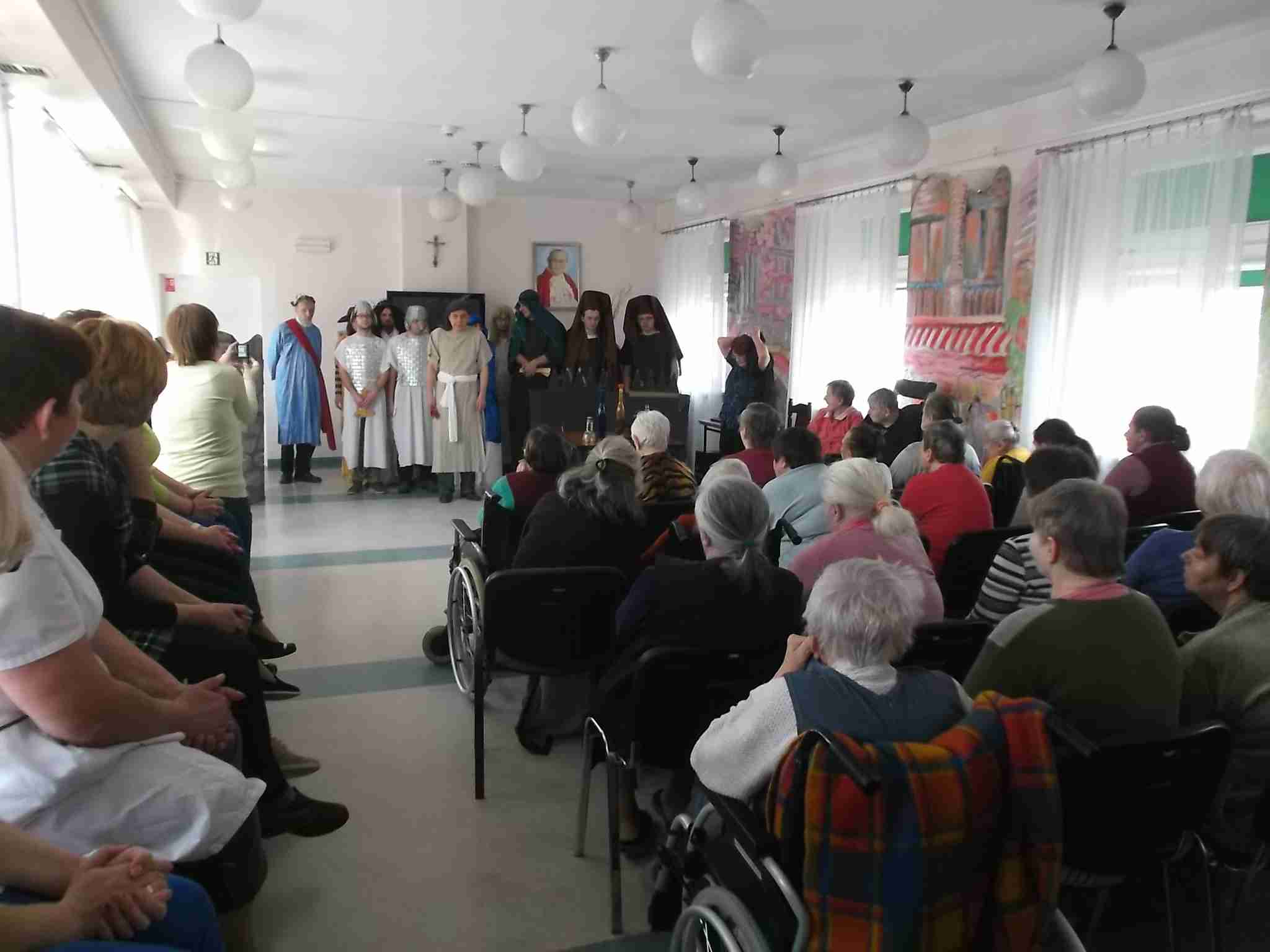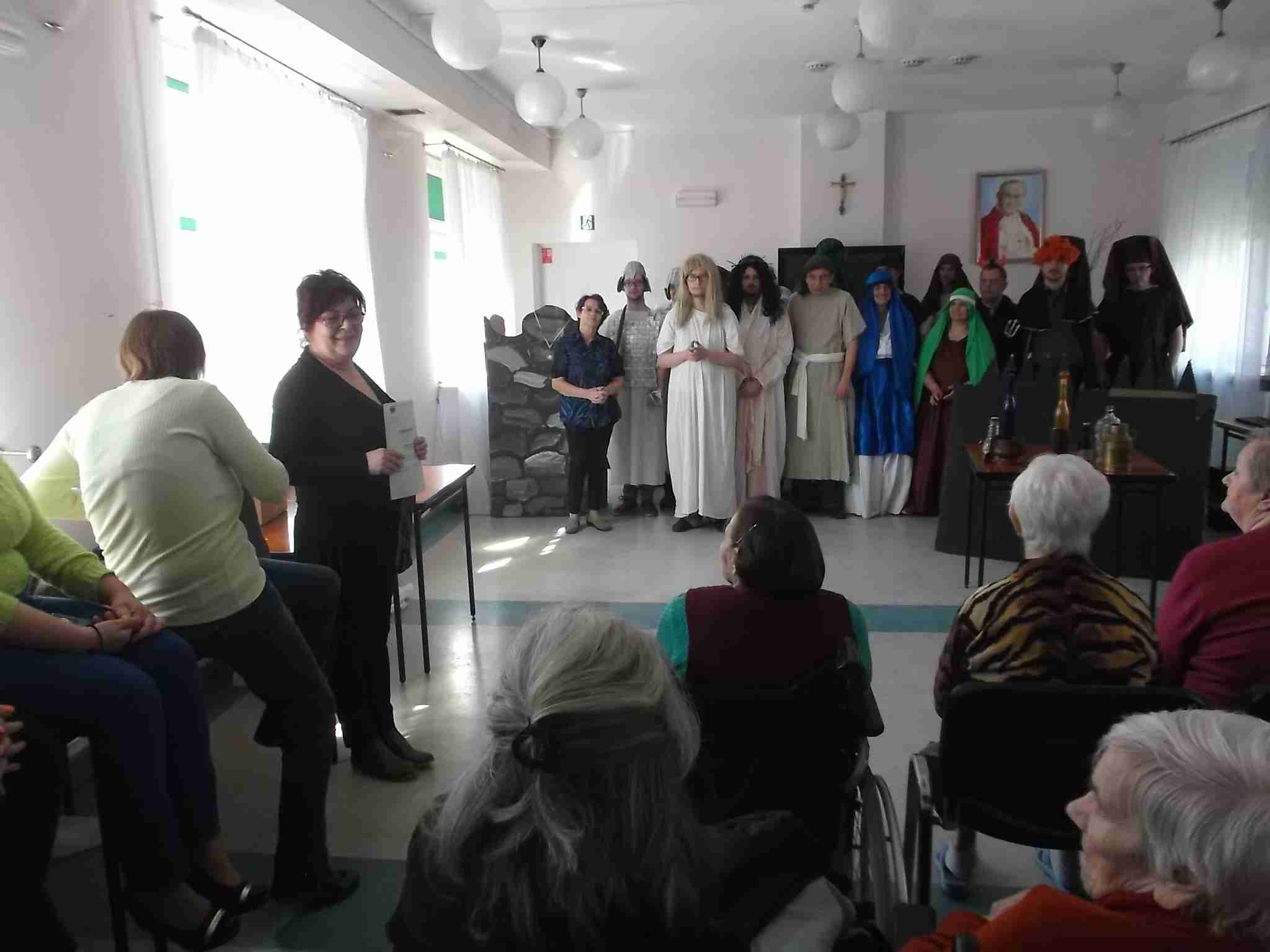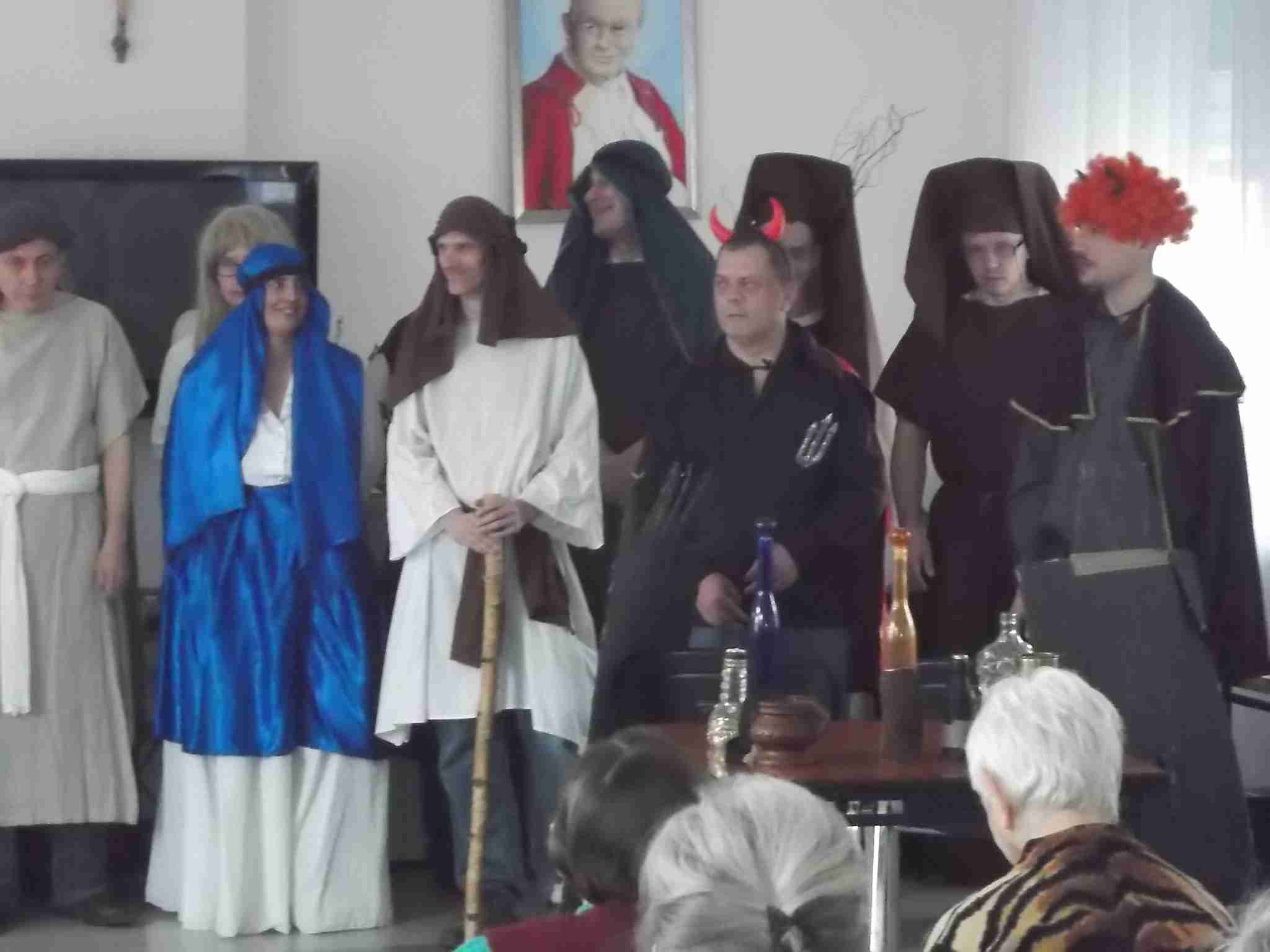 W dn. 21.04.2016 liczną kilkunastoosobową grupą wystąpili w naszym Domu uczestnicy Środowiskowego Domu Samopomocy z ul. Miodowej. Grupa przedstawiła spektakl nawiązujący do Wielkiej Nocy. Mogliśmy podziwiać własnoręcznie przygotowane stroje i scenografię – całość robiła na odbiorcach duże wrażenie. Po występie zaprosiliśmy artystów na kawę i ciastka. W maju planujemy zrewanżować się „Miodowej” naszym spektaklem – właśnie przygotowywanym przez grupę teatralną Albercik „Skąpcem”.