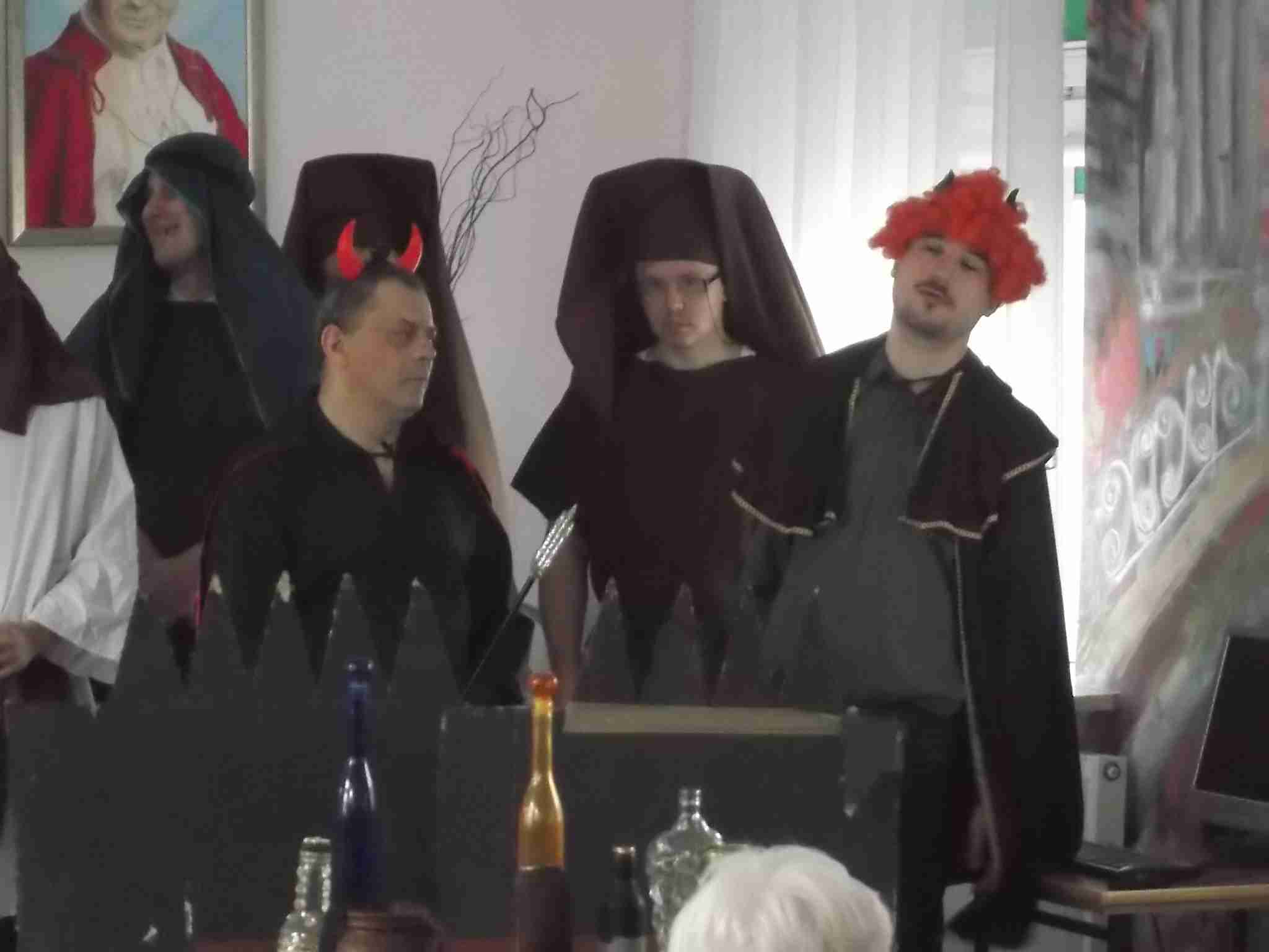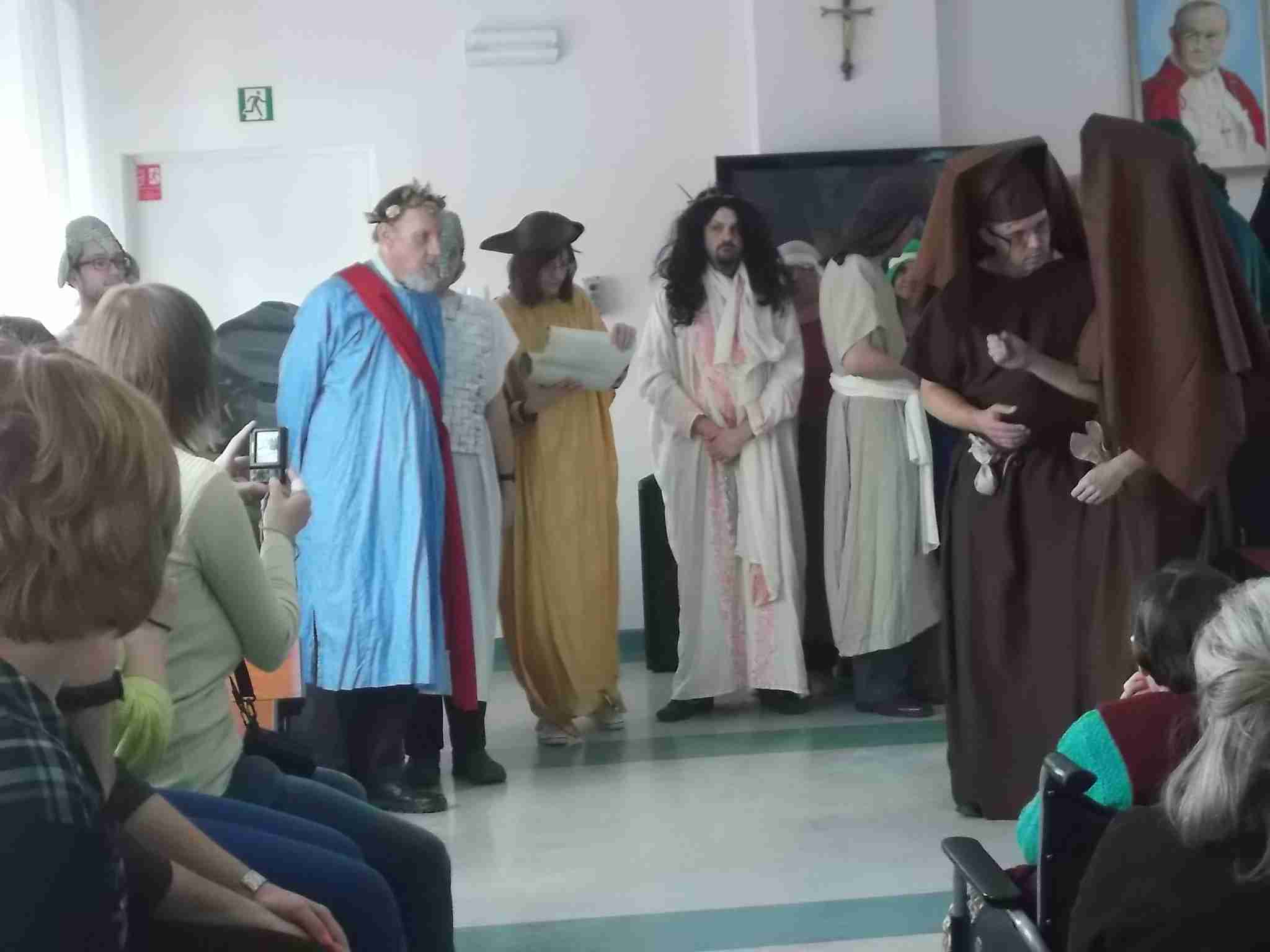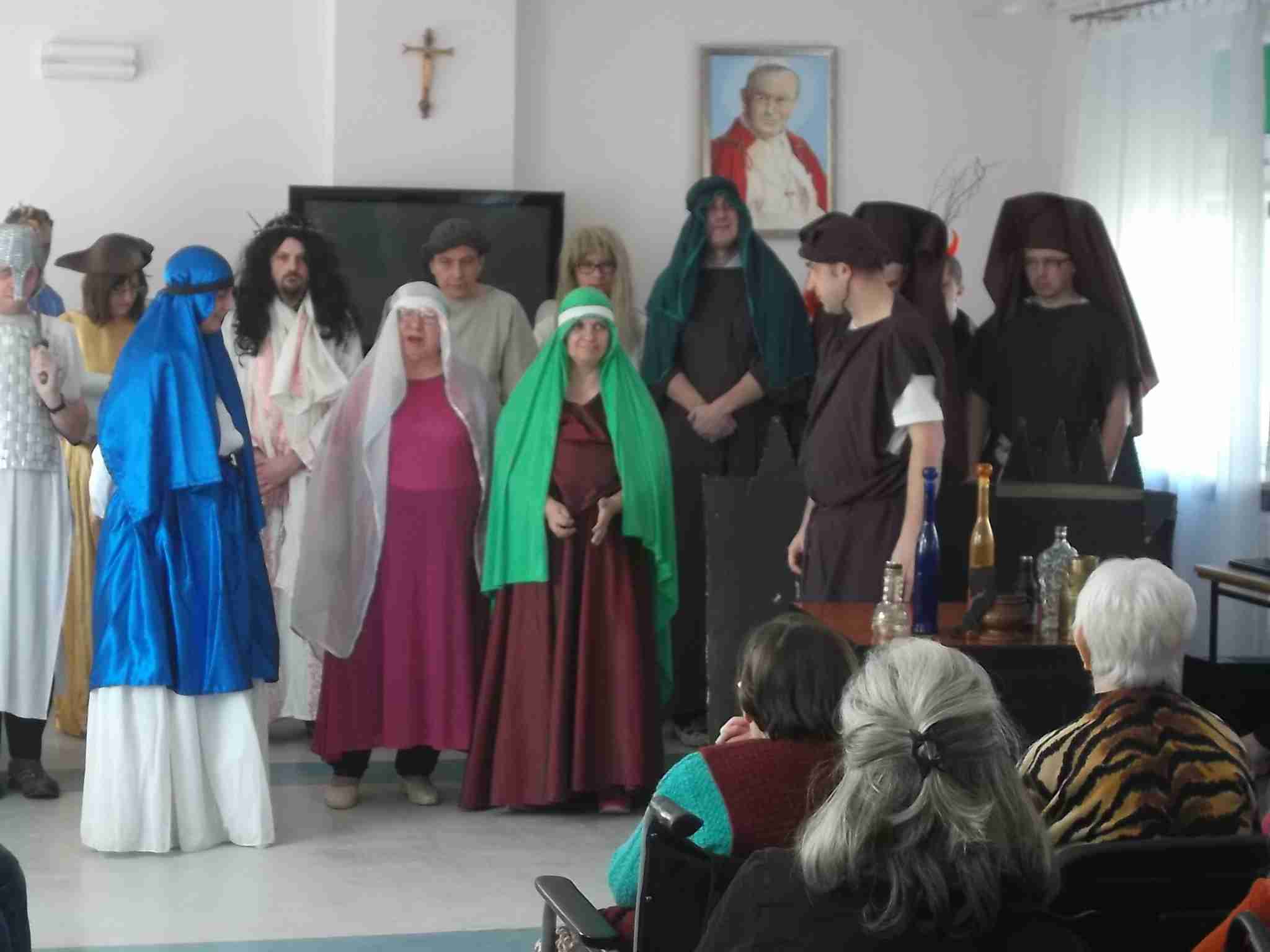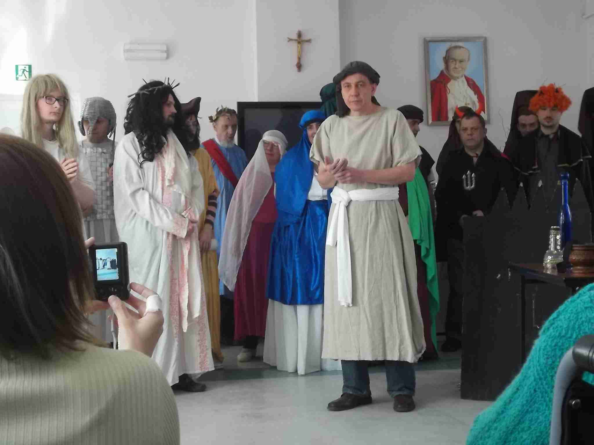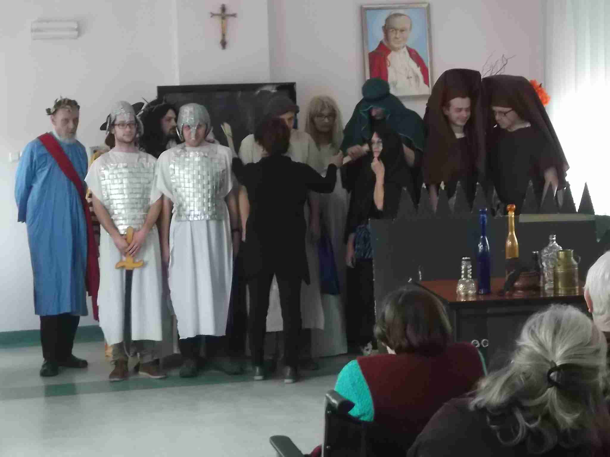 W dn. 21.04.2016 liczną kilkunastoosobową grupą wystąpili w naszym Domu uczestnicy Środowiskowego Domu Samopomocy z ul. Miodowej. Grupa przedstawiła spektakl nawiązujący do Wielkiej Nocy. Mogliśmy podziwiać własnoręcznie przygotowane stroje i scenografię – całość robiła na odbiorcach duże wrażenie. Po występie zaprosiliśmy artystów na kawę i ciastka. W maju planujemy zrewanżować się „Miodowej” naszym spektaklem – właśnie przygotowywanym przez grupę teatralną Albercik „Skąpcem”.