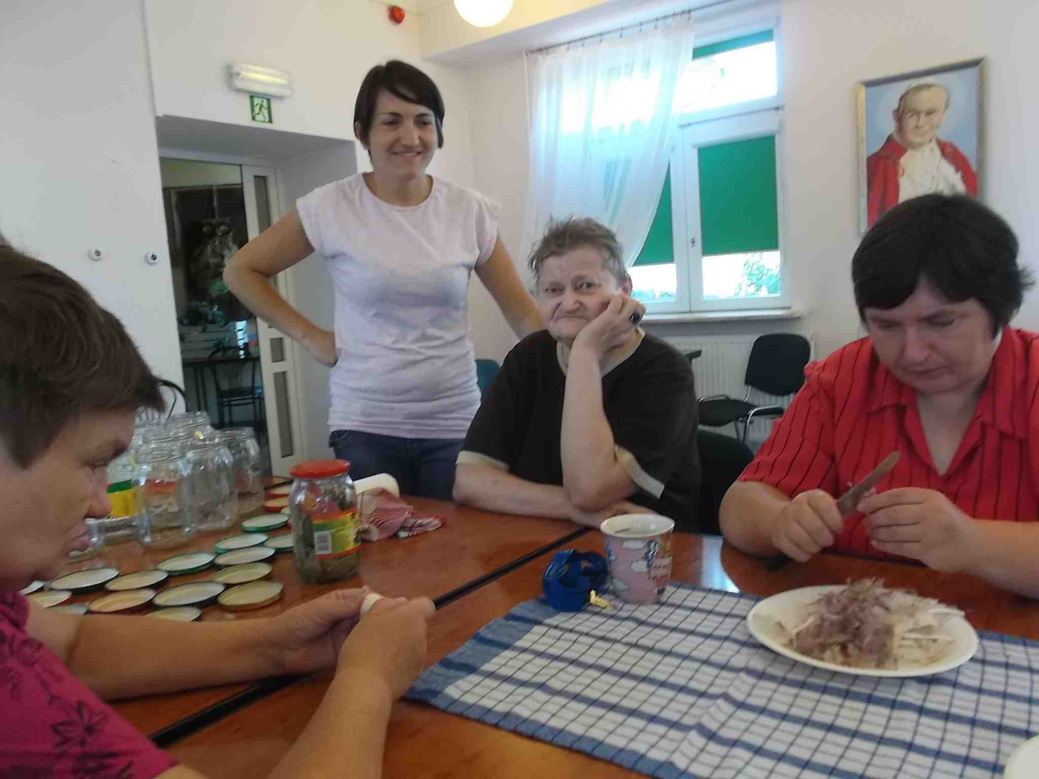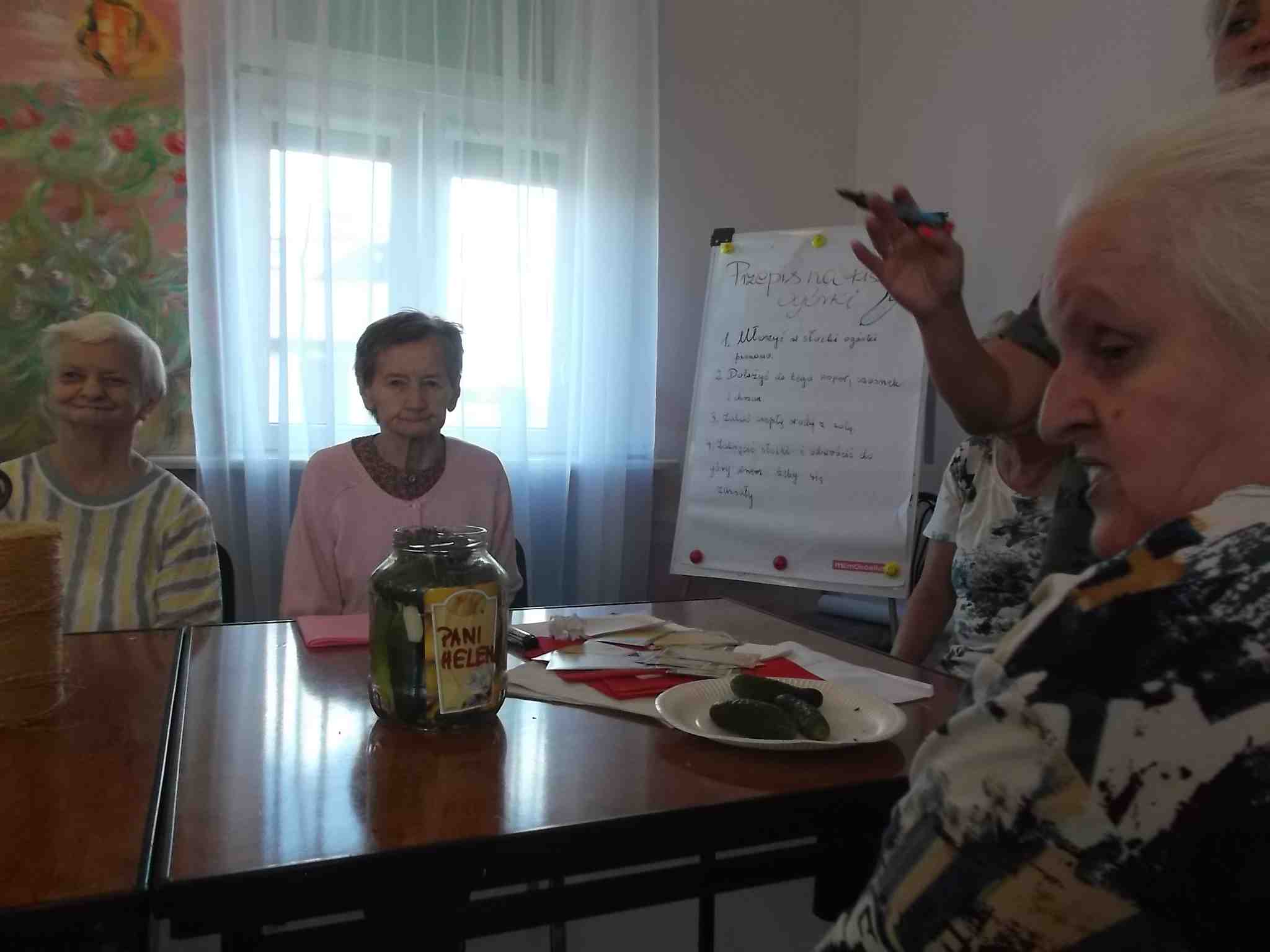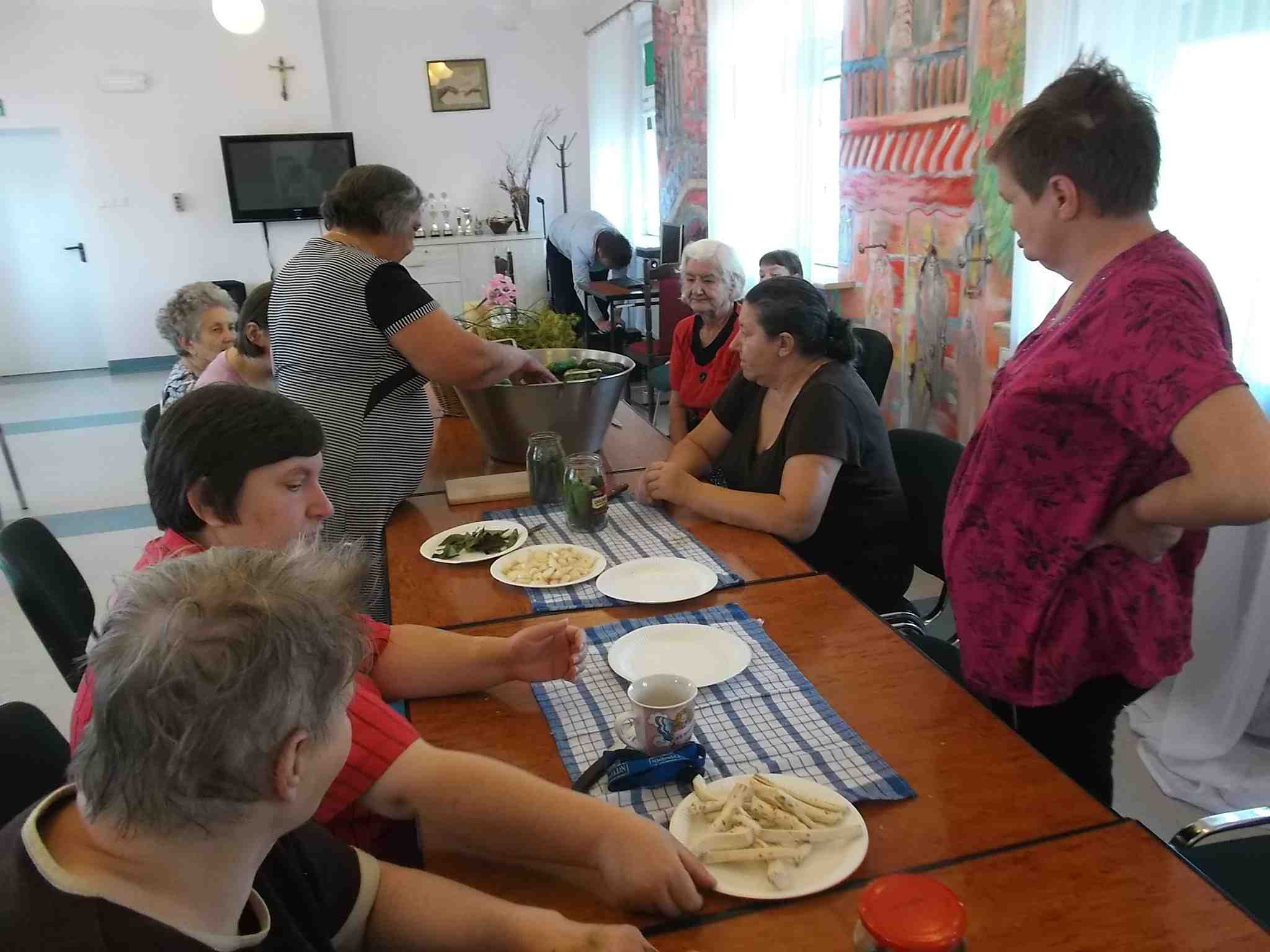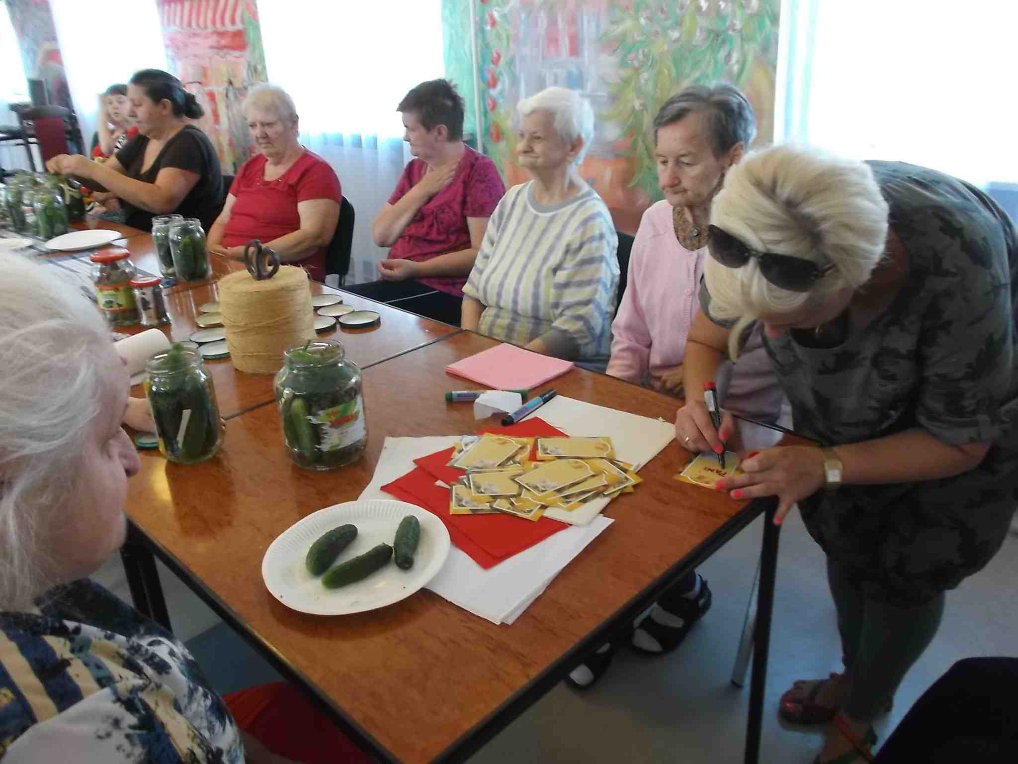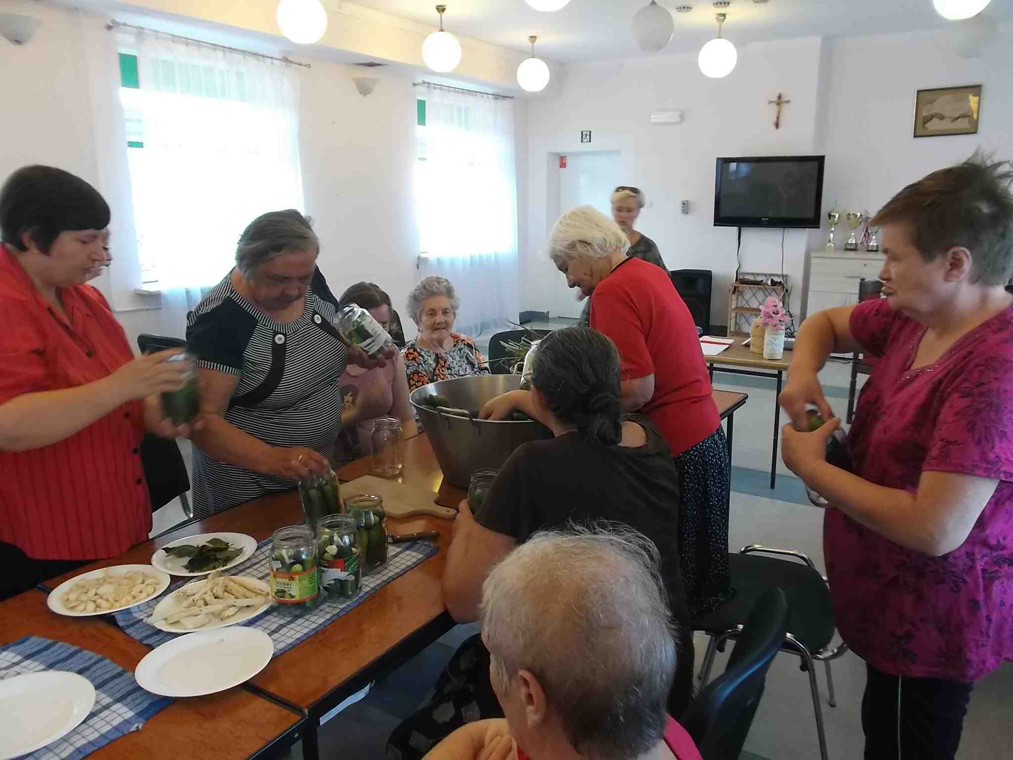 W sierpniu zaczynamy „sezonowe” zajęcia kulinarne, czyli przetwory z warzyw zgodnie z przepisami naszych mieszkanek. Zaczęliśmy od kiszenia ogórków wg przepisu pani Elżbiety. Ze względu na duże zainteresowanie naszych pań podobnymi zajęciami jeszcze w tym miesiącu planujemy kolejne przetwory – najpierw sałatki z ogórków, a w następnych tygodniach również z innych warzyw.