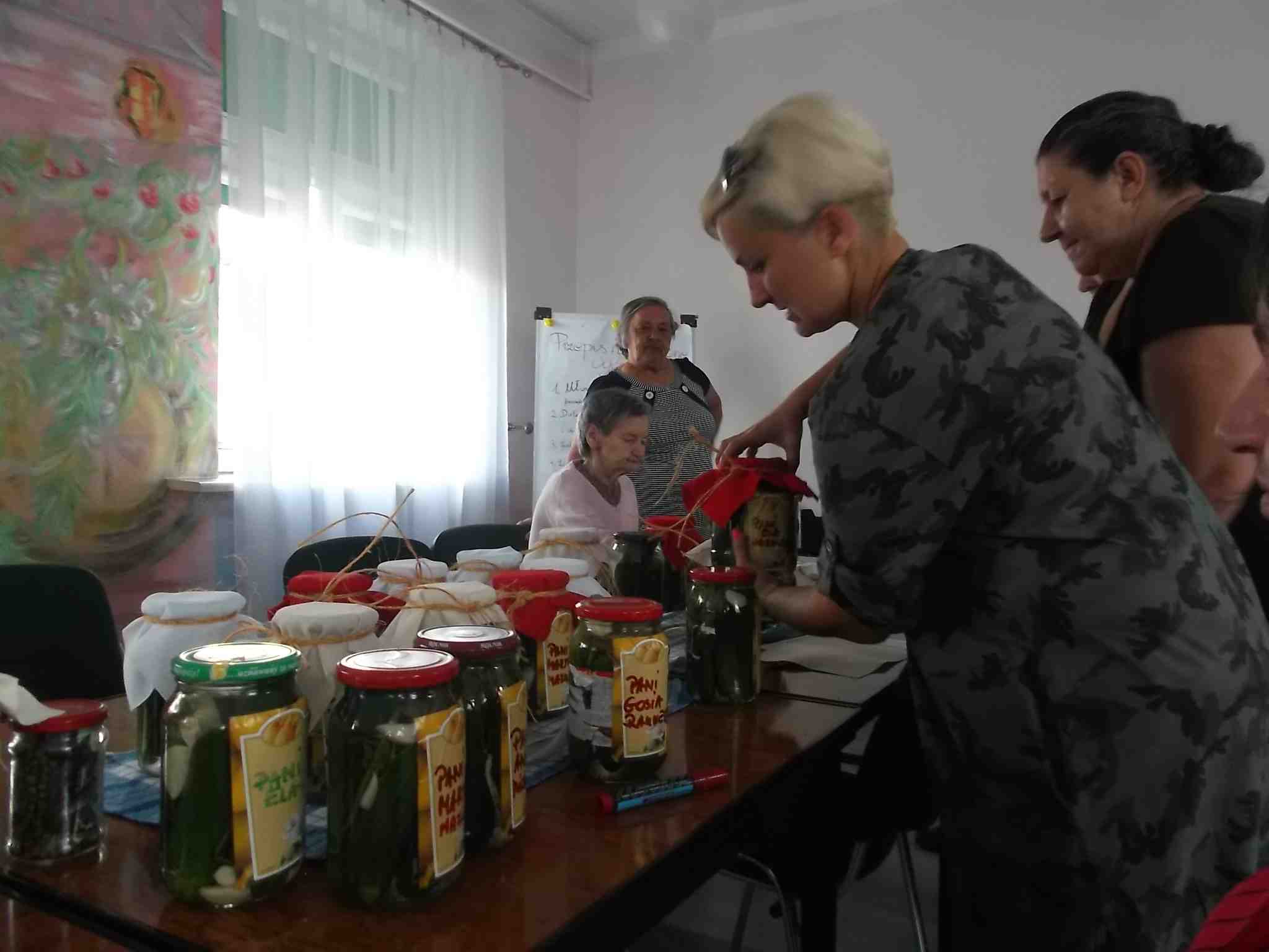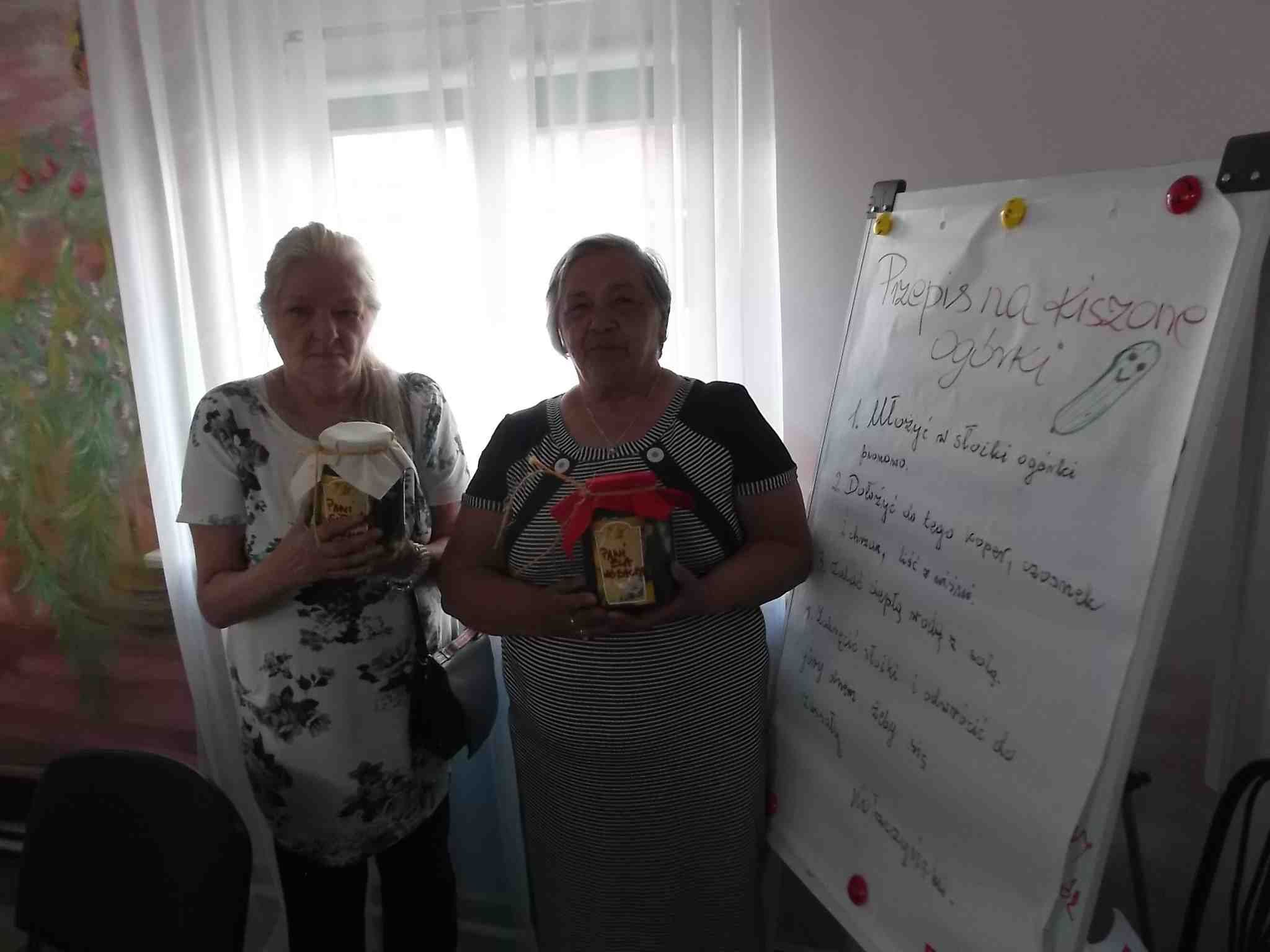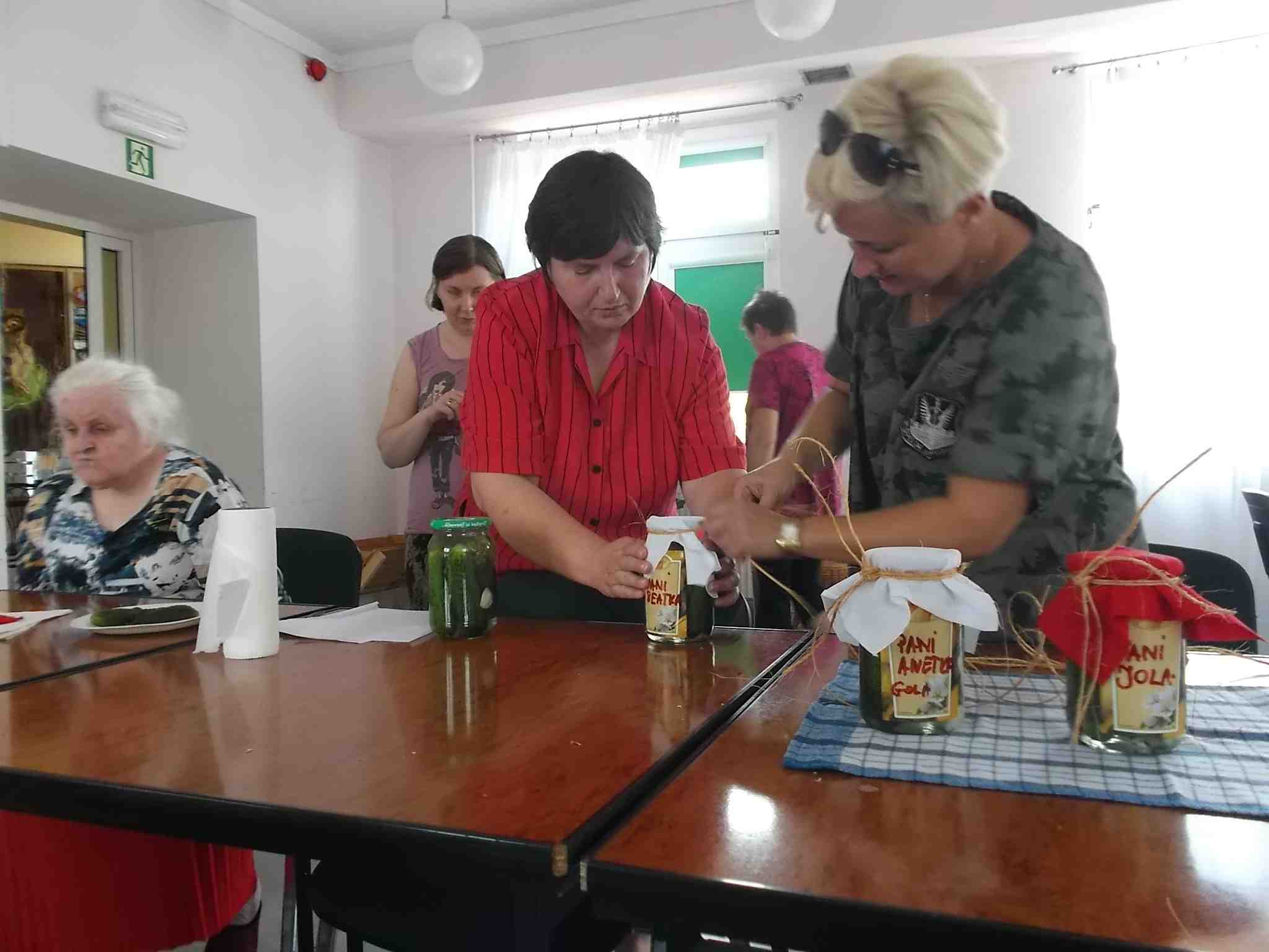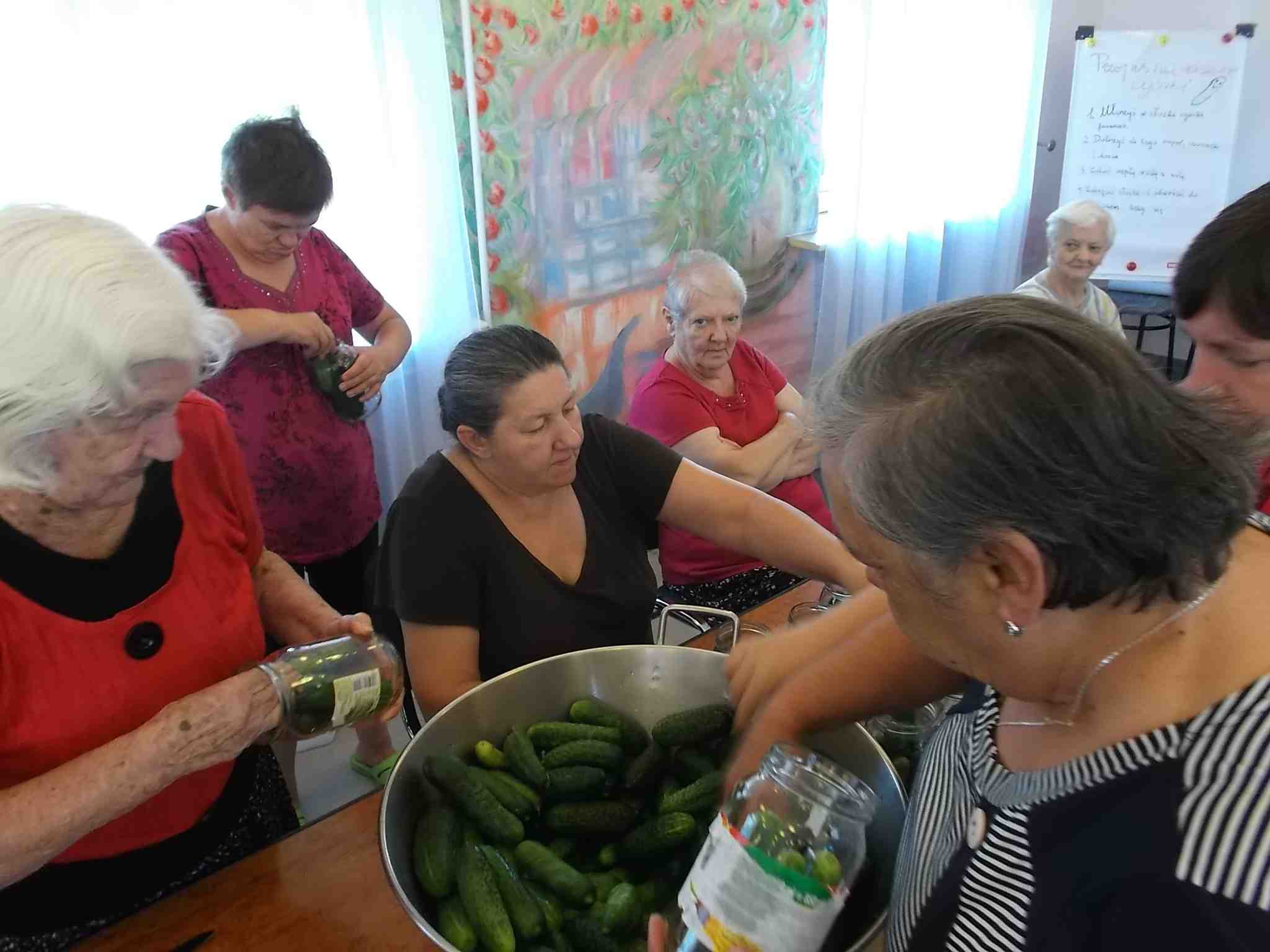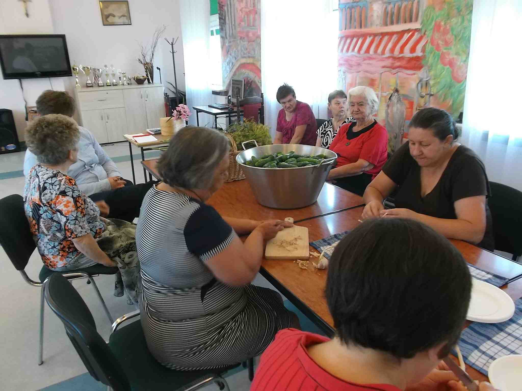 W sierpniu zaczynamy „sezonowe” zajęcia kulinarne, czyli przetwory z warzyw zgodnie z przepisami naszych mieszkanek. Zaczęliśmy od kiszenia ogórków wg przepisu pani Elżbiety. Ze względu na duże zainteresowanie naszych pań podobnymi zajęciami jeszcze w tym miesiącu planujemy kolejne przetwory – najpierw sałatki z ogórków, a w następnych tygodniach również z innych warzyw.