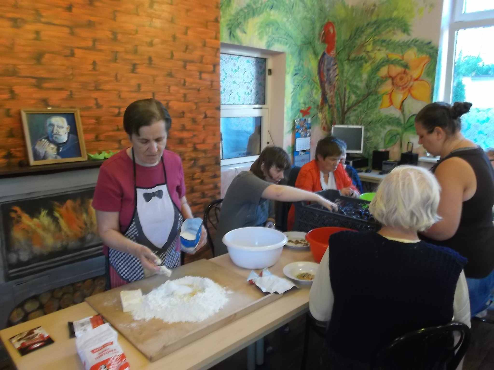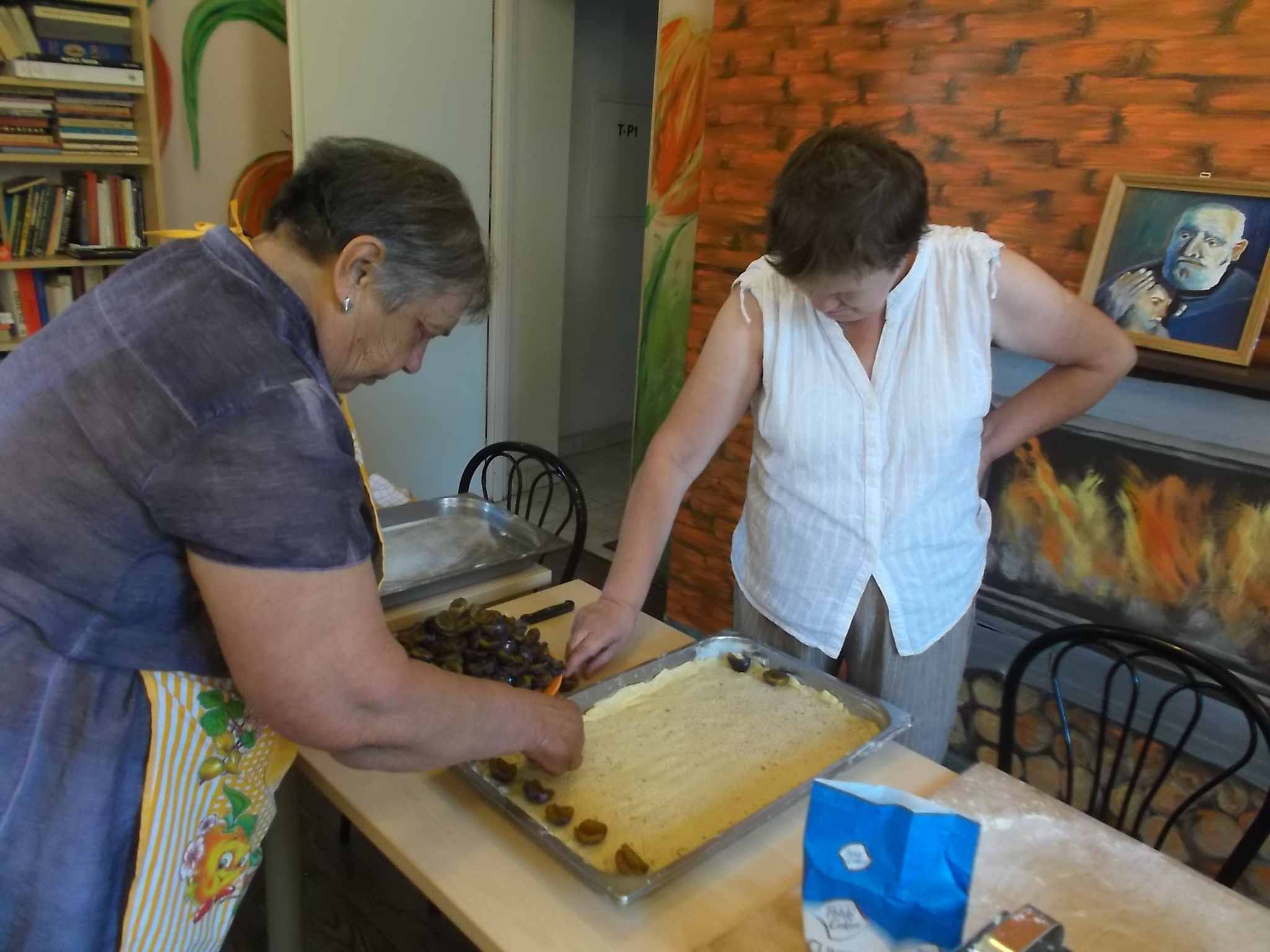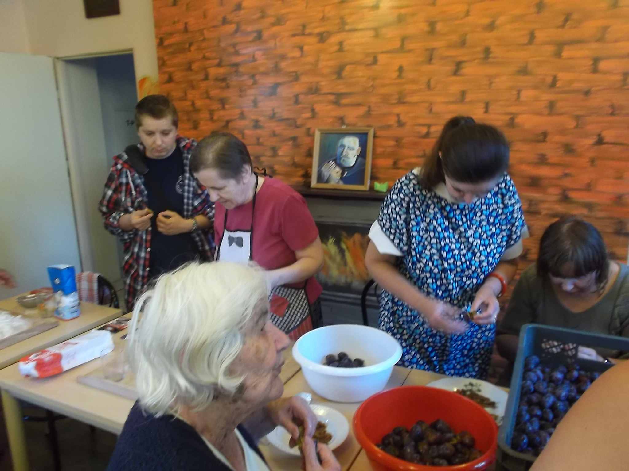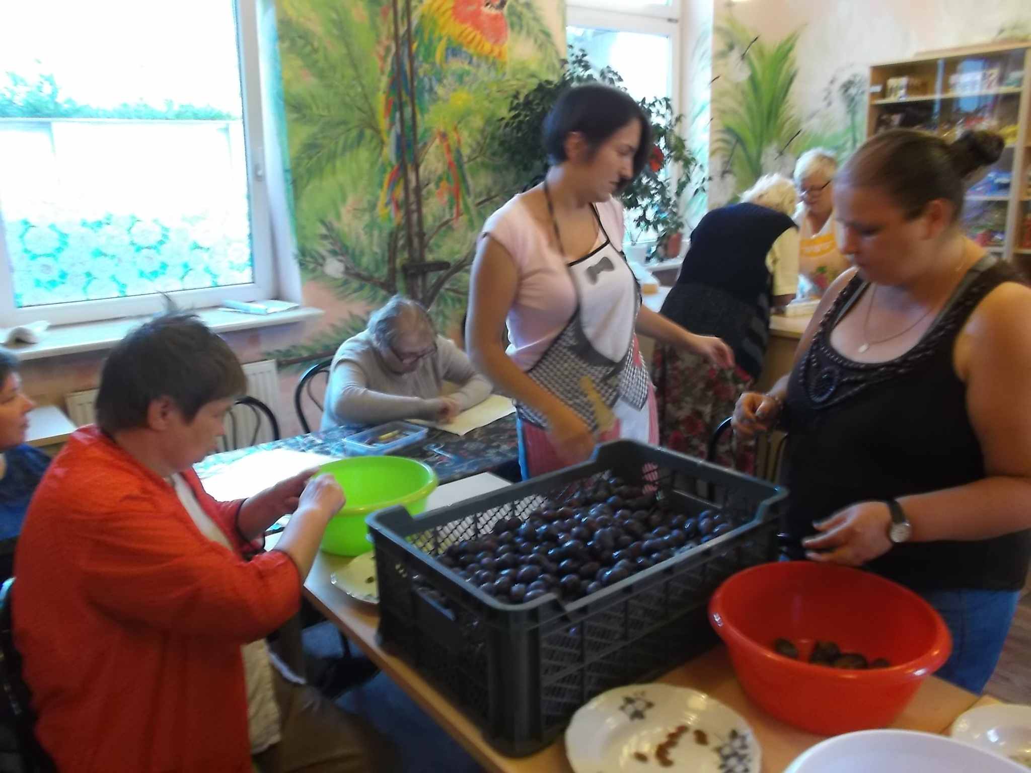 Mieszkanki przygotowały na zajęciach kulinarnych dwa ciasta ze śliwkami: kruche i drożdżowe. Każdy na miarę swoich możliwości mógł włączyć się w prace w kawiarence, np. przy przygotowaniu owoców. Do konsumpcji mieliśmy jeszcze więcej ochotników – nasze panie po raz kolejny dały popis kulinarnych umiejętności!