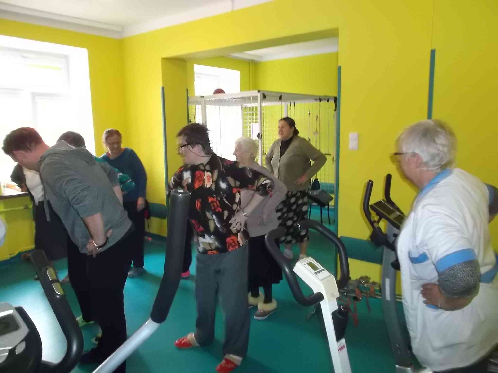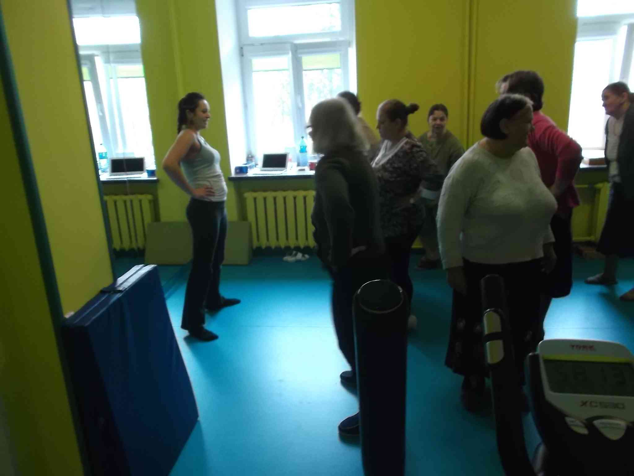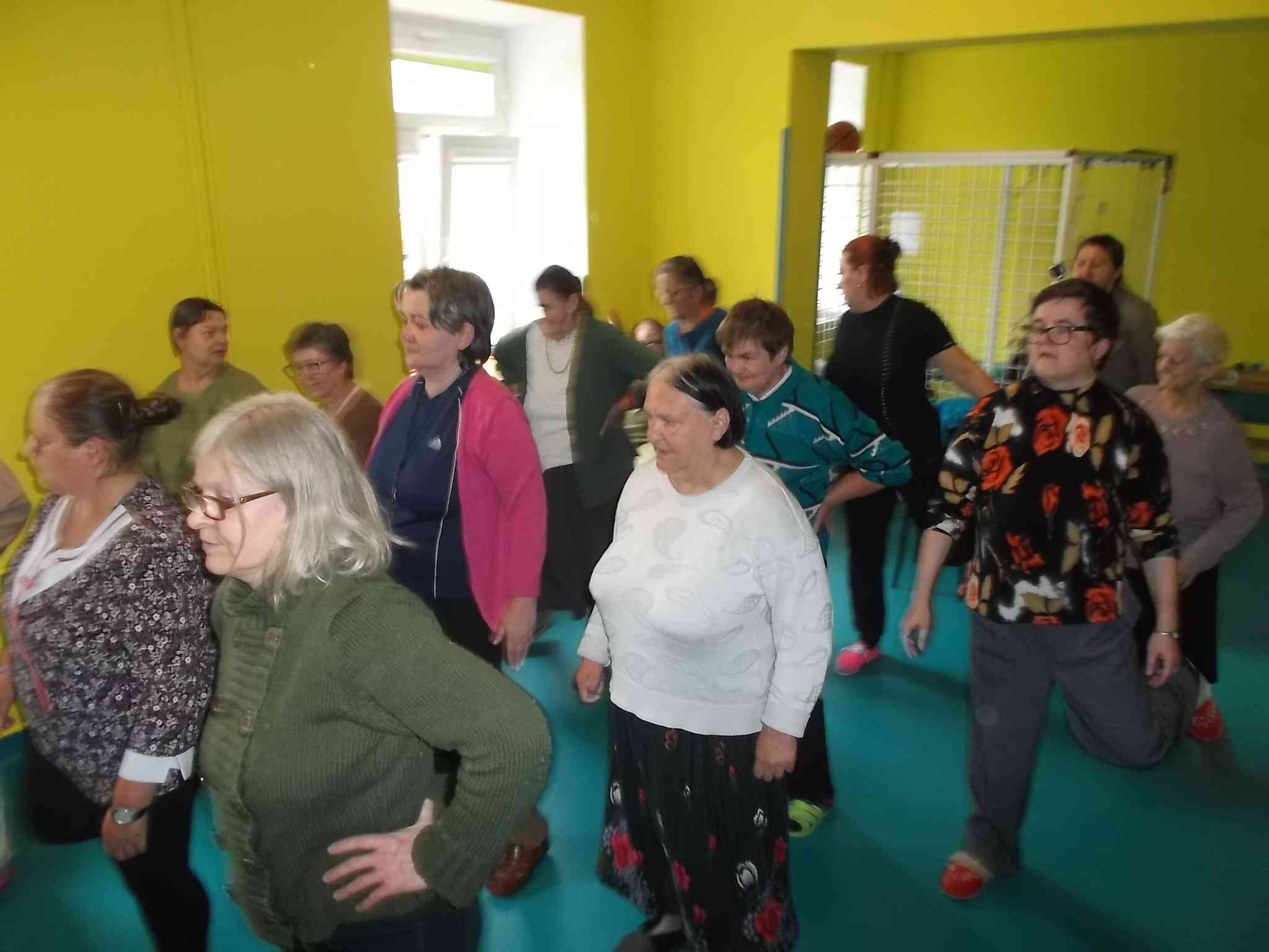 W czwartki zapraszamy mieszkanki do sali rehabilitacji na zajęcia fitness. Panie chętnie ćwiczą pod kierunkiem fizjoterapeutek.
