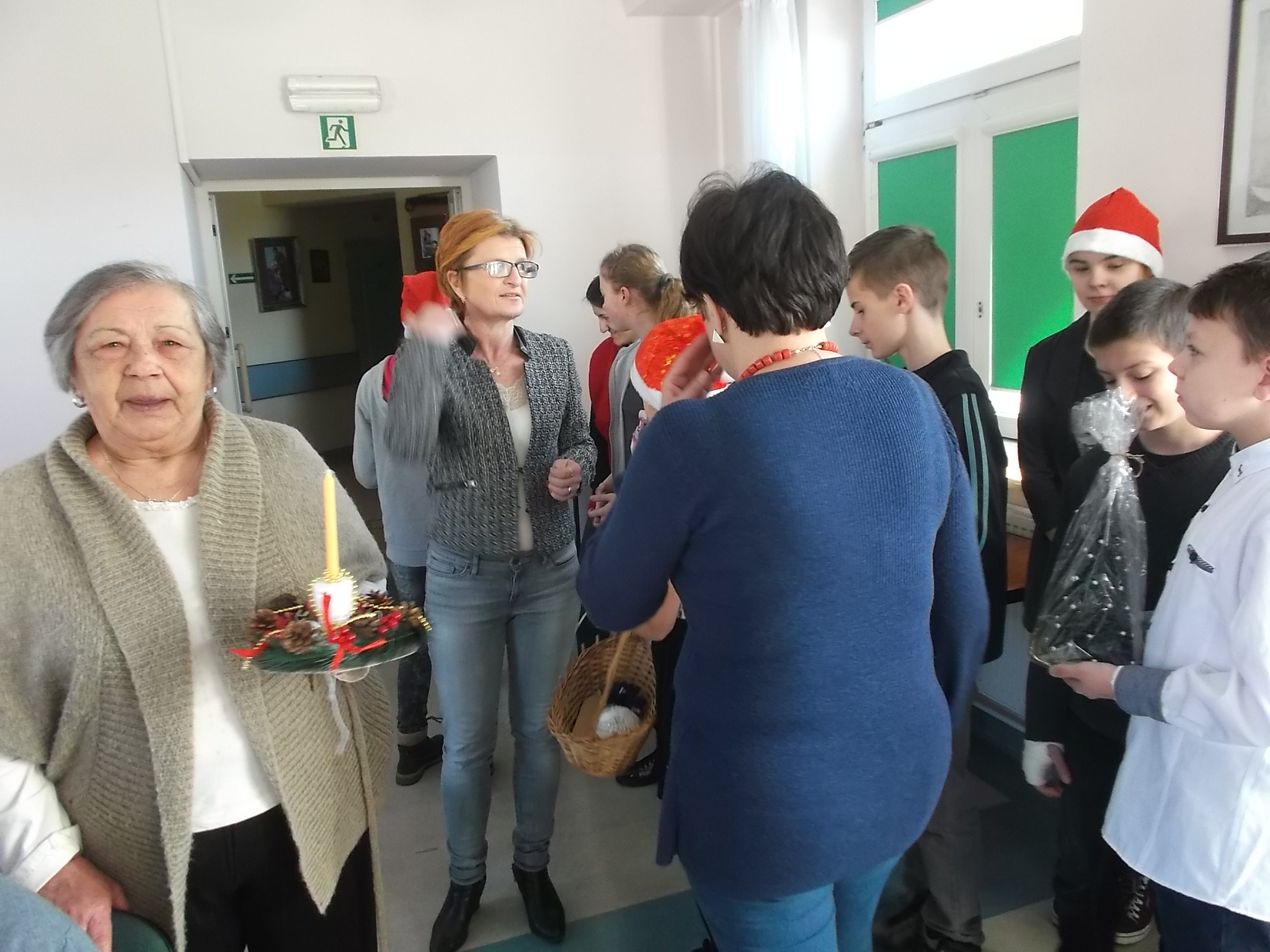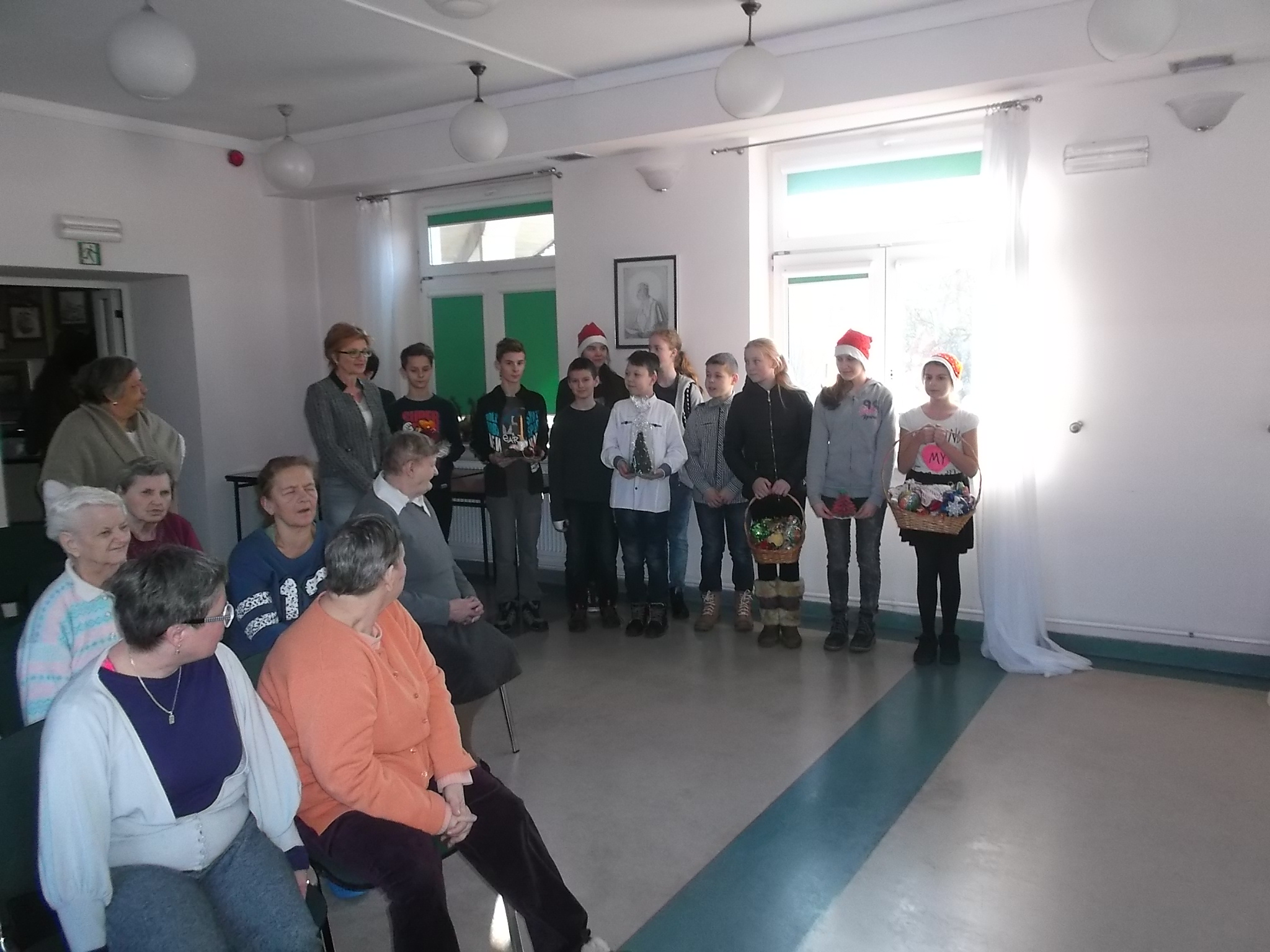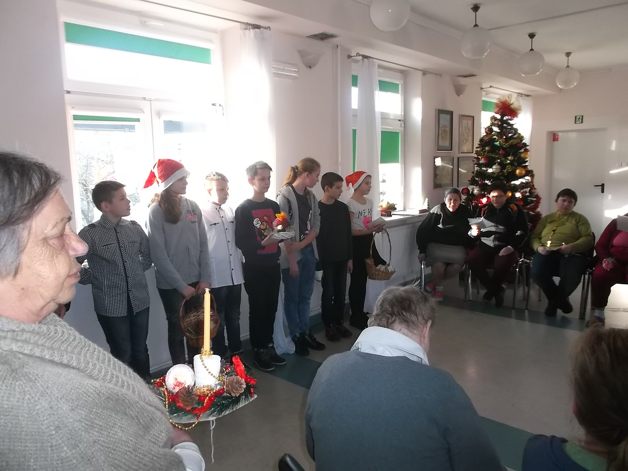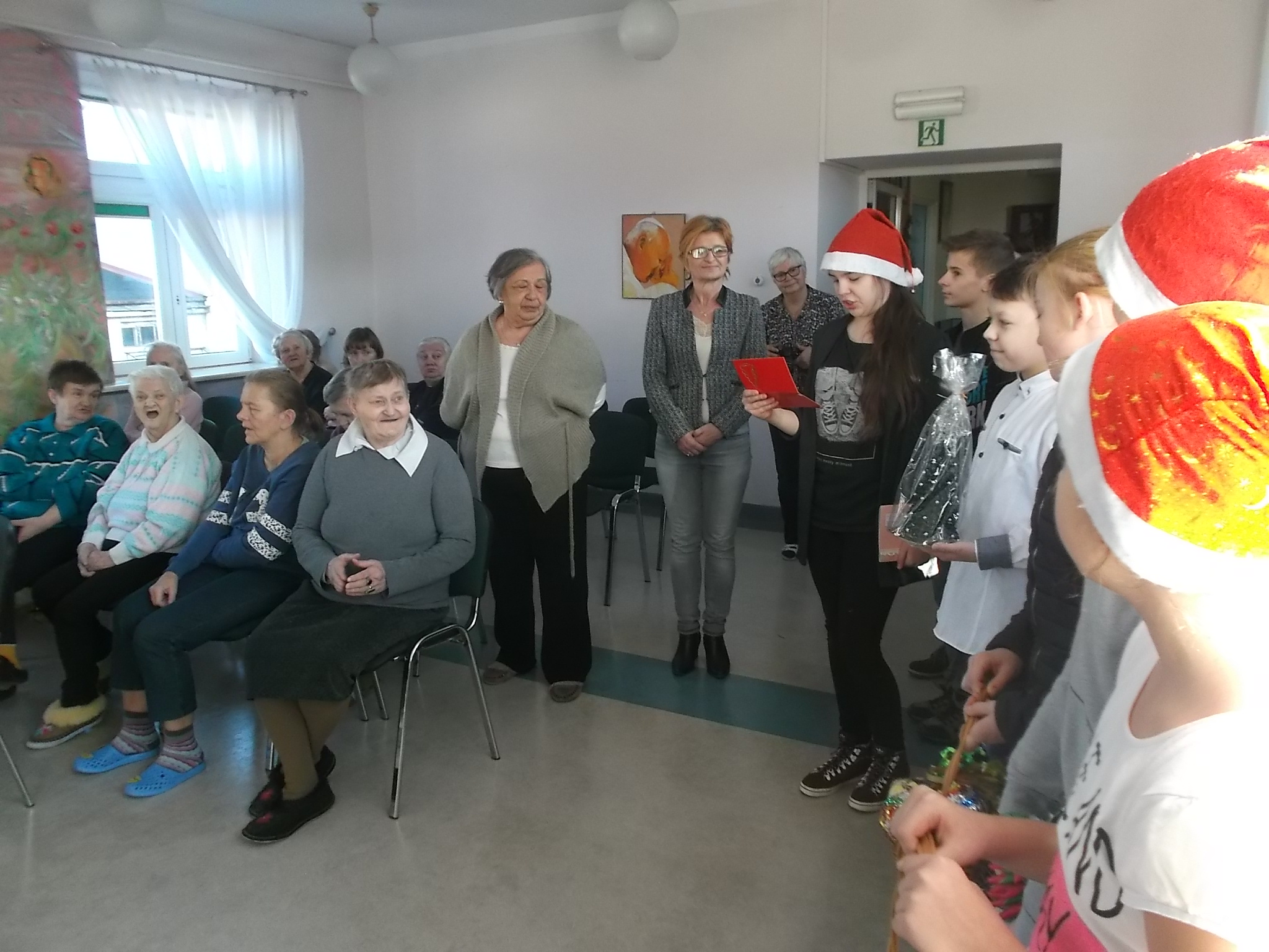 W dniu 21.12.2017 nasze mieszkanki przyjęły gości z SP nr 27. Szóstoklasiści sprezentowali naszym paniom własnoręcznie przygotowane ozdoby świąteczne – piękne bombki i inne ozdoby świąteczne wykonane przy pomocy różnych technik, a także stroik zrobiony specjalnie dla naszej 100-letniej mieszkanki, pani Anieli. Wspólnie śpiewaliśmy kolędy. Serdecznie dziękujemy za miłą wizytę!