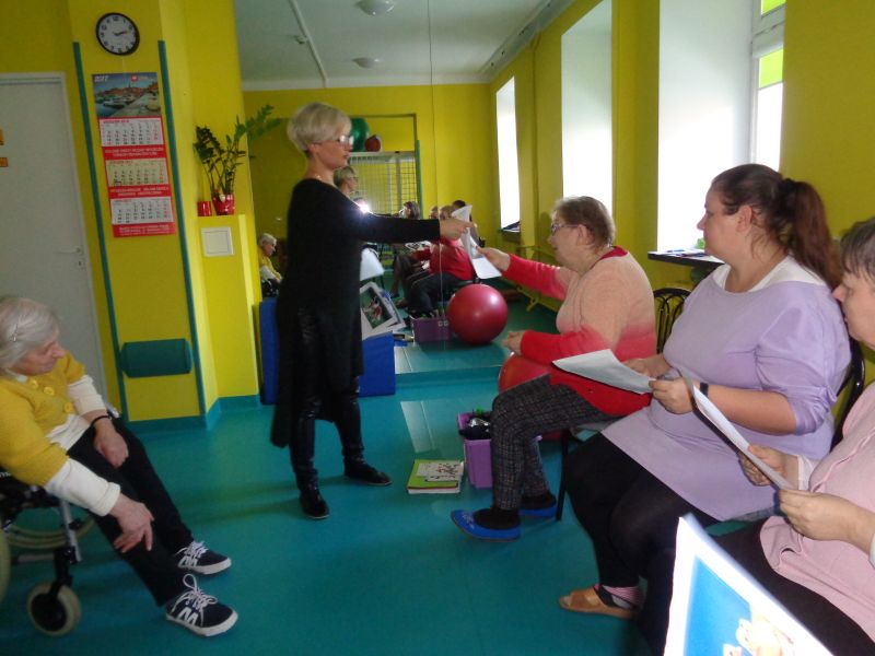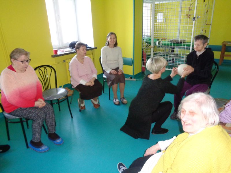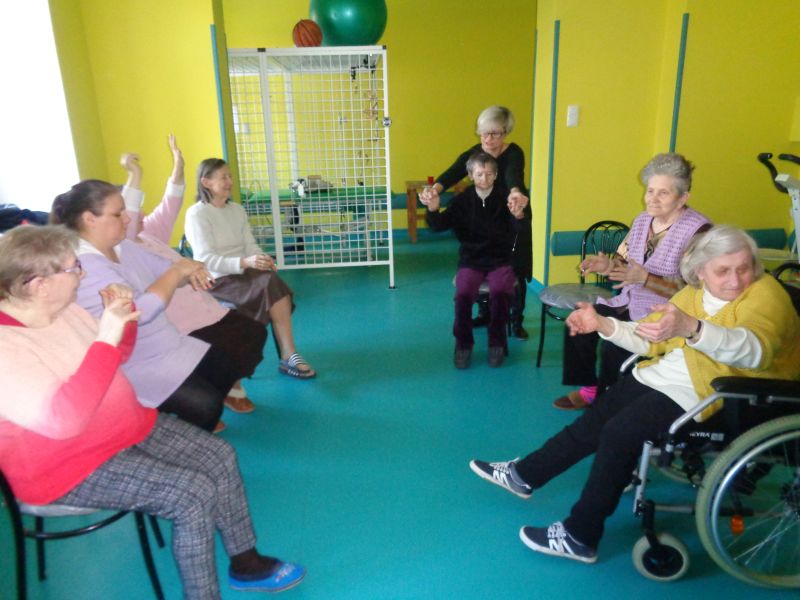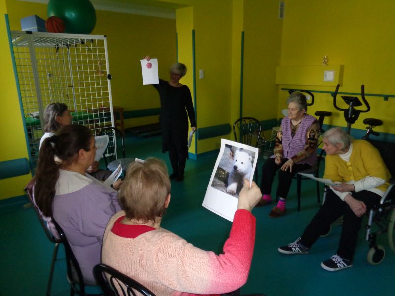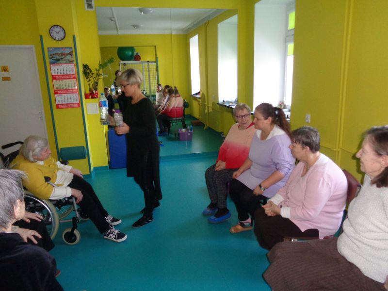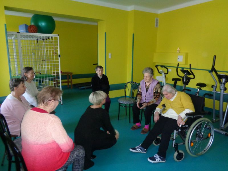 Terapeutka Kinga Groszczyńska-Mazur prowadziła w styczniu w sali rehabilitacji specjalne zajęcia dla mieszkanek z zespołami otępiennymi. Na zajęciach mieszkanki biorą udział w treningach orientacji w czasie, ćwiczą pamięć i sprawność ruchową.