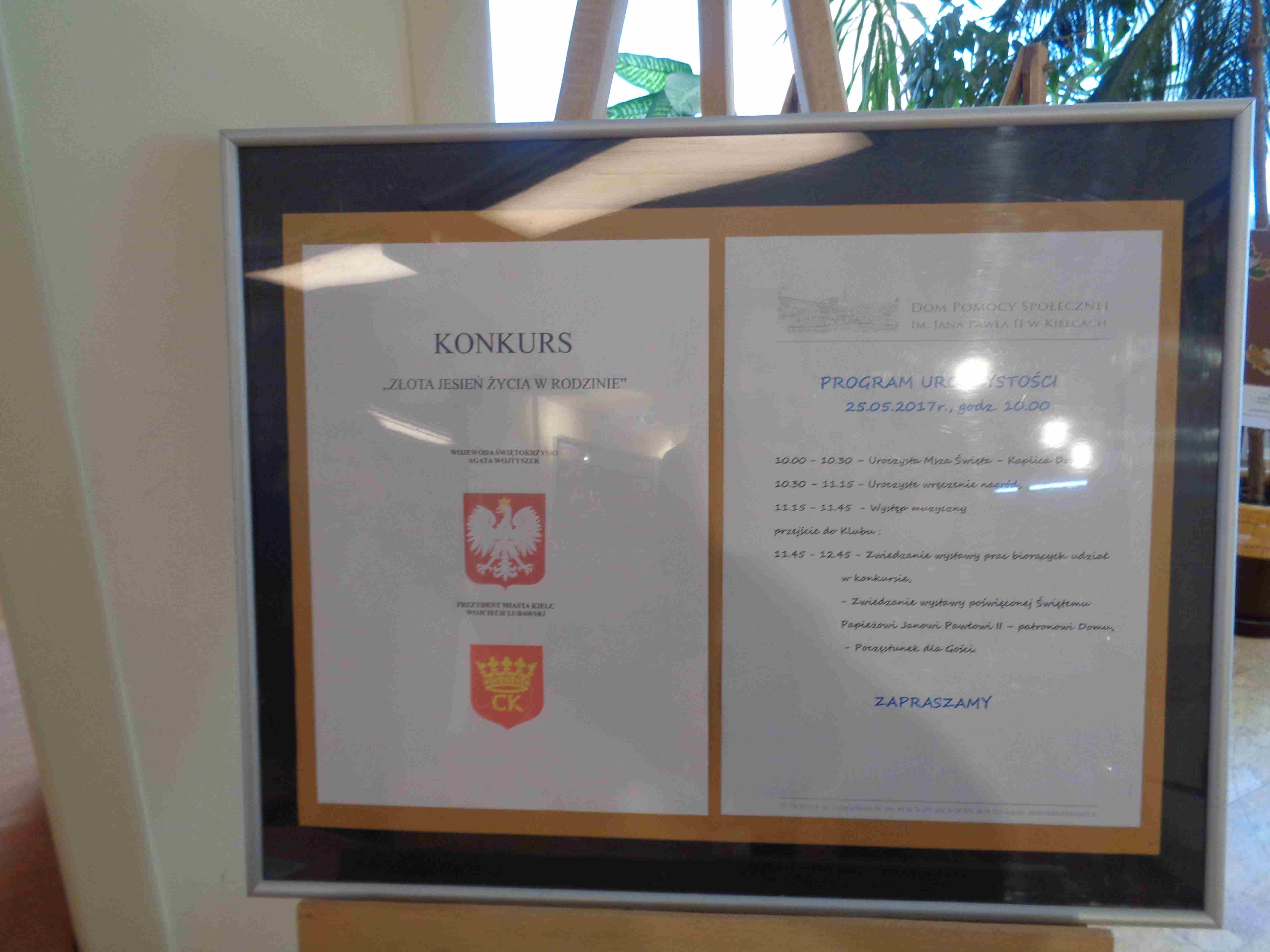 W dn. 25.05.2017 wzięliśmy udział w uroczystym rozdaniu nagród w konkursie plastycznym „Złota jesień życia w rodzinie” zorganizowanym przez Dom Pomocy Społecznej im. Jana Pawła II. Imprezę uświetniły występy wokalne utalentowanych solistów ze Szkoły Muzycznej. Nasza mieszkanka Anna Michalewicz zdobyła wyróżnienie w kategorii collage za pracę „Śpiewająca muszla koncertowa” i udzieliła wywiadu dla kieleckiego „Echa Dnia”! Wszystkim nagrodzonym serdecznie gratulujemy!