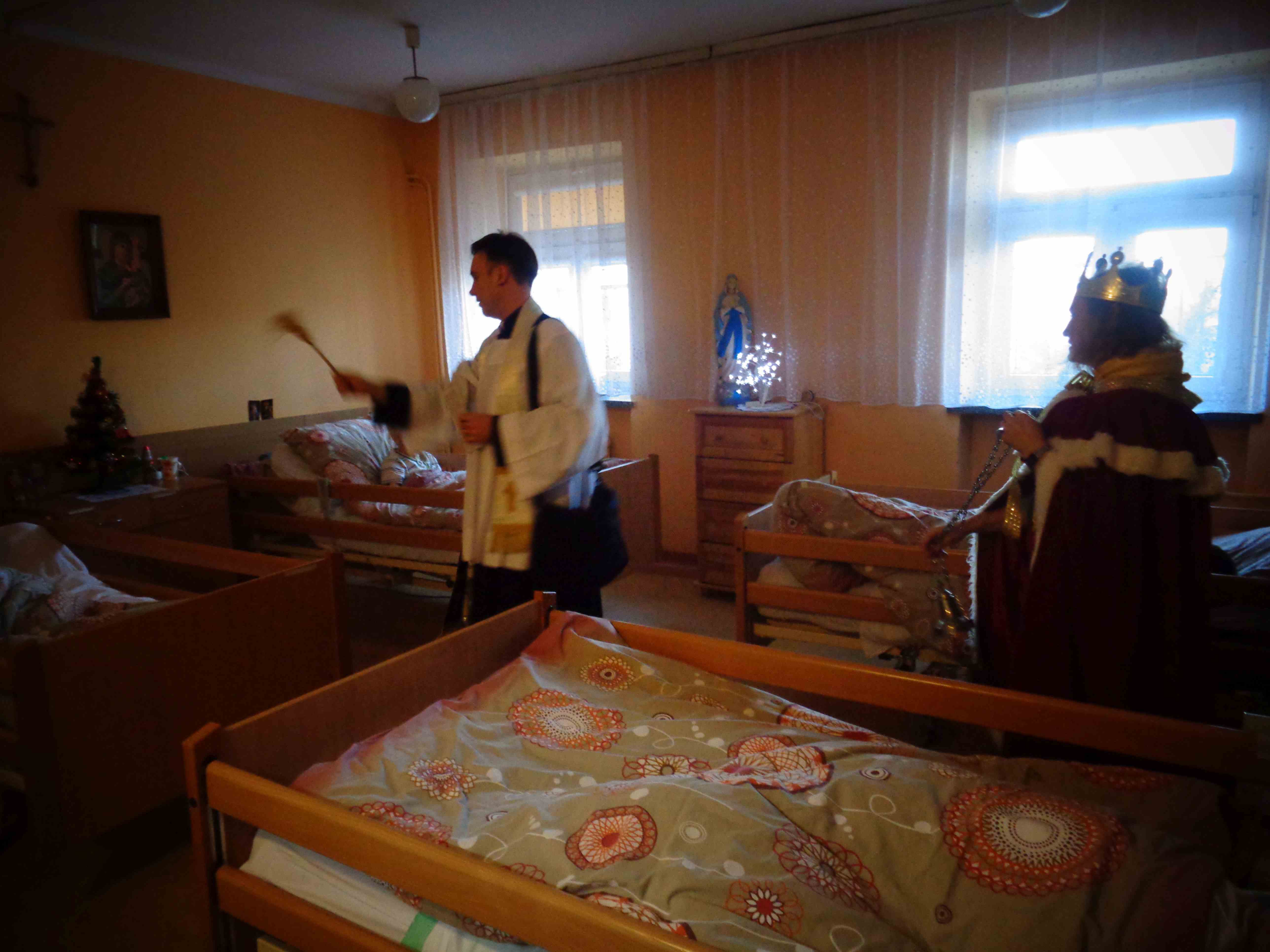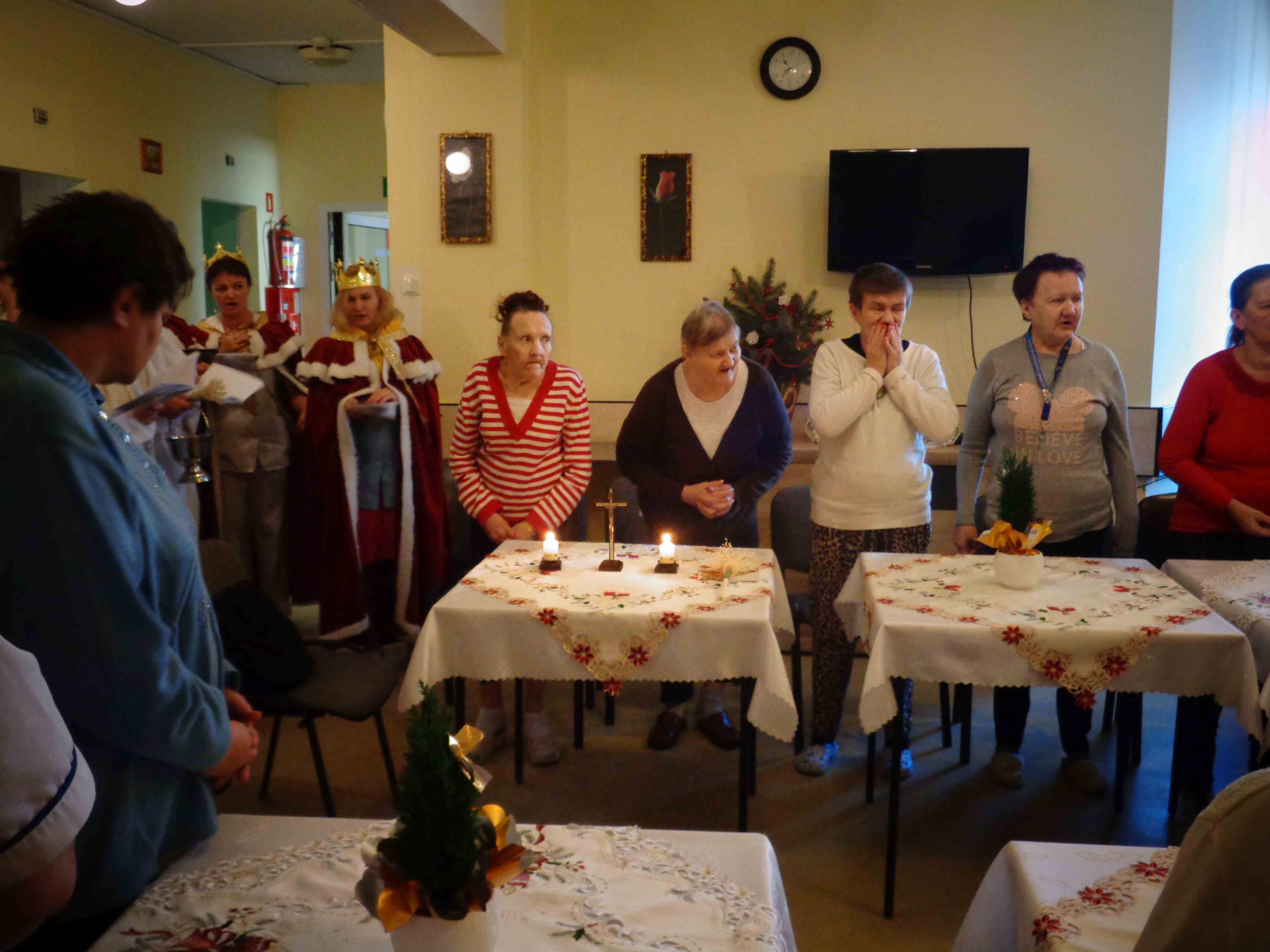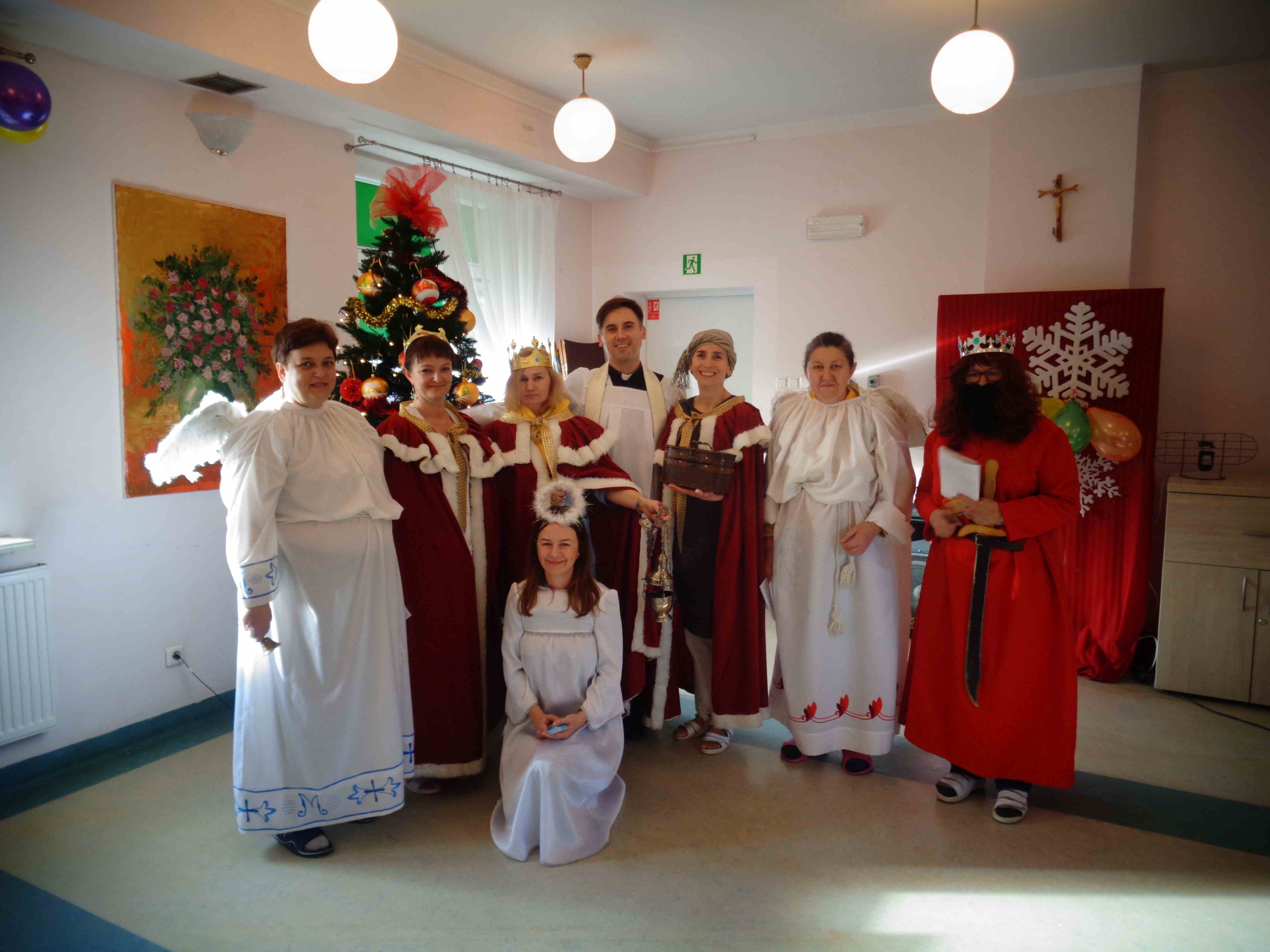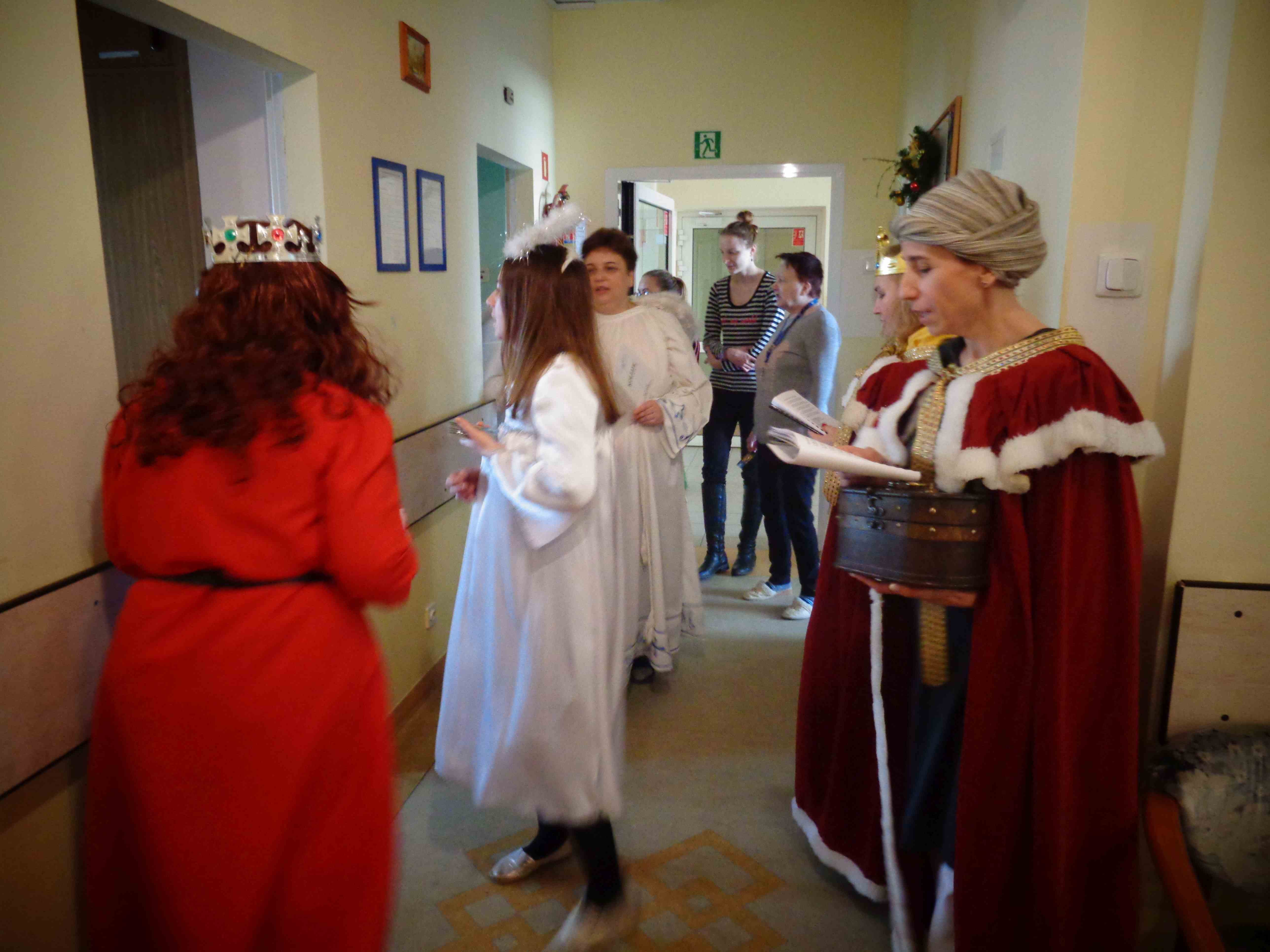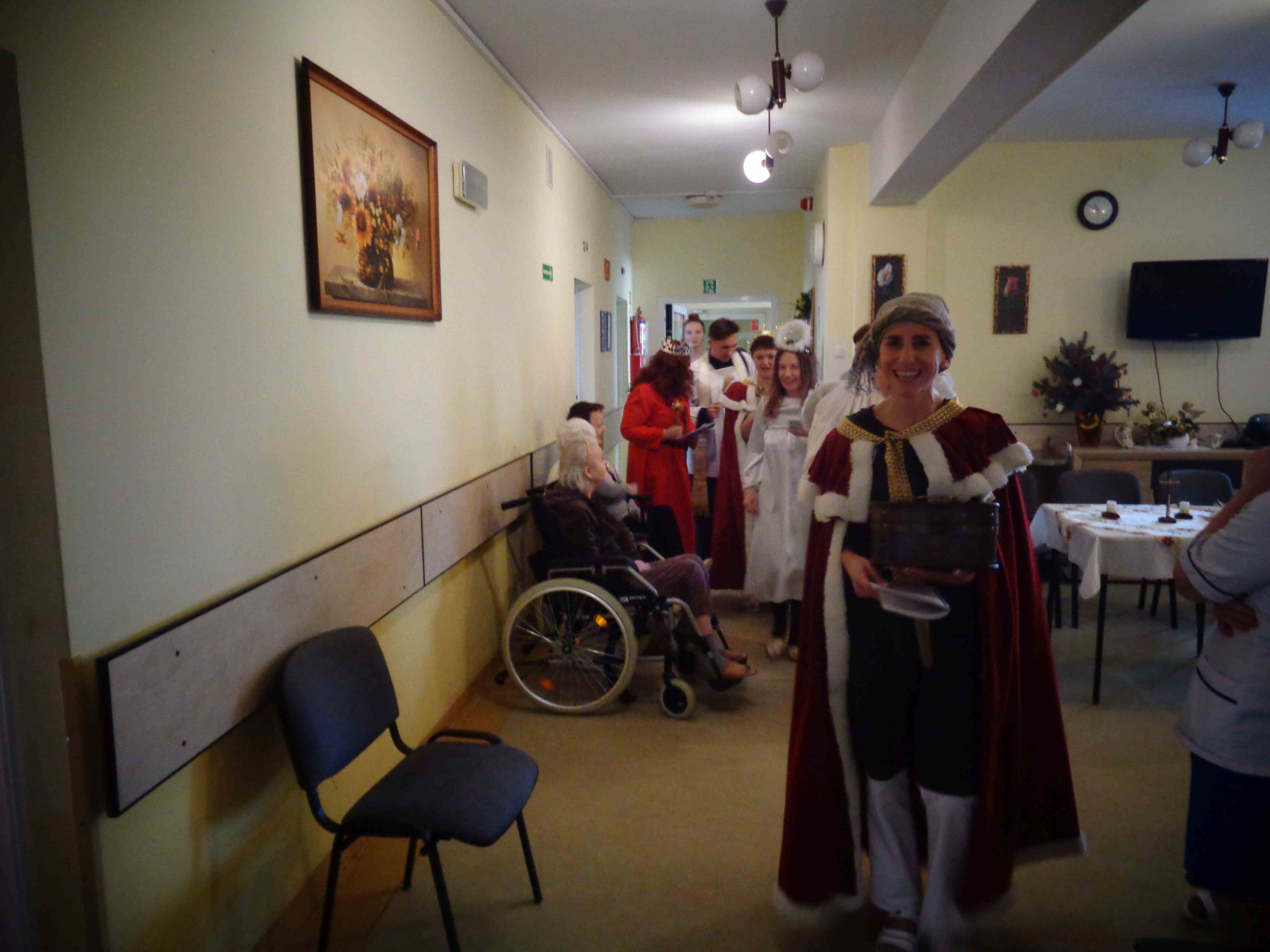 Dzień przed Świętem Trzech Króli w naszym Domu odbyła kolęda. Ks. kapelan Sebastian Lewczuk poświęcił pokoje mieszkanek, wspólne świetlice, pracownie terapii i rehabilitacji. Z roku na rok nasz orszak kolędników zasila coraz więcej osób – tym razem pracownicy i mieszkanki wcielili się w role króli, aniołów i Heroda. W przyszłym roku grono kolędników jeszcze się powiększy!