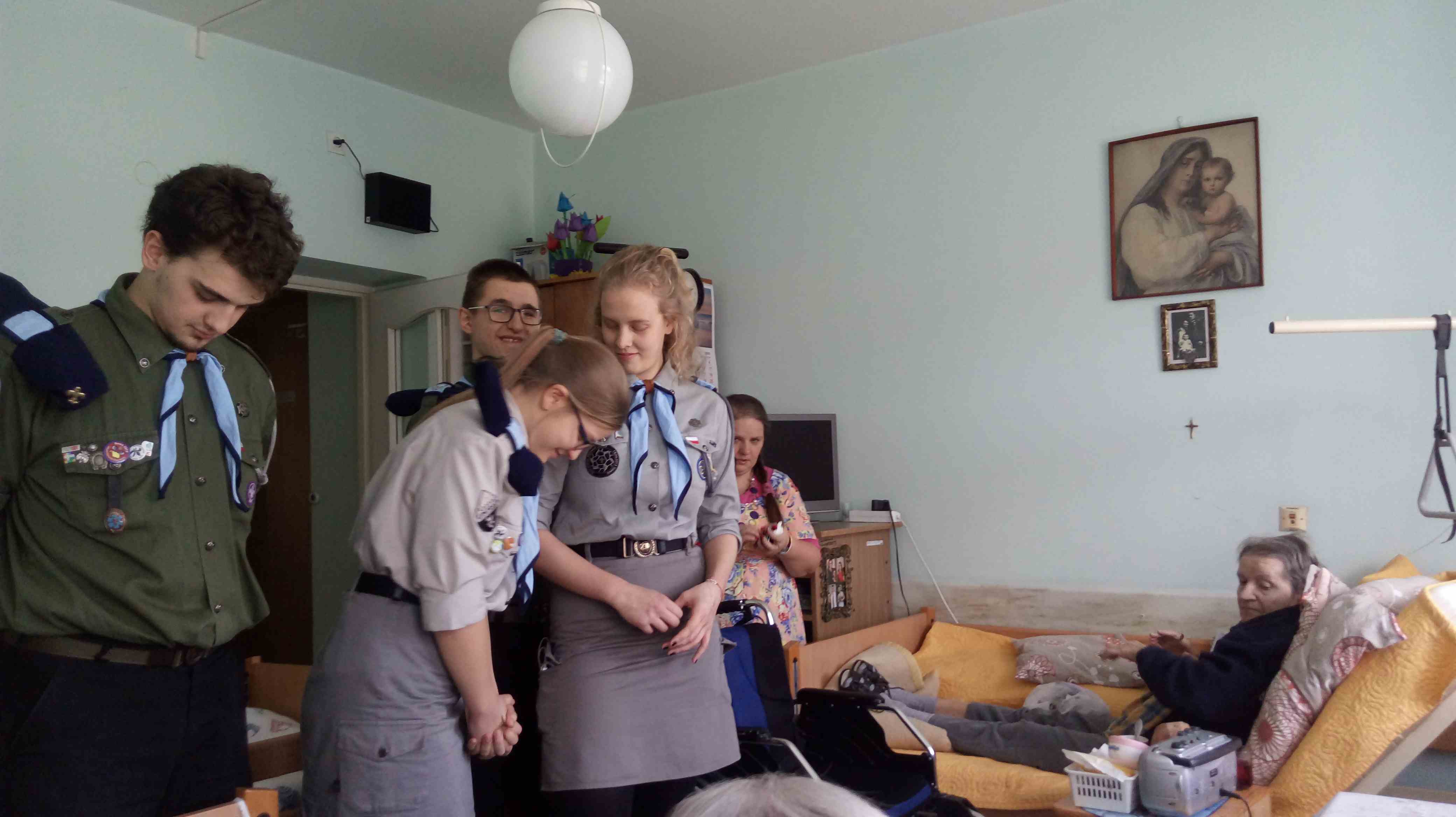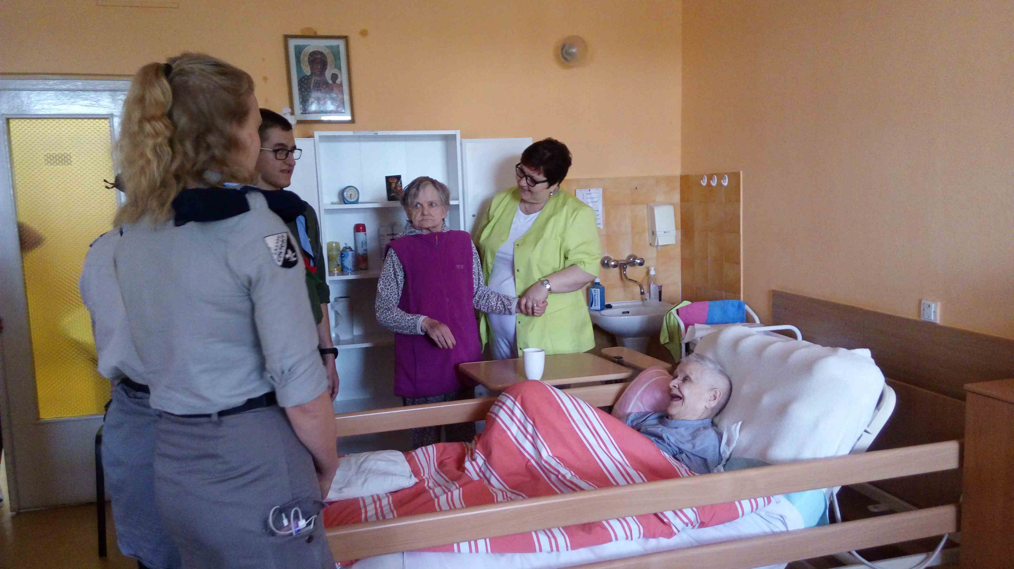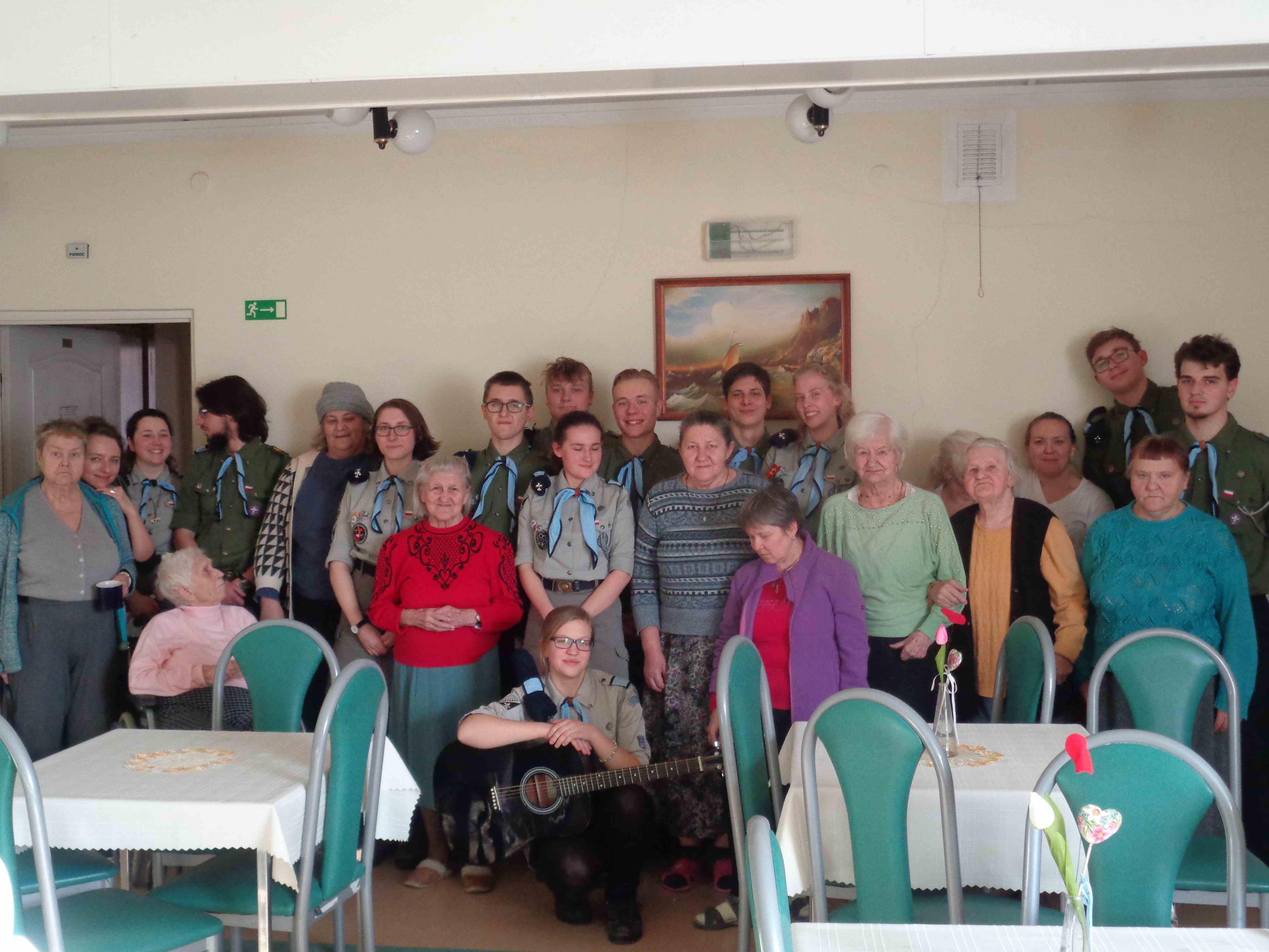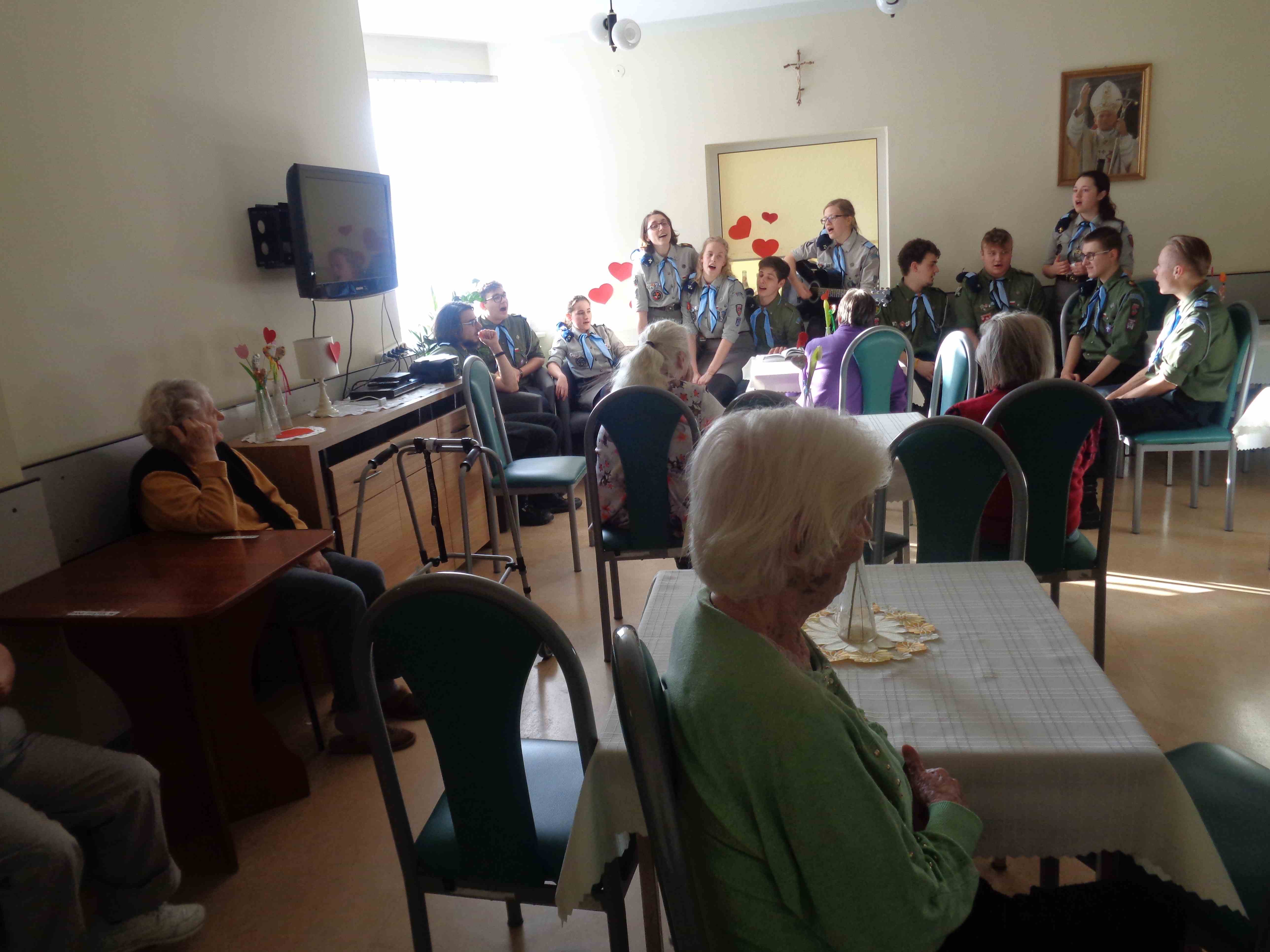 Serdecznie dziękujemy Drużynie Wędrowniczej z Poznania za spędzenie całego dnia razem z nami! Harcerze przygotowali dla mieszkanek nietypowy klub podróżnika – pokazali zdjęcia i opowiedzieli o swoim rodzinnym mieście. Przedstawili nam również zwyczaje i piosenki harcerskie. Po obiedzie odwiedzali panie w pokojach, czas upłynął na rozmowach i wspólnym śpiewaniu. To bardzo ważna i miła dla nas wizyta, dziękujemy i raz jeszcze życzymy młodym harcerzom zapału w realizacji podobnych inicjatyw!