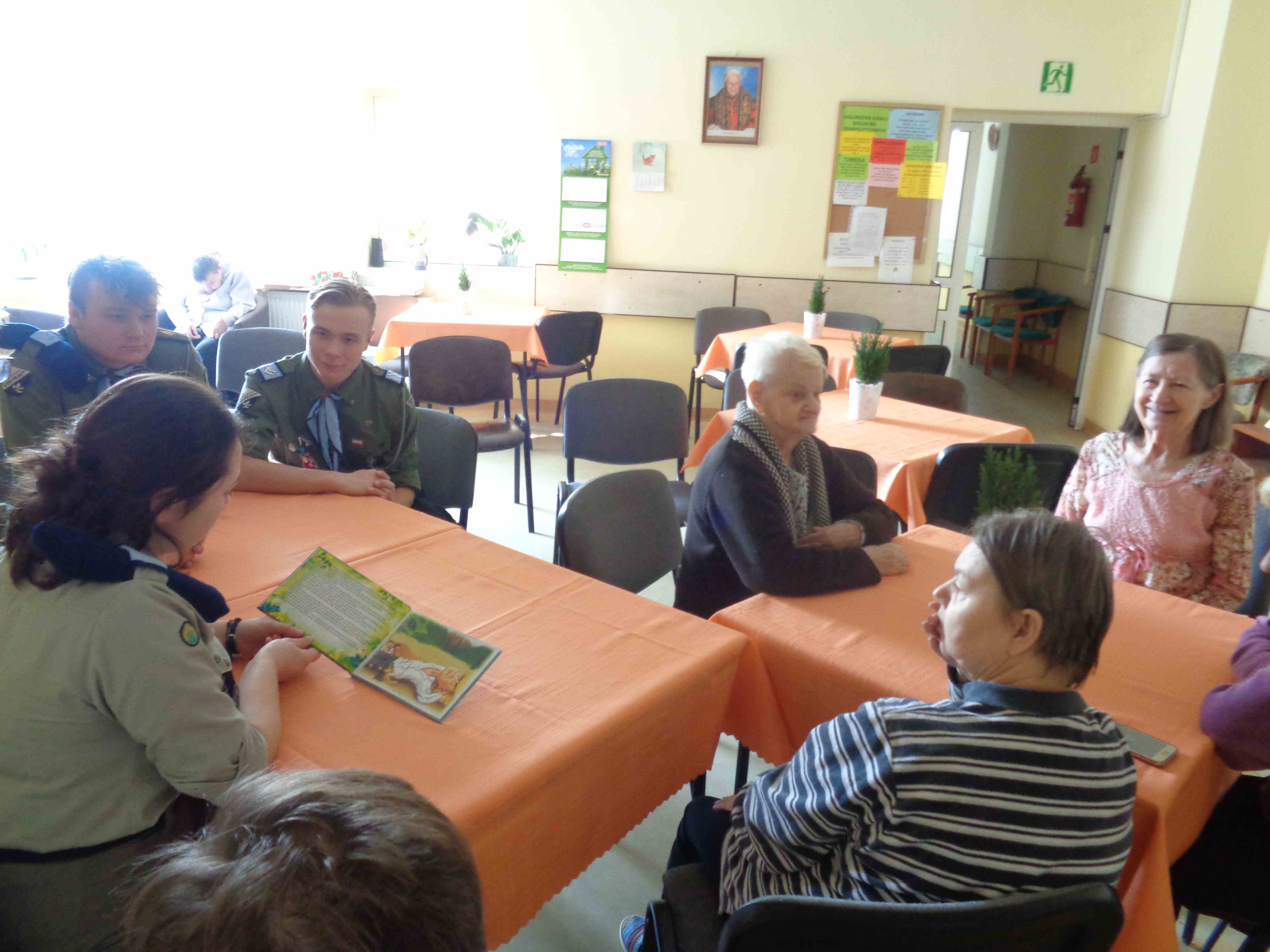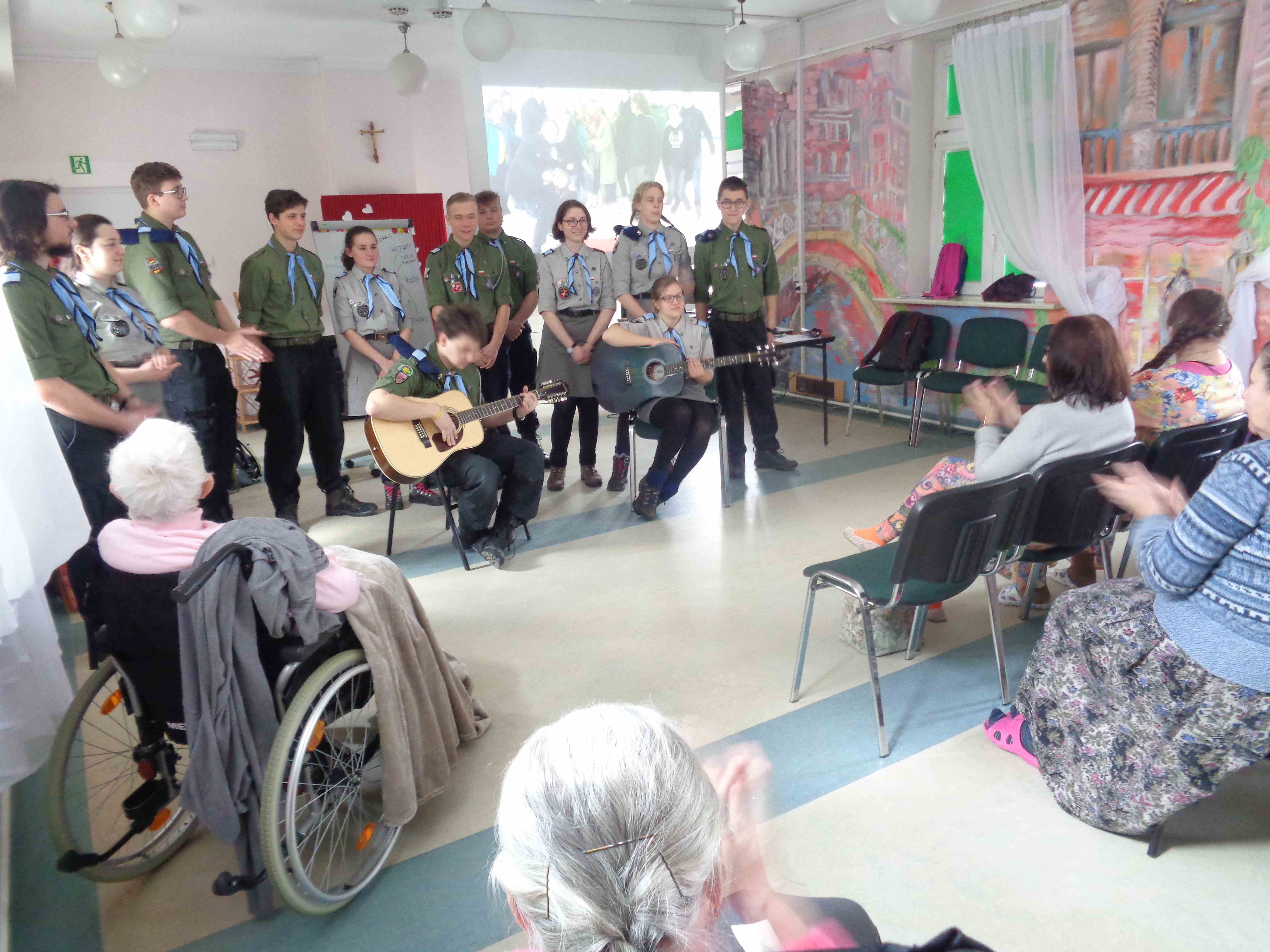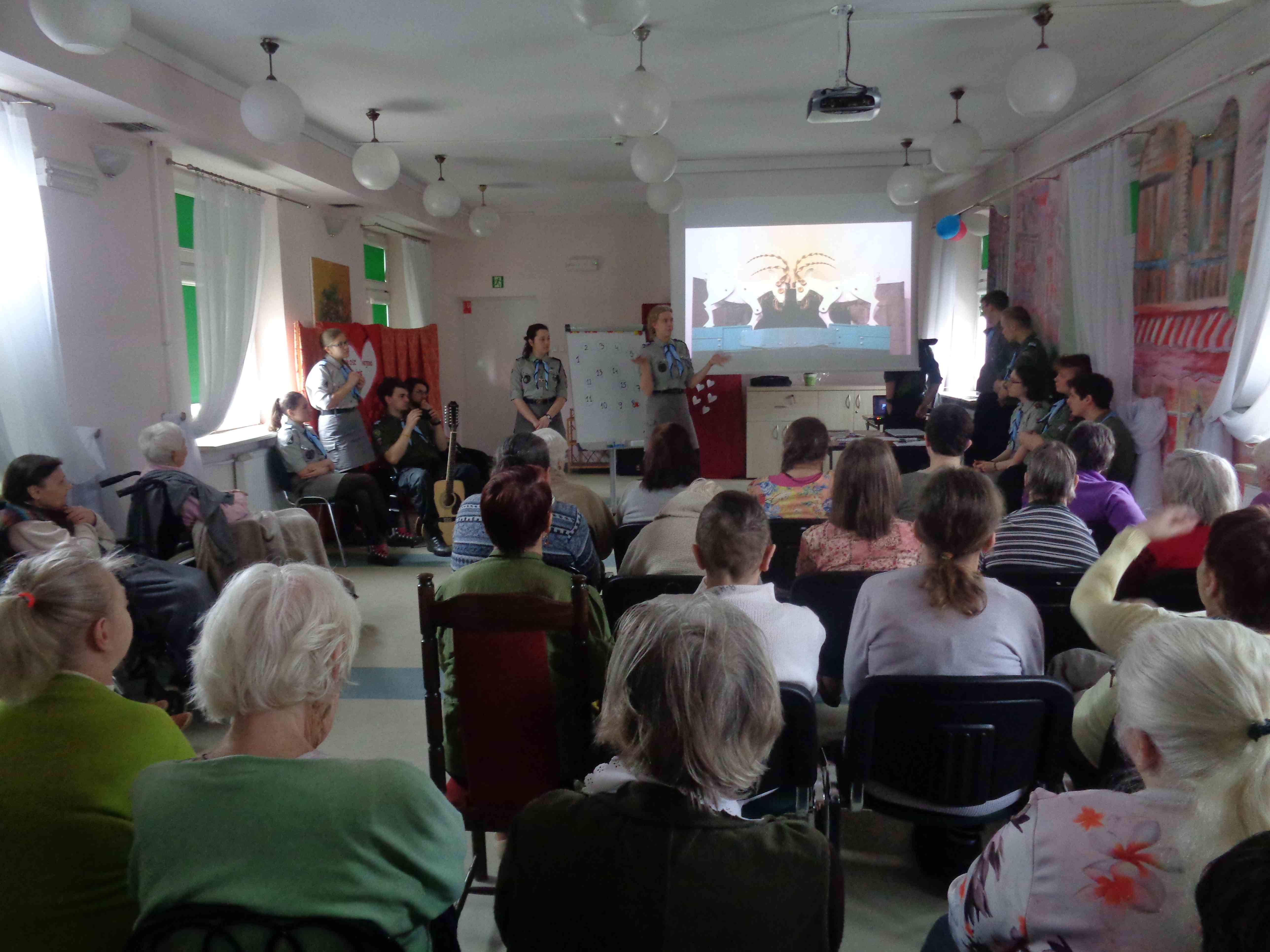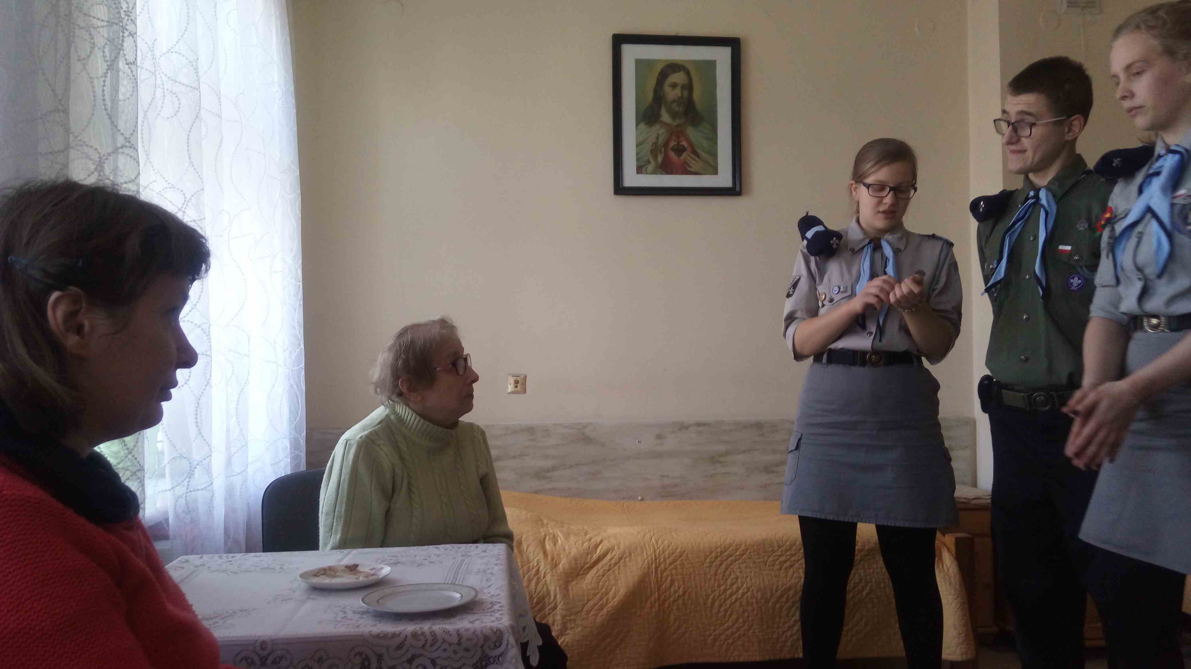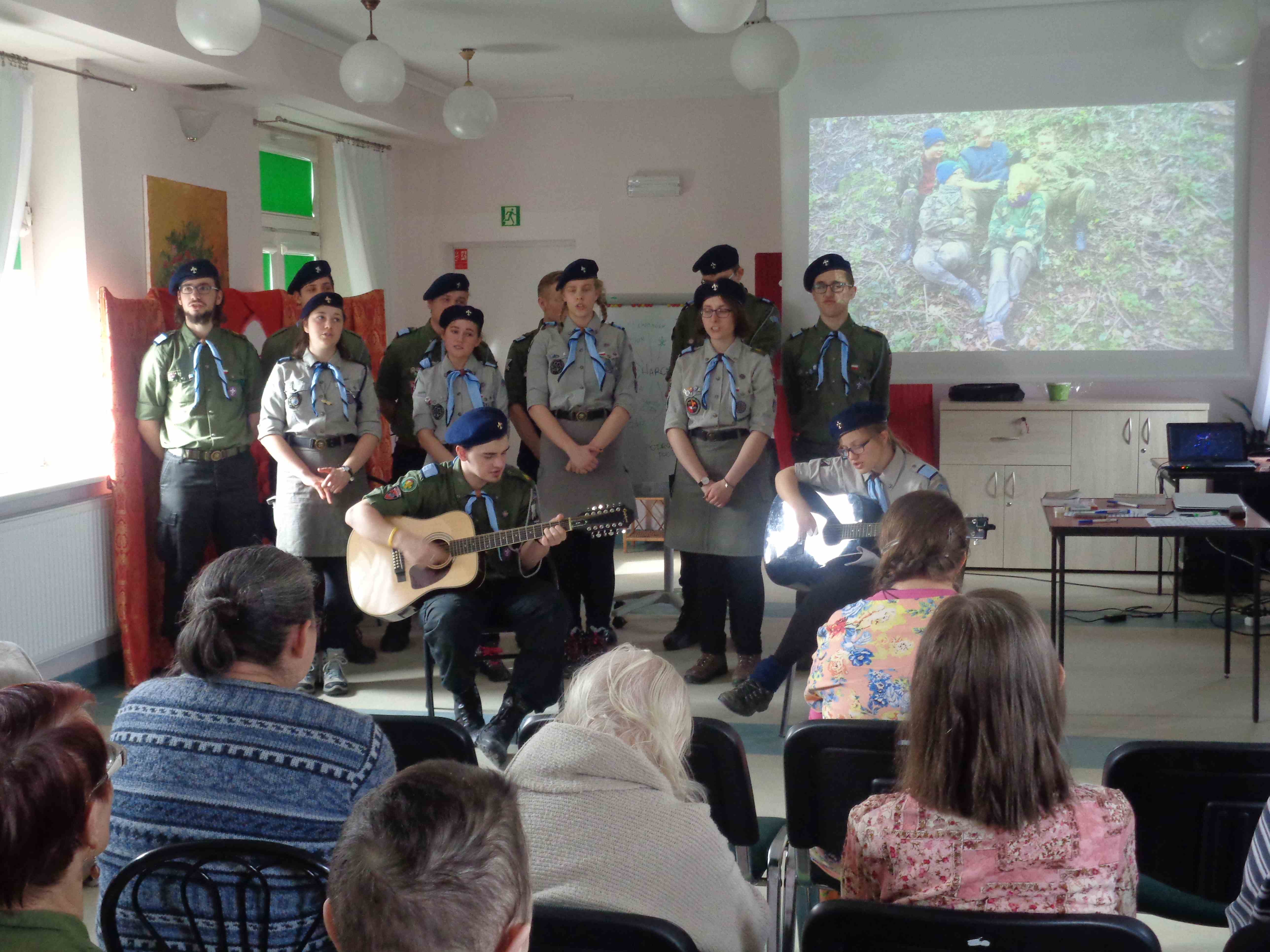 Serdecznie dziękujemy Drużynie Wędrowniczej z Poznania za spędzenie całego dnia razem z nami! Harcerze przygotowali dla mieszkanek nietypowy klub podróżnika – pokazali zdjęcia i opowiedzieli o swoim rodzinnym mieście. Przedstawili nam również zwyczaje i piosenki harcerskie. Po obiedzie odwiedzali panie w pokojach, czas upłynął na rozmowach i wspólnym śpiewaniu. To bardzo ważna i miła dla nas wizyta, dziękujemy i raz jeszcze życzymy młodym harcerzom zapału w realizacji podobnych inicjatyw!