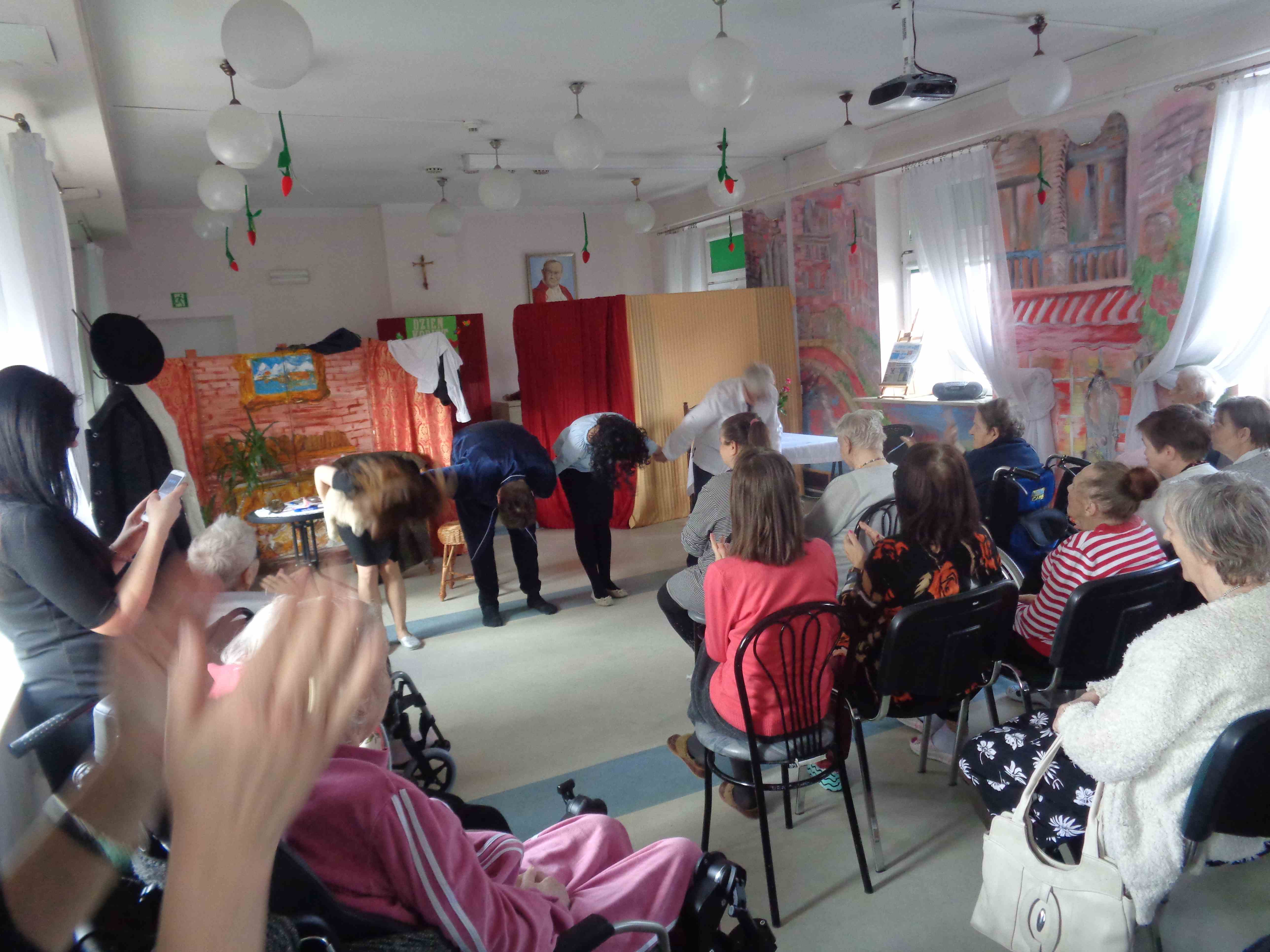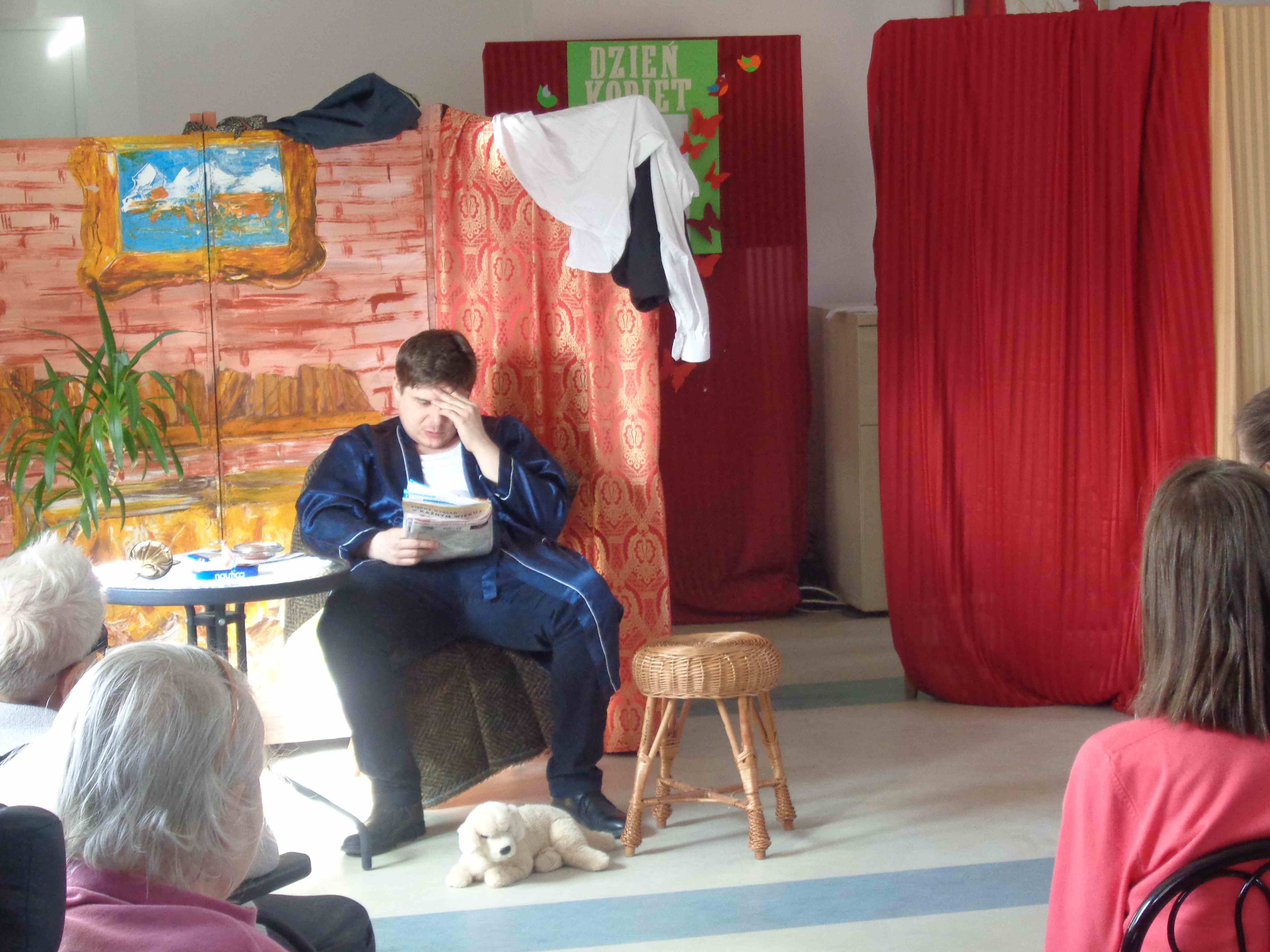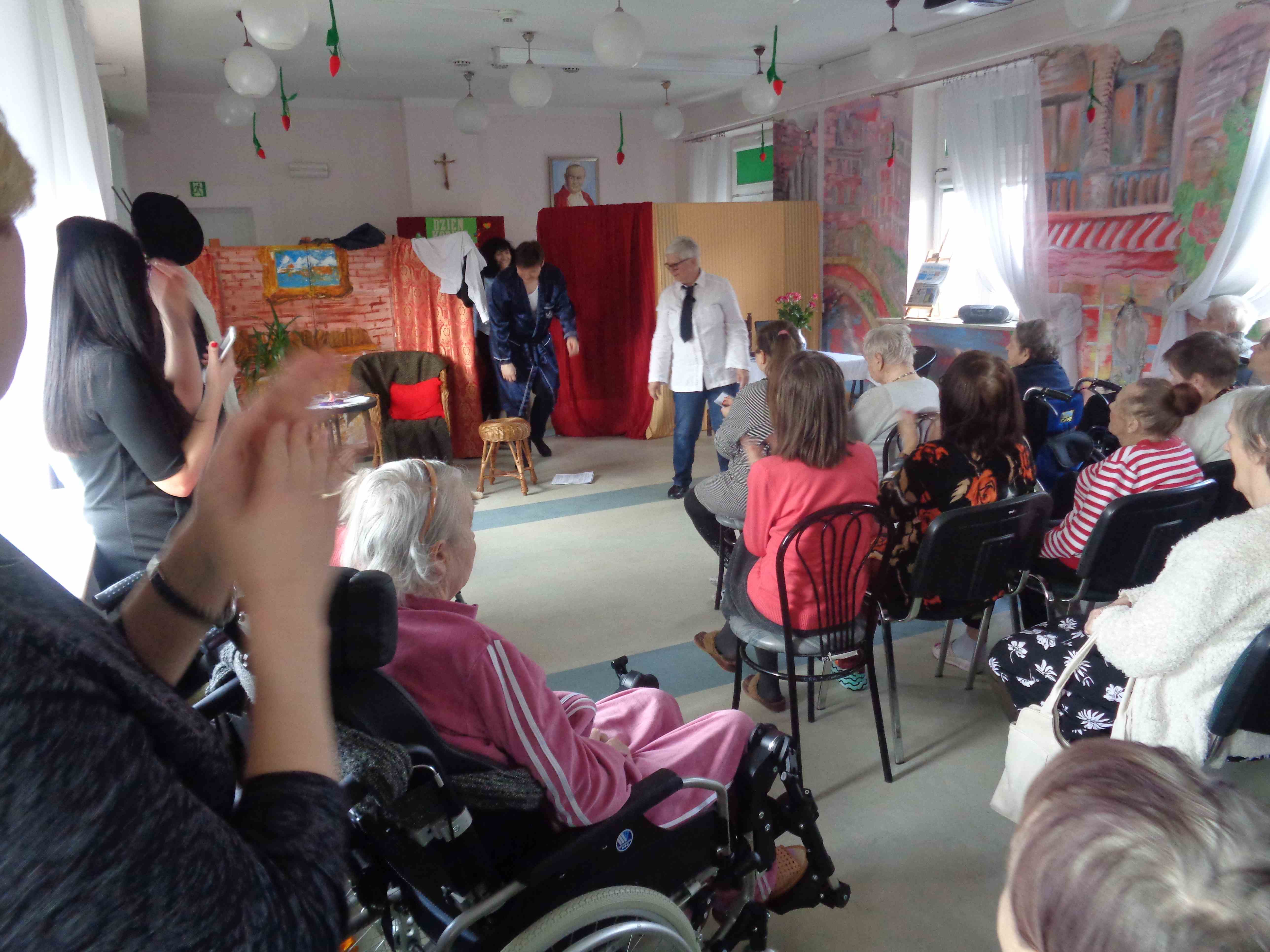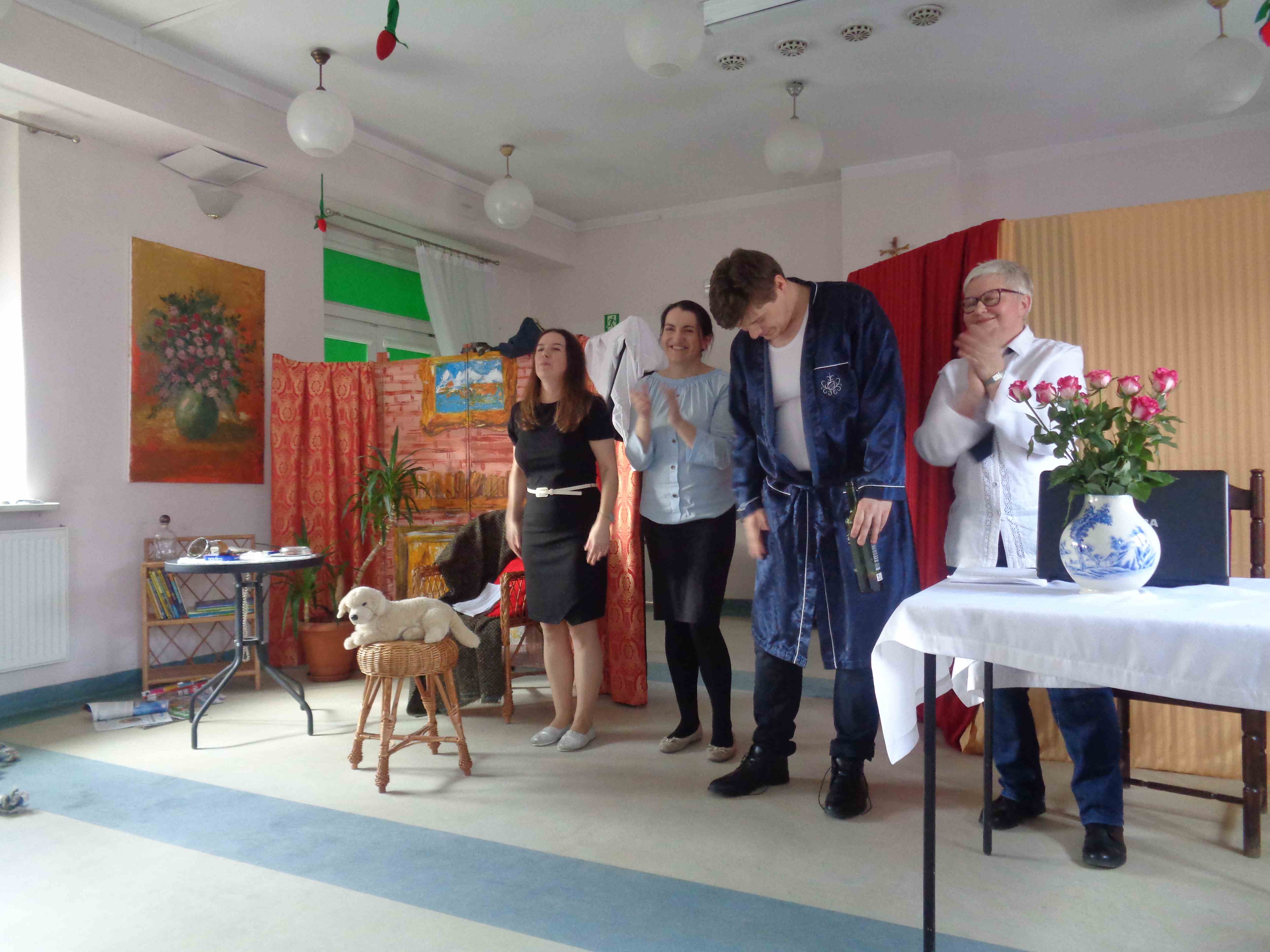 Pracownicy działu socjalno-terapeutycznego przygotowali dla naszych mieszkanek wyjątkową niespodziankę z okazji Dnia Kobiet. Zwykle to Grupa Teatralna „Albercik” bawi i wzrusza naszych domowników, dziś tę rolę przyjęli na siebie pracownicy! Terapeuci, psycholog i pracownik socjalny przygotowali wspólnie całe widowisko – scenariusz, scenografię i stroje oraz oczywiście najważniejsze – występ na scenie.