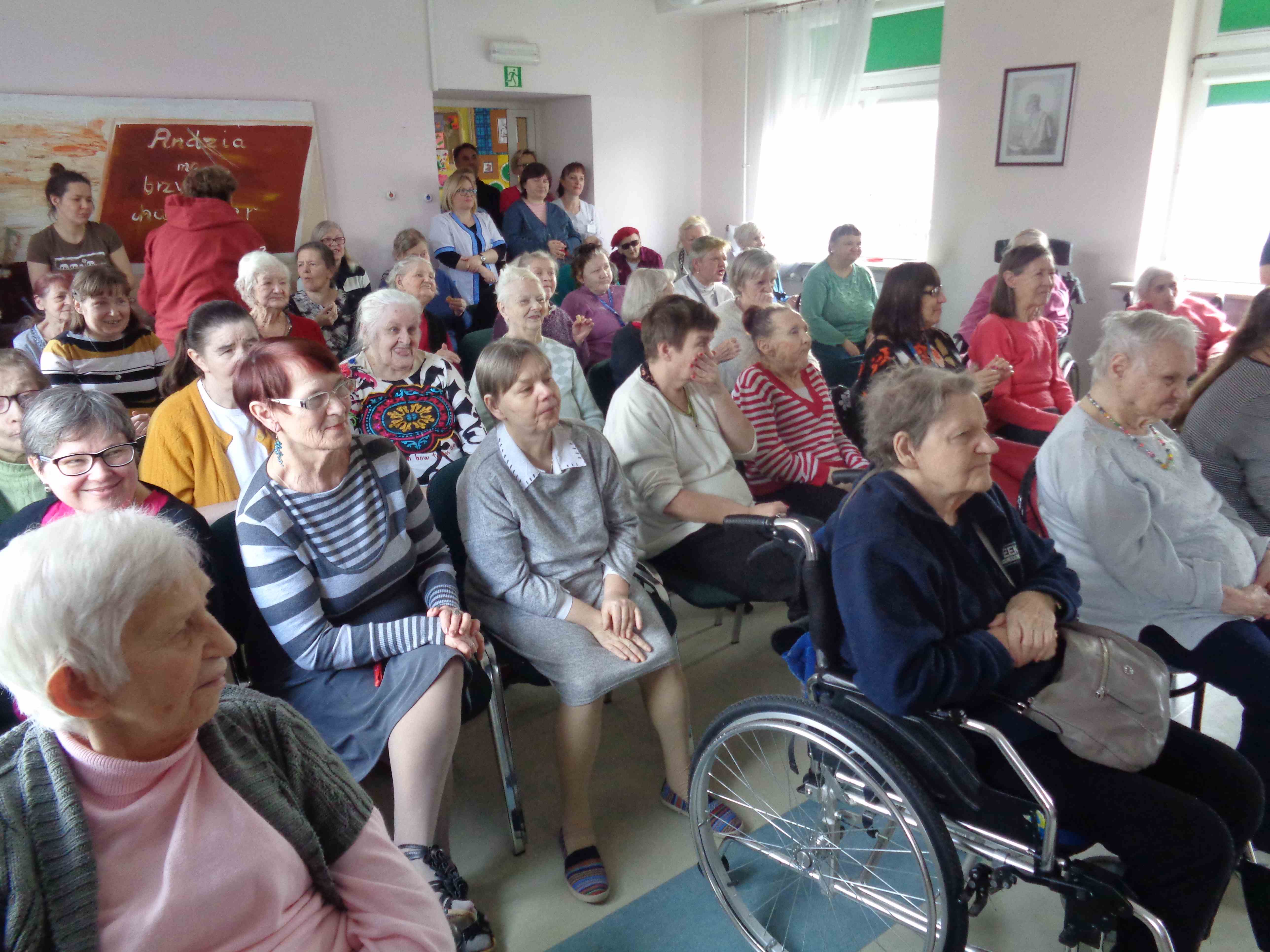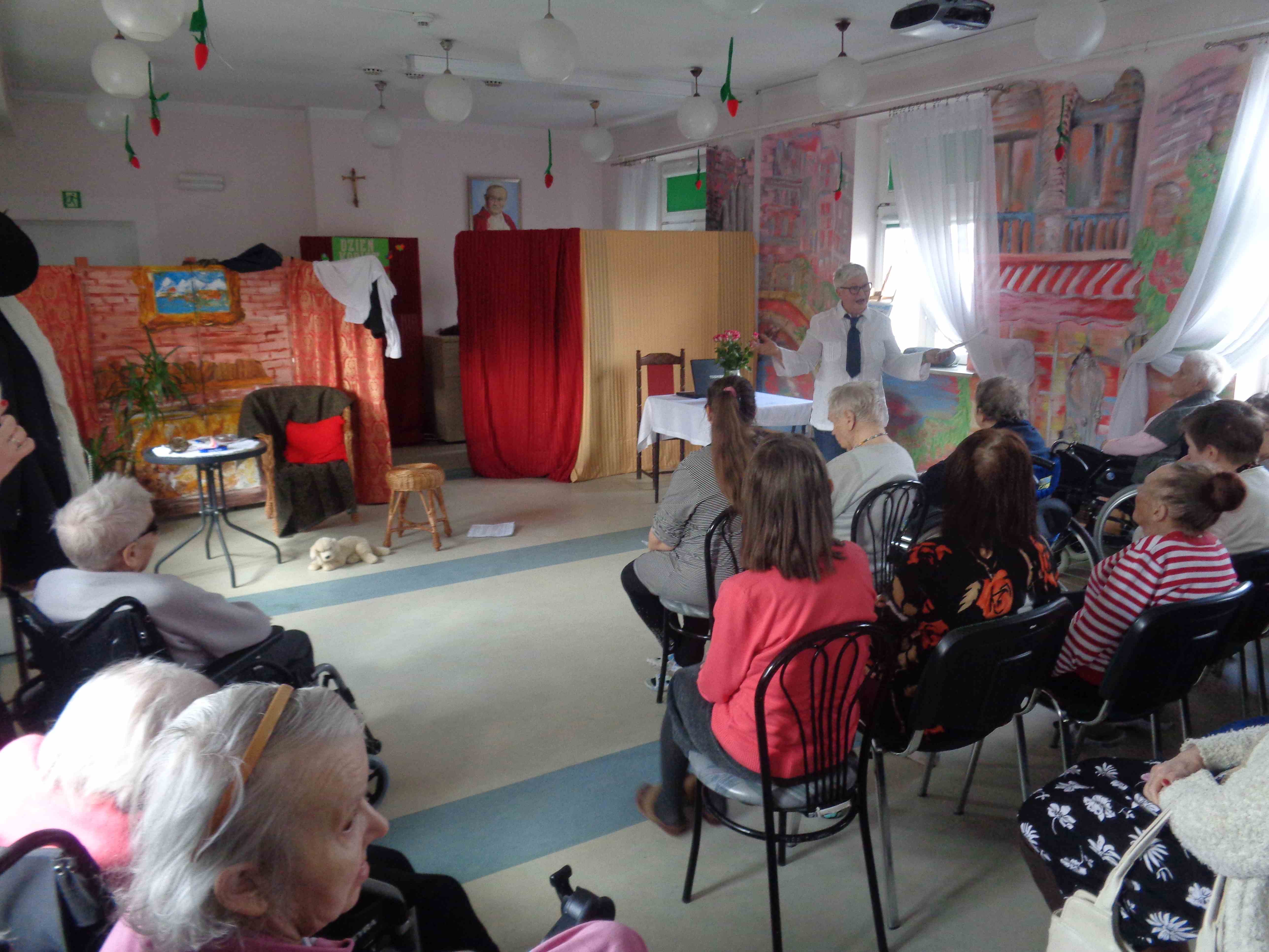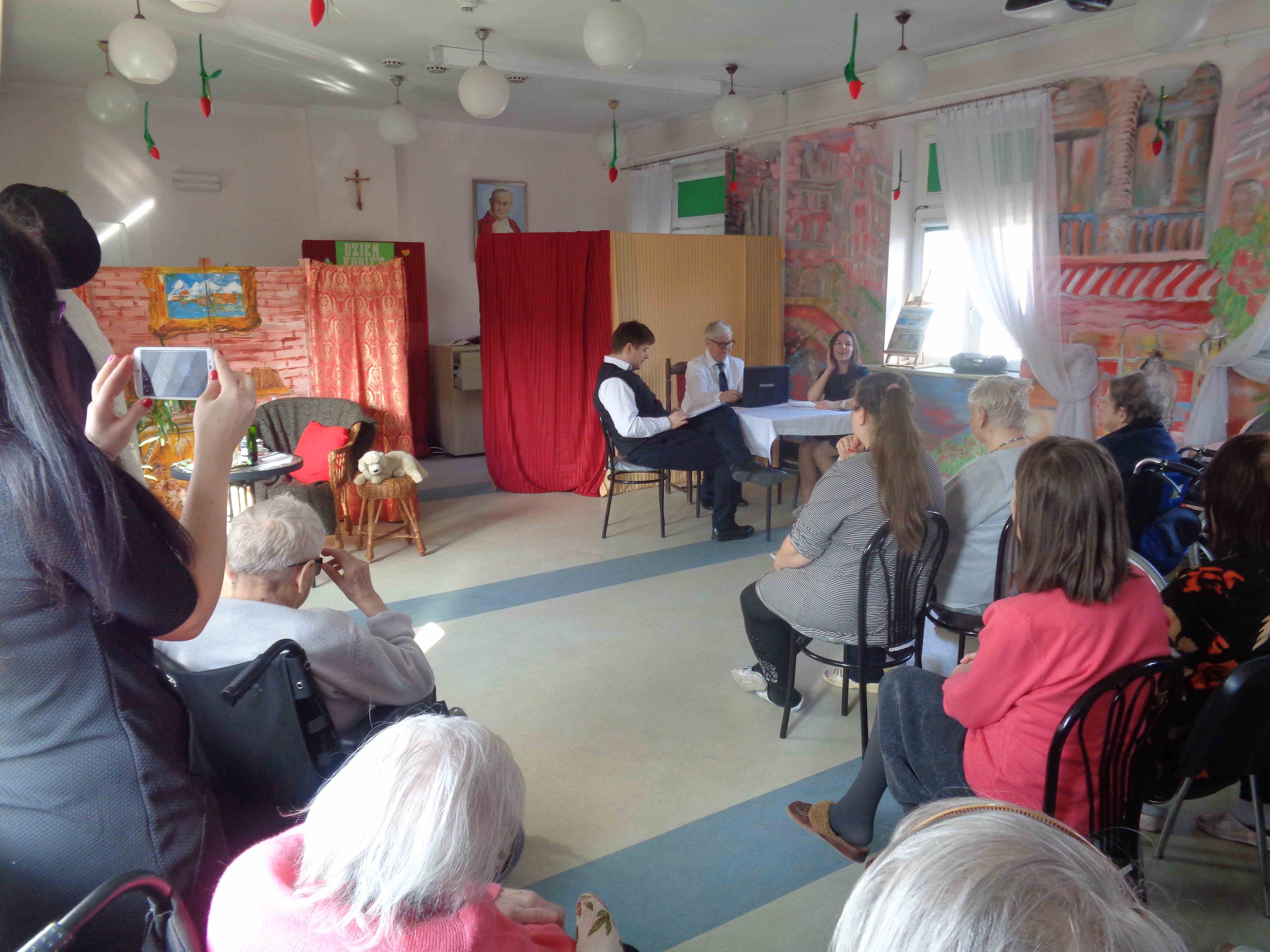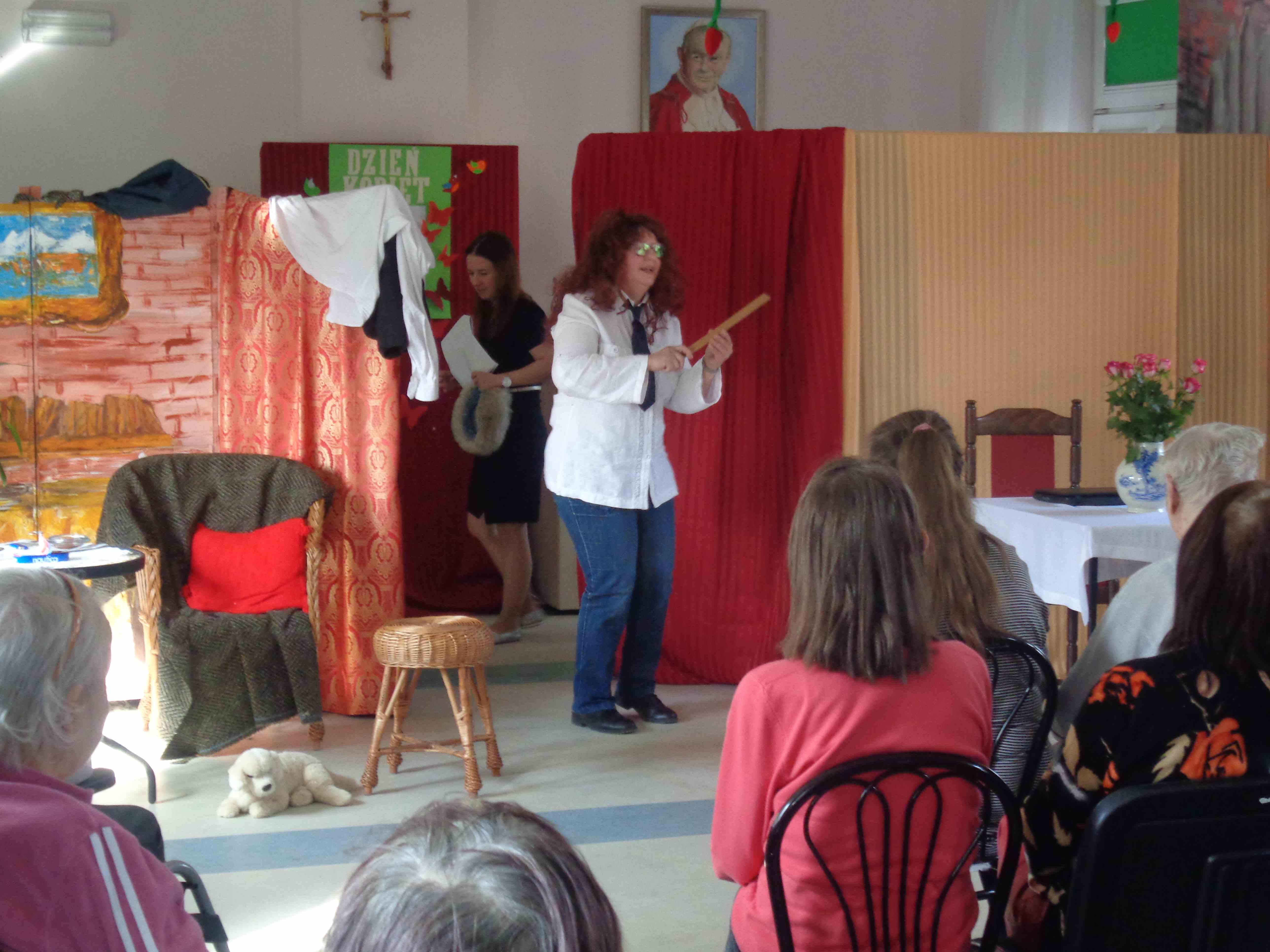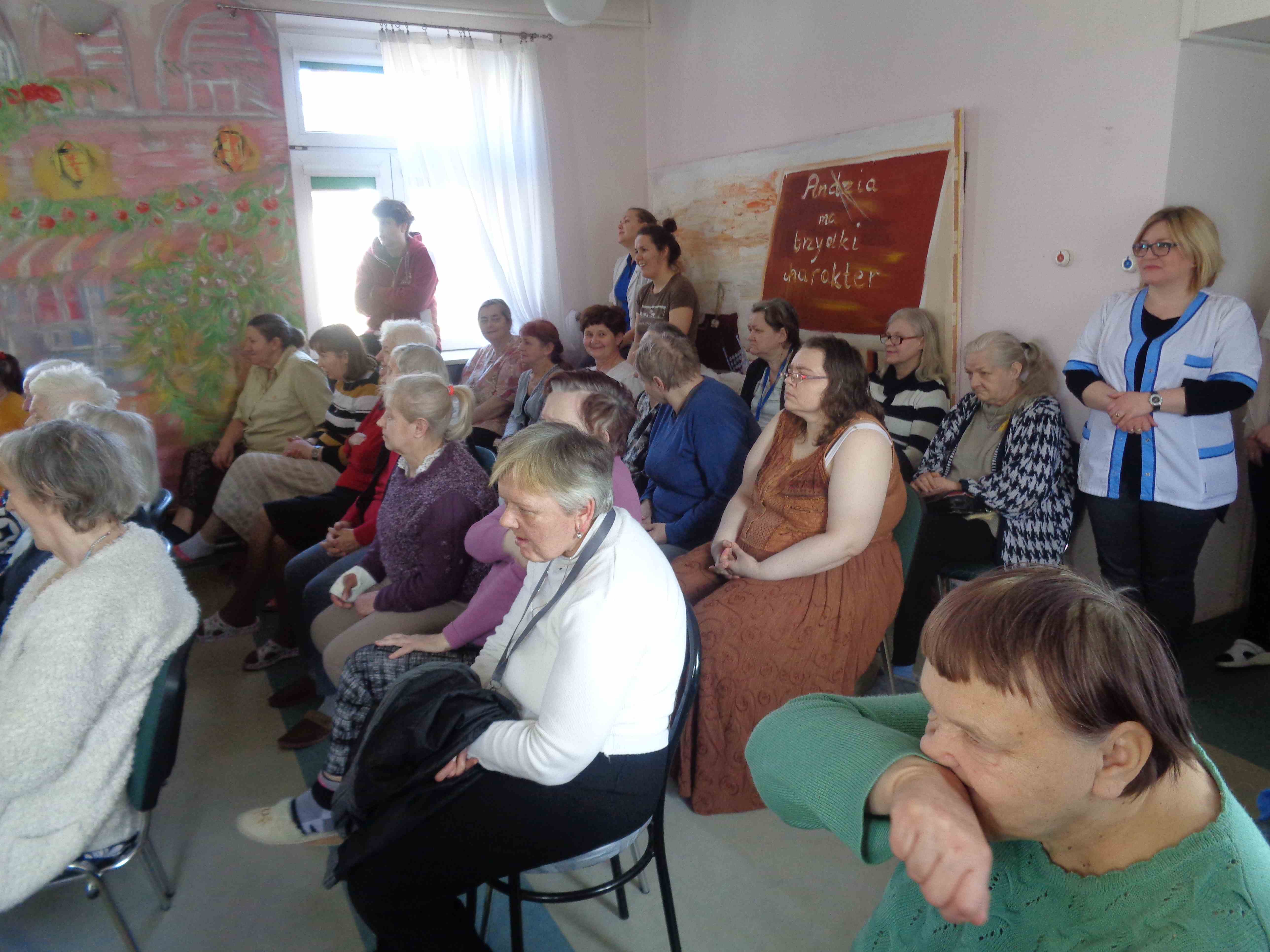 Pracownicy działu socjalno-terapeutycznego przygotowali dla naszych mieszkanek wyjątkową niespodziankę z okazji Dnia Kobiet. Zwykle to Grupa Teatralna „Albercik” bawi i wzrusza naszych domowników, dziś tę rolę przyjęli na siebie pracownicy! Terapeuci, psycholog i pracownik socjalny przygotowali wspólnie całe widowisko – scenariusz, scenografię i stroje oraz oczywiście najważniejsze – występ na scenie.