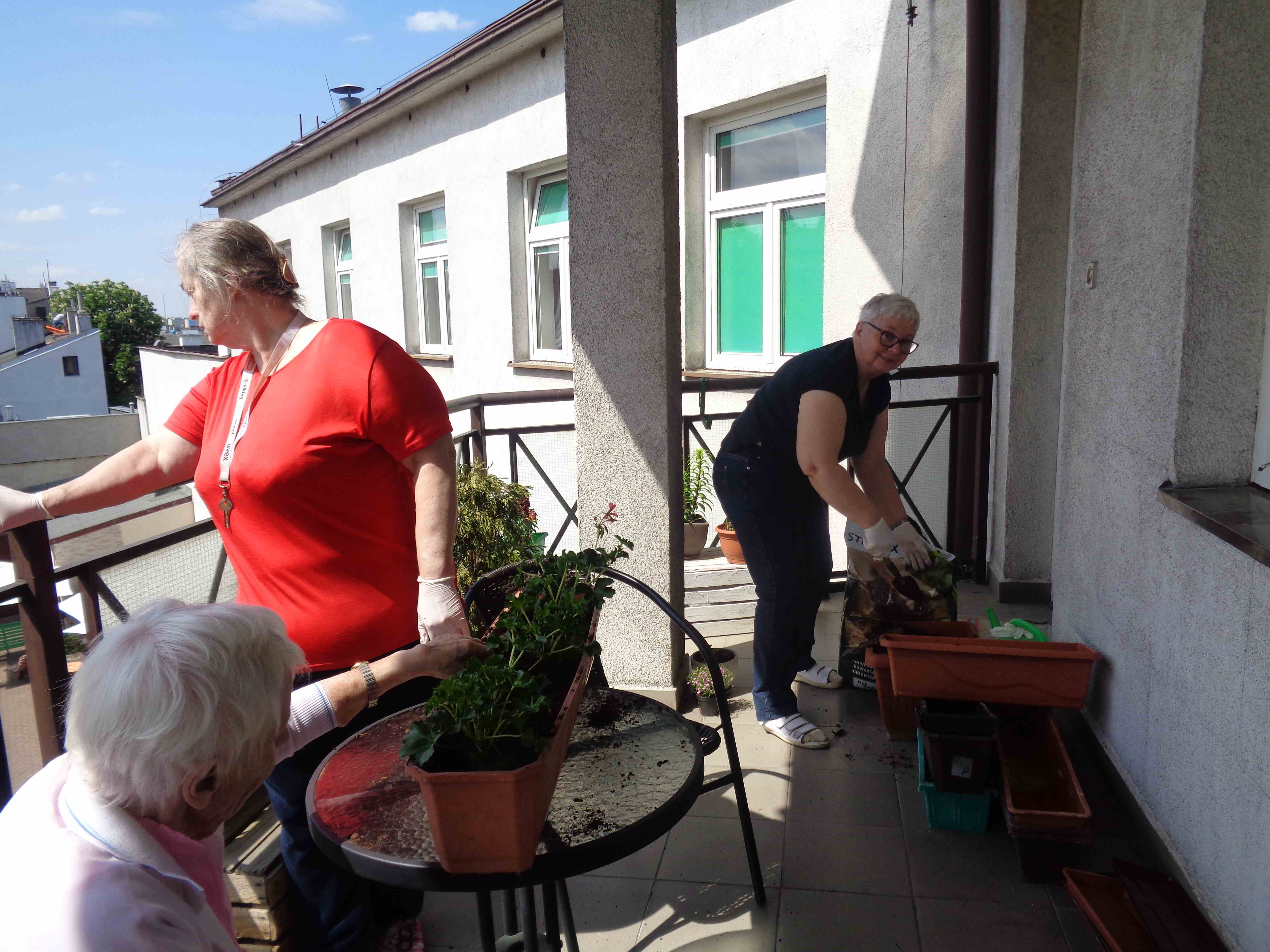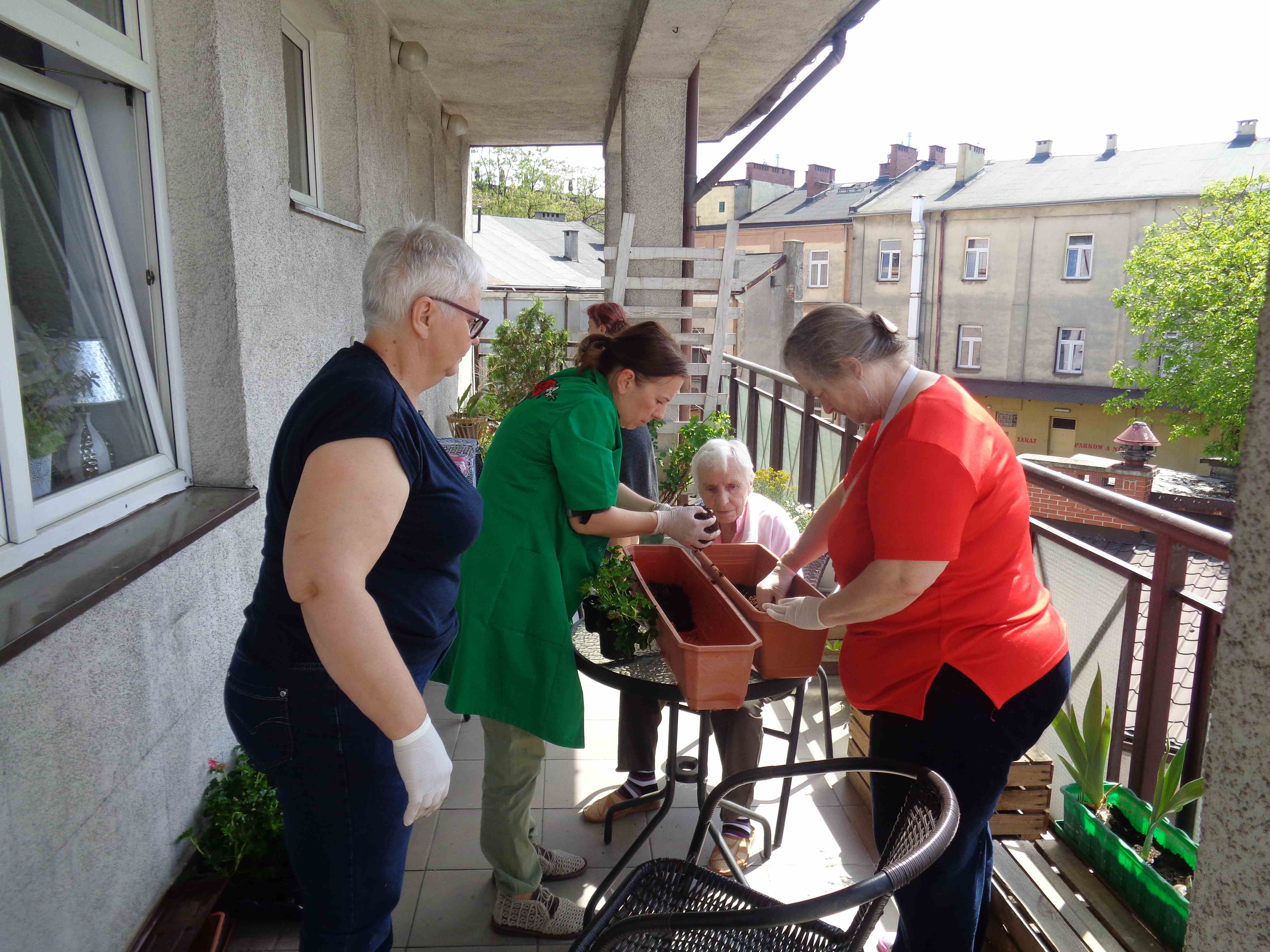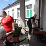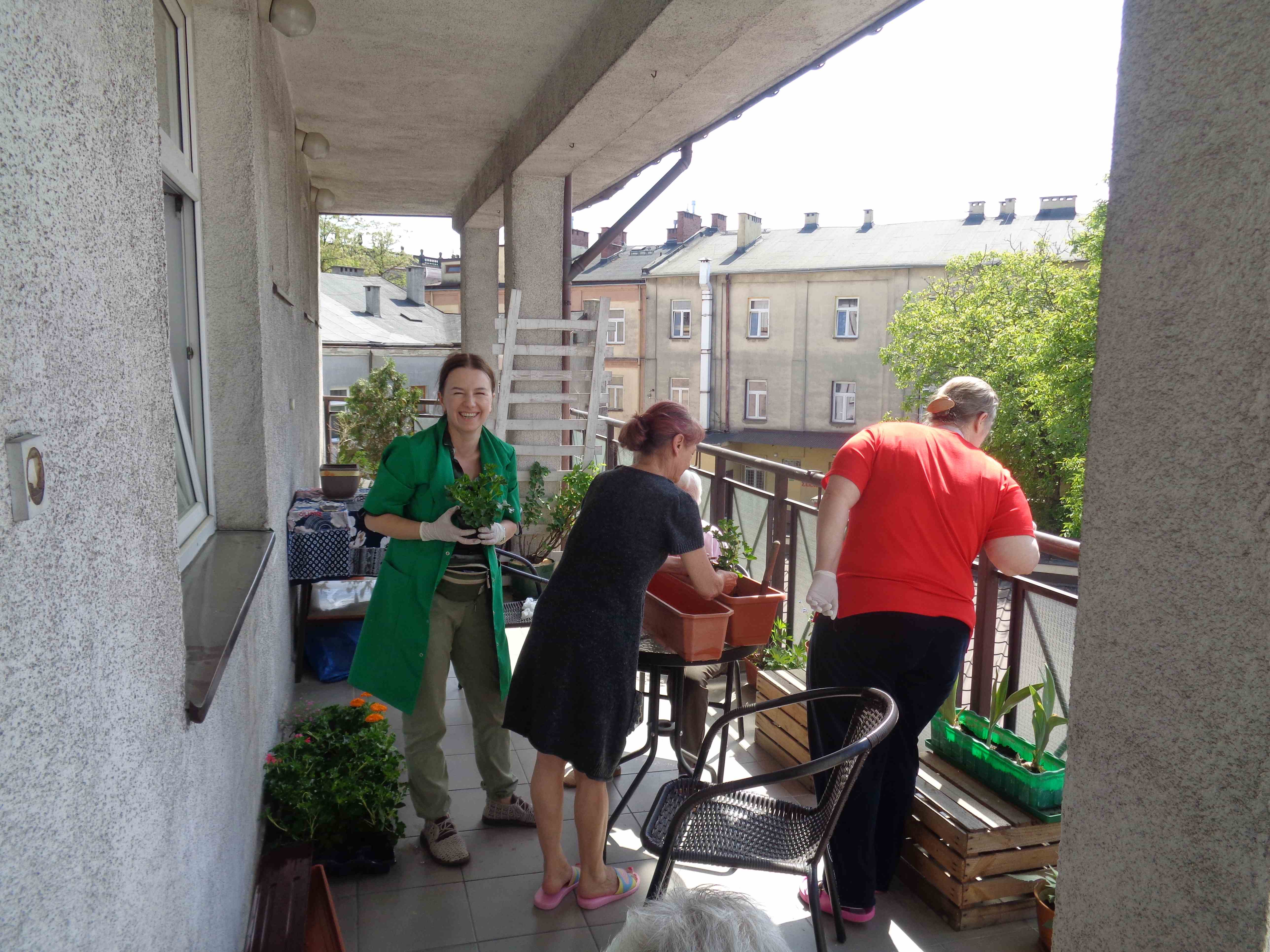 Ciepłe majowe przedpołudnia spędzamy na tarasie przy sali terapii zajęciowej, mieszkanki biorą udział w różnych zajęciach, m.in. sadzą i pielęgnują rośliny.