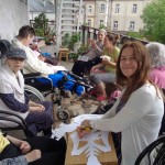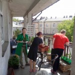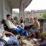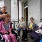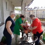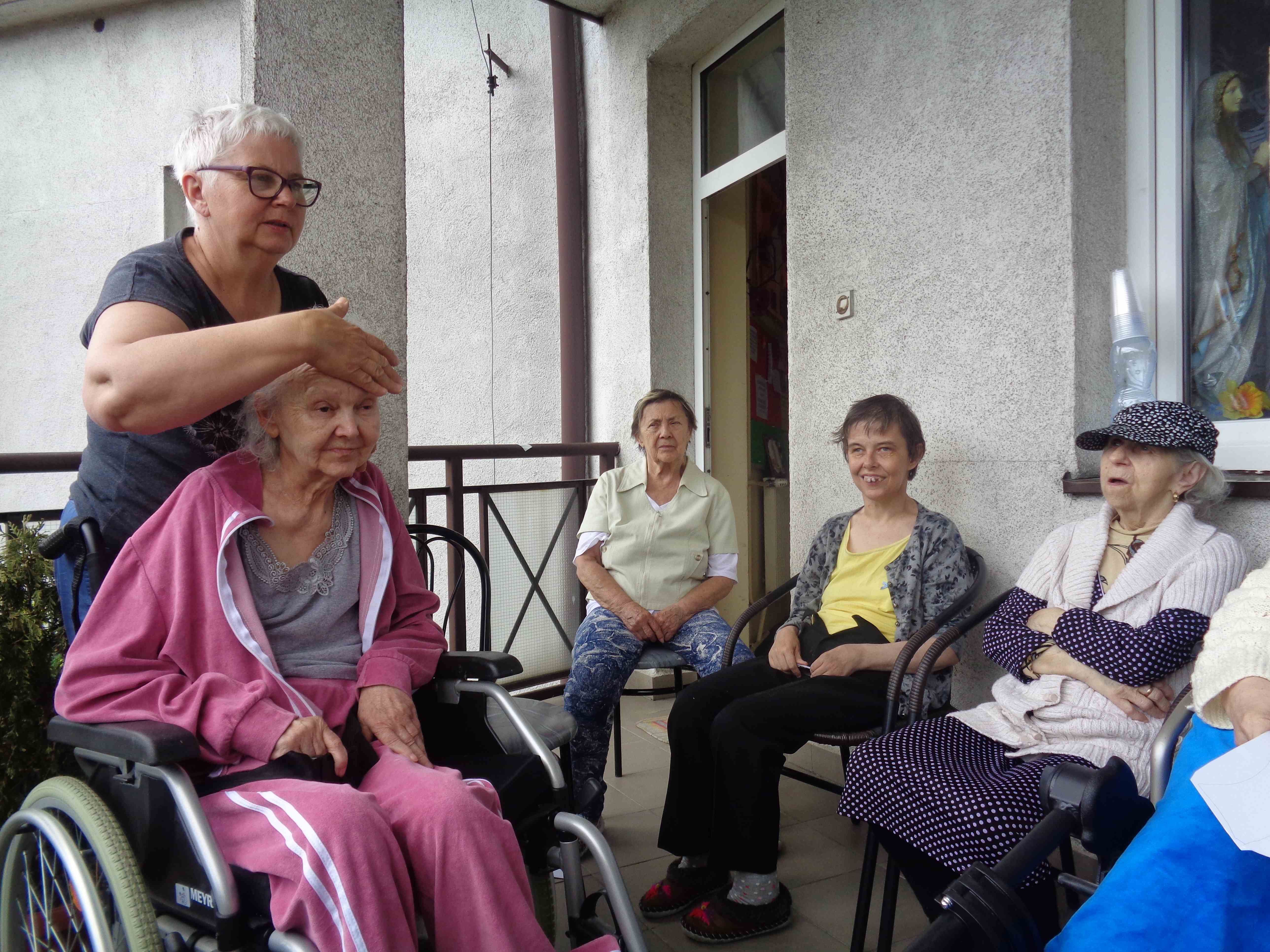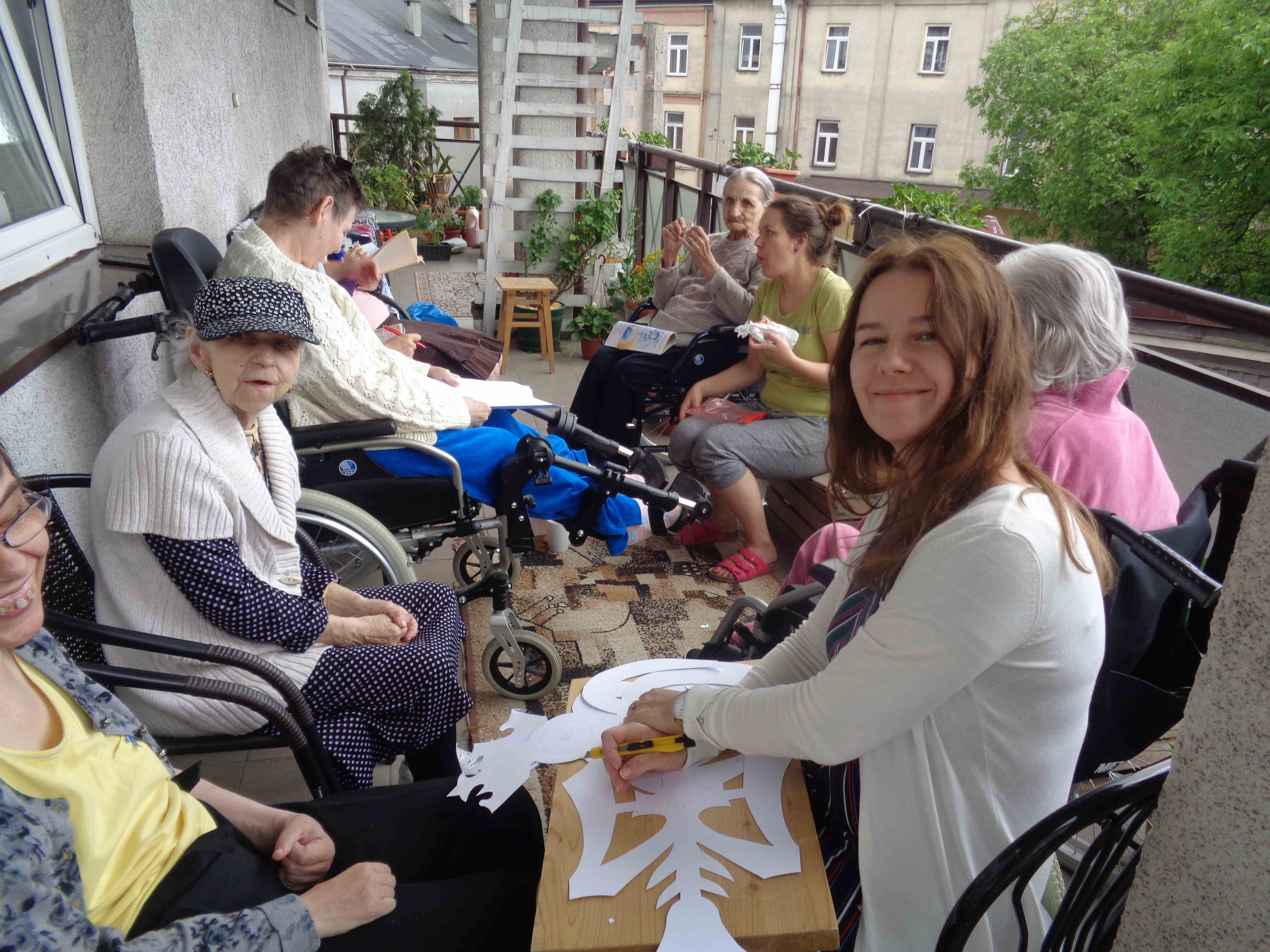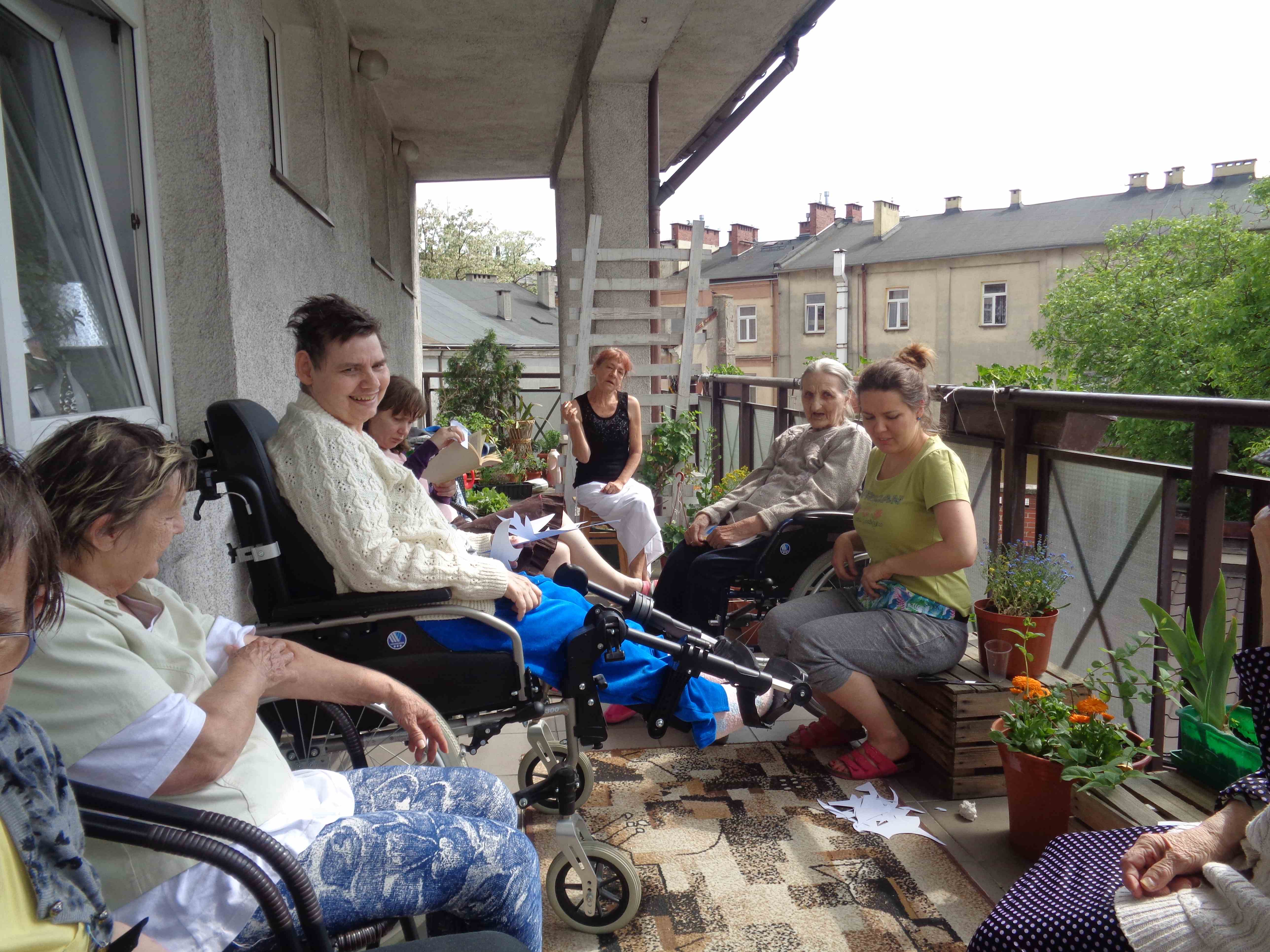 Ciepłe majowe przedpołudnia spędzamy na tarasie przy sali terapii zajęciowej, mieszkanki biorą udział w różnych zajęciach, m.in. sadzą i pielęgnują rośliny.